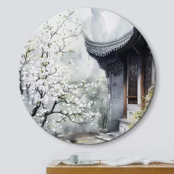 Picturi rotunde Japonia grădină cu cireș și casă, oriental, stil acuarelă Nr r44309
