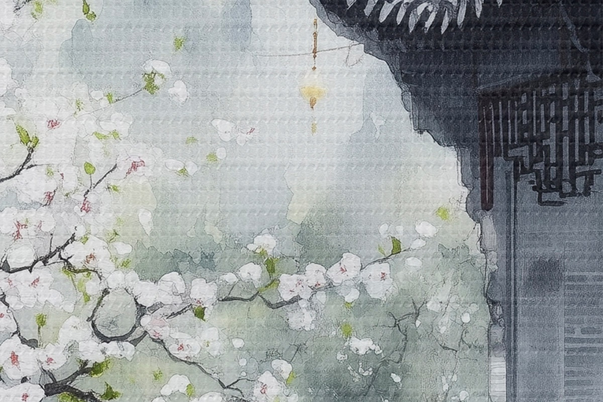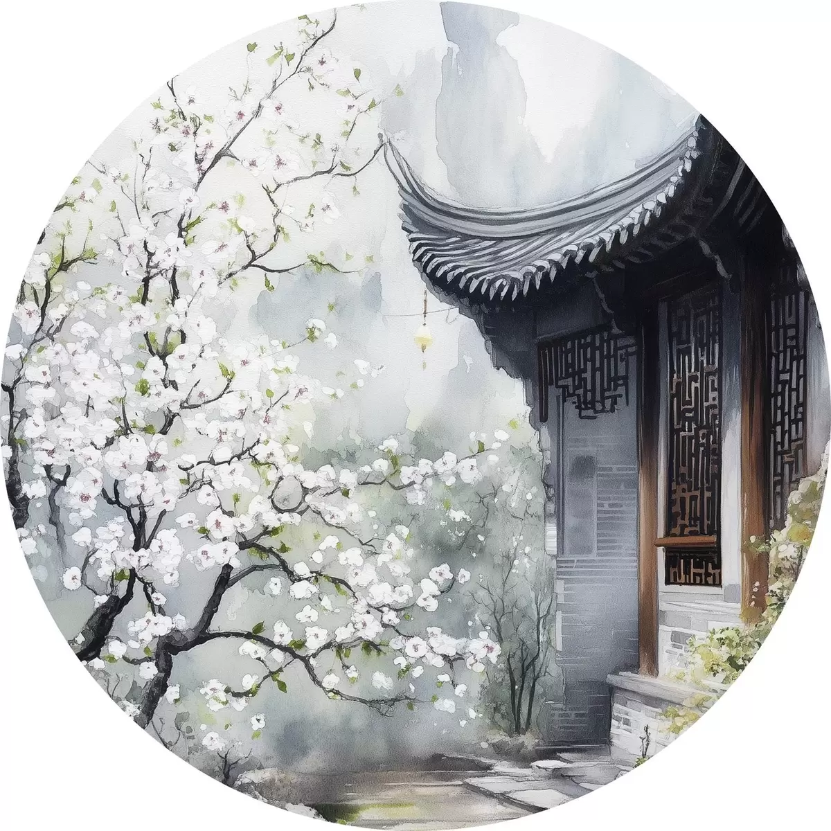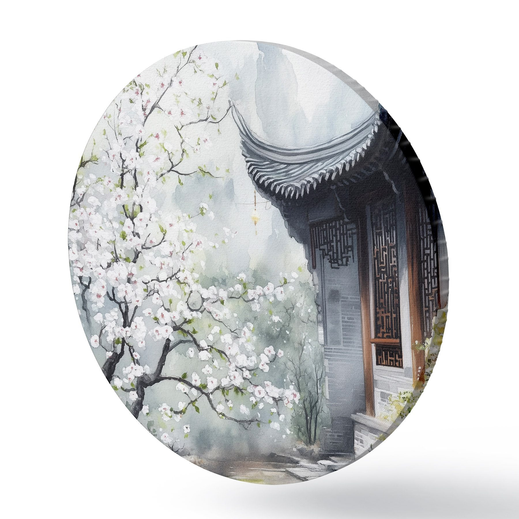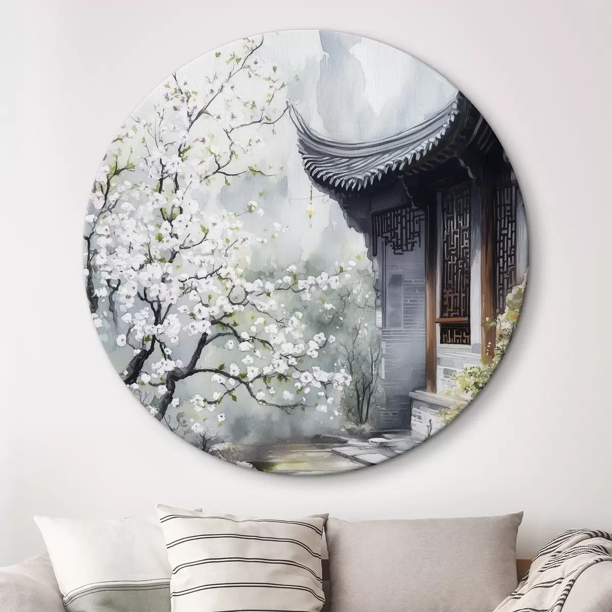 Picturi rotunde Japonia grădină cu cireș și casă, oriental, stil acuarelă Nr r44309