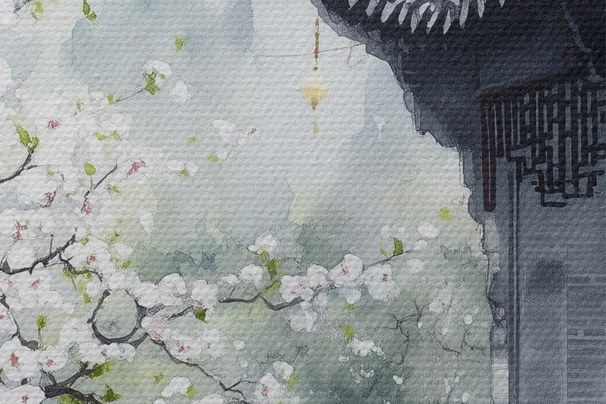 Picturi rotunde Japonia grădină cu cireș și casă, oriental, stil acuarelă r44309