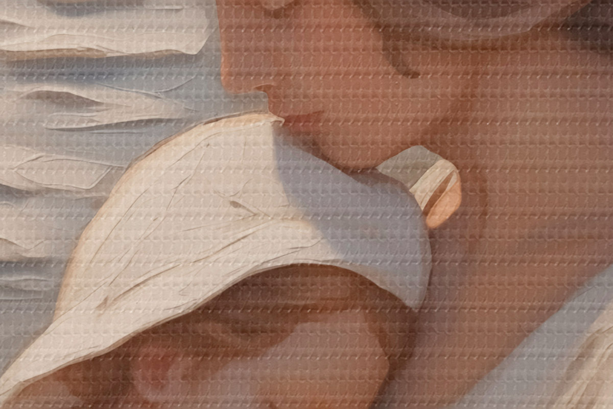 Țesătura fină a firelor de pe această pânză seamănă cu suprafața pânzelor artiștilor profesioniști.