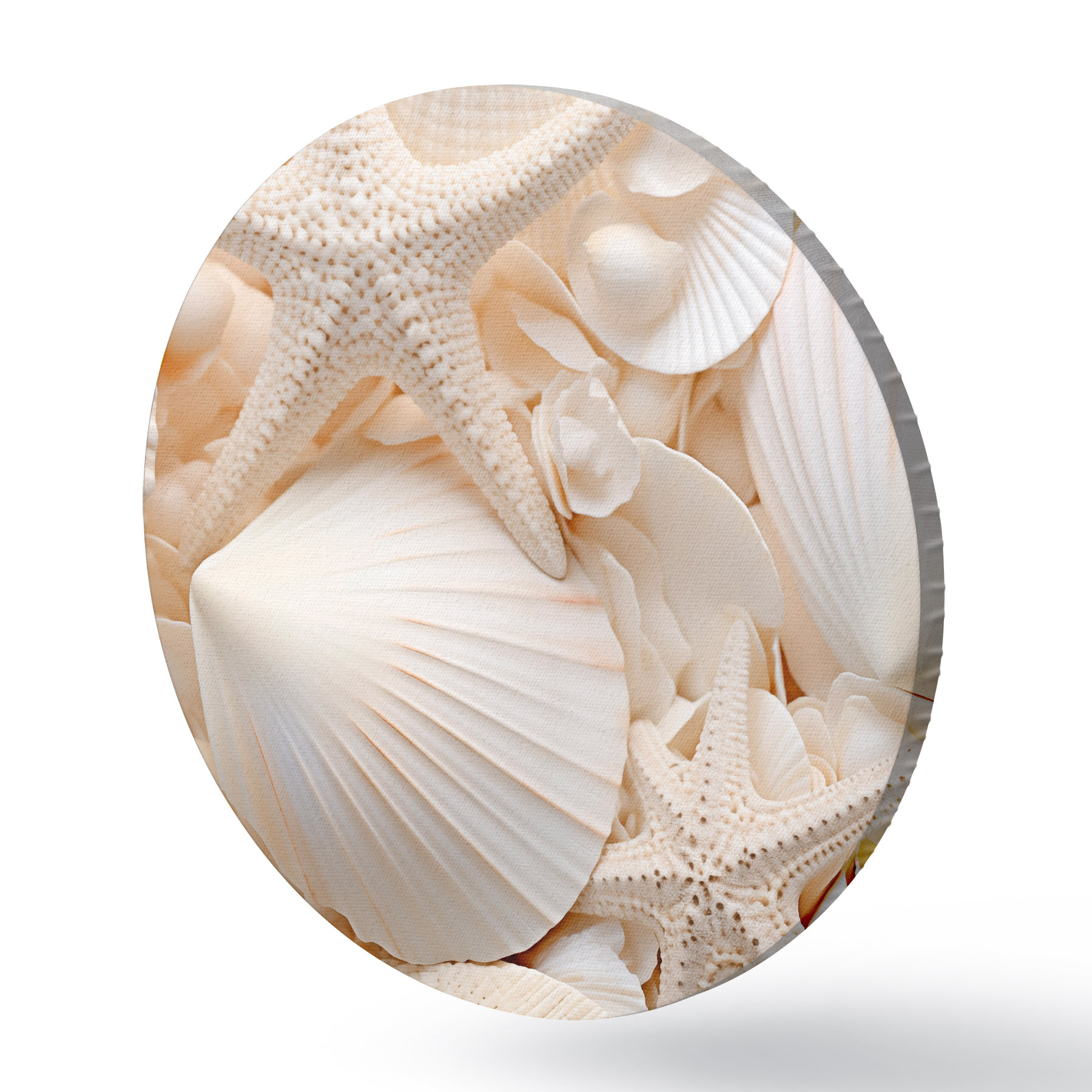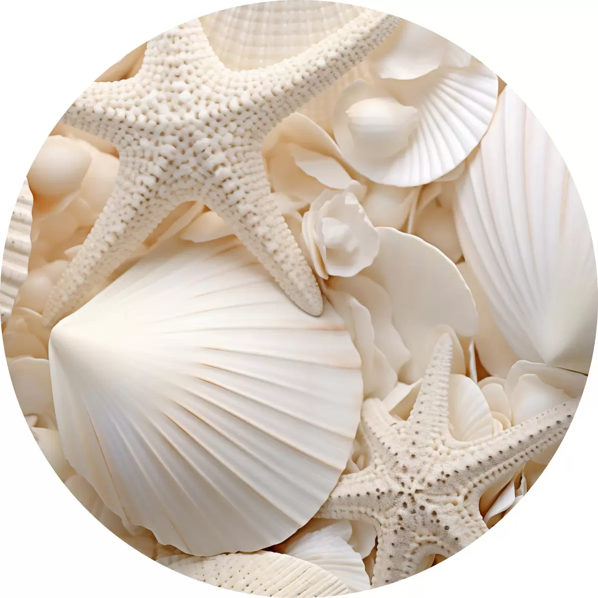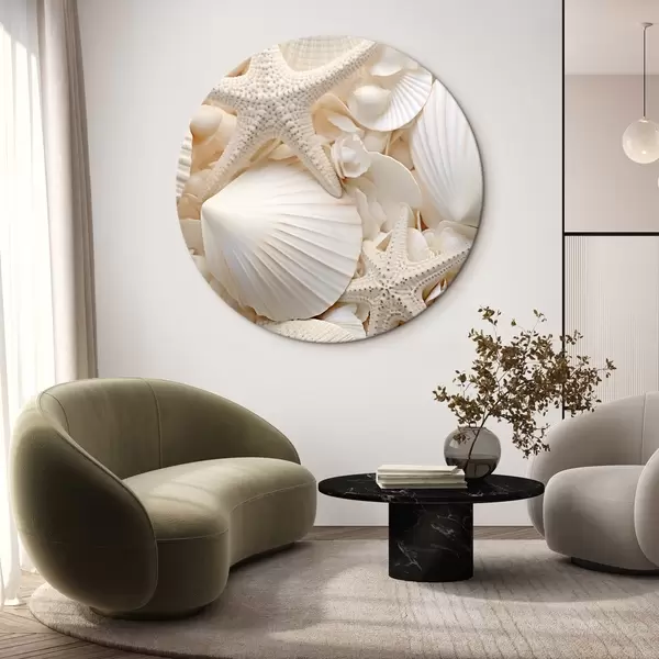 Picturi rotunde Scoici albe decorative și stele de mare, creând o compoziție monocromatică texturată Nr r44392