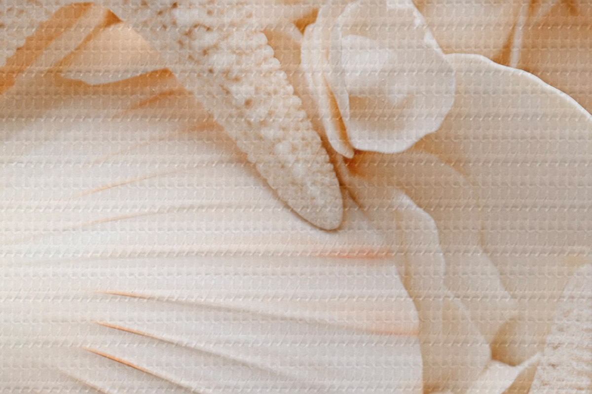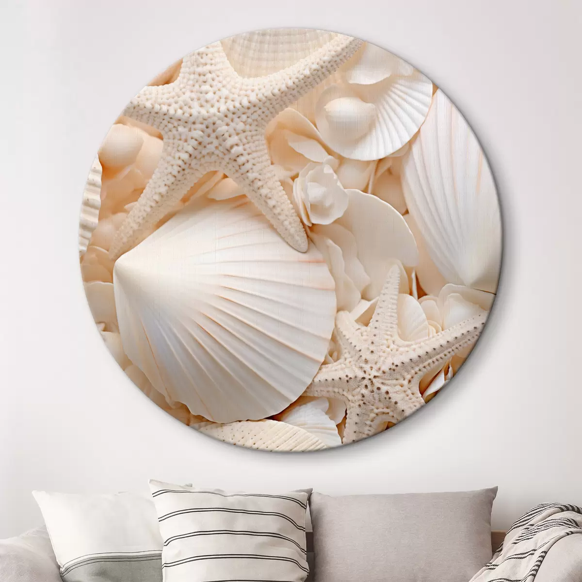 Picturi rotunde Scoici albe decorative și stele de mare, creând o compoziție monocromatică texturată r44392