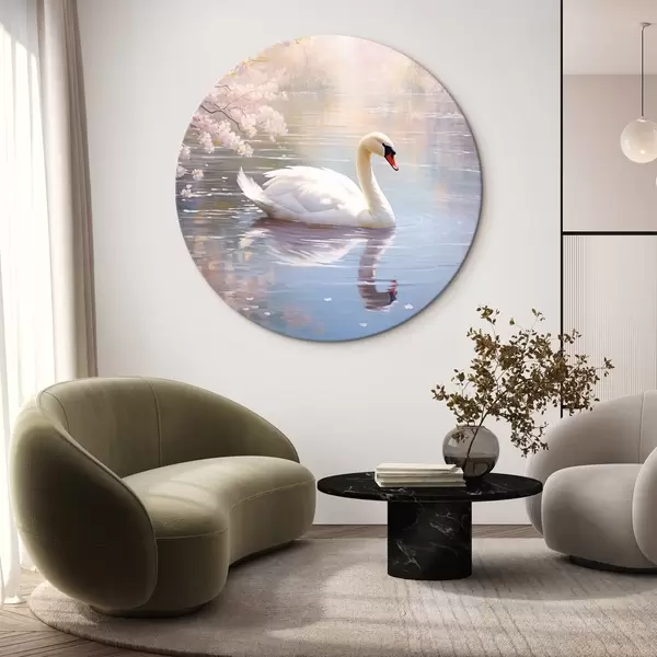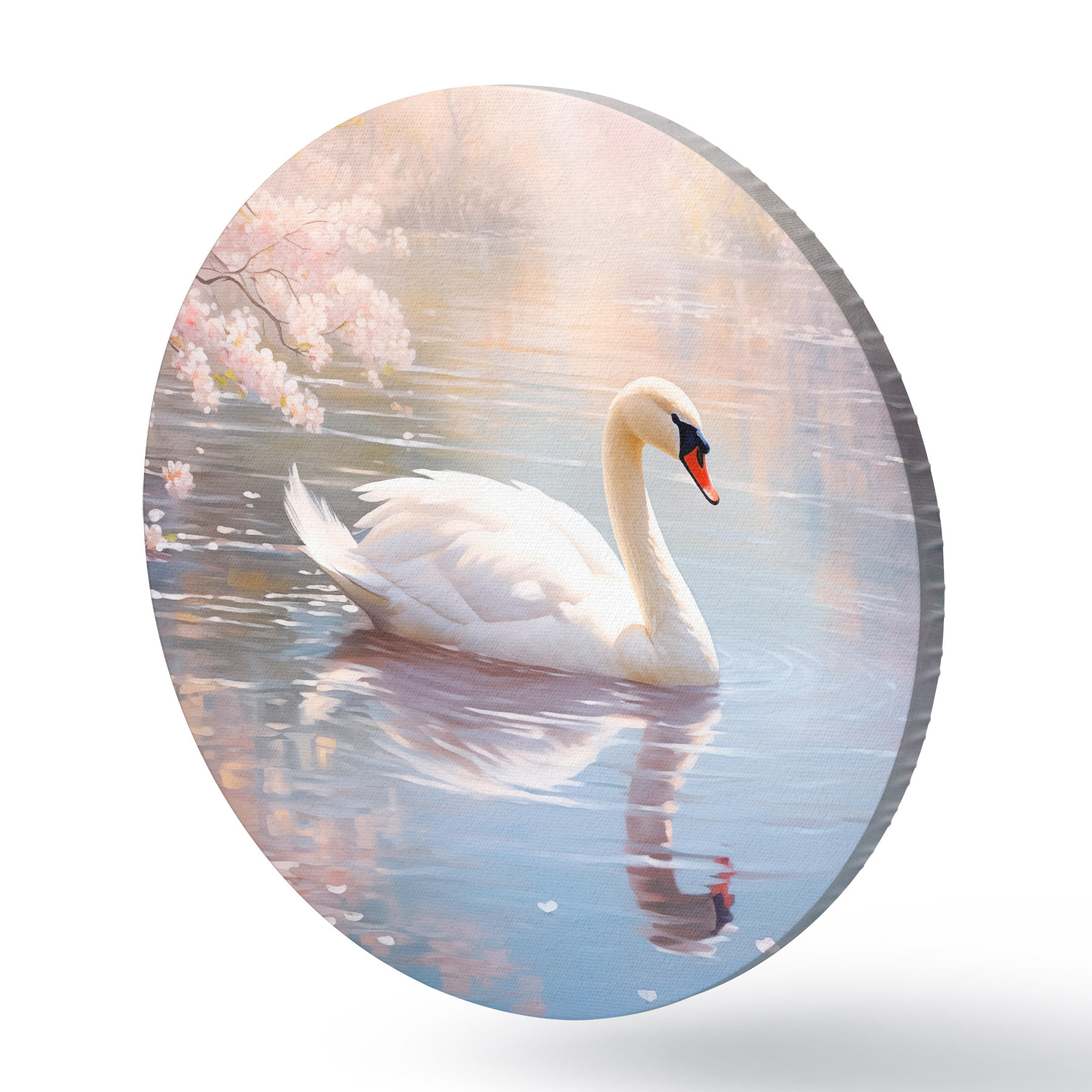 Picturi rotunde O lebădă albă înotând într-un lac cu cireși înfloriți, culori pastelate r44396