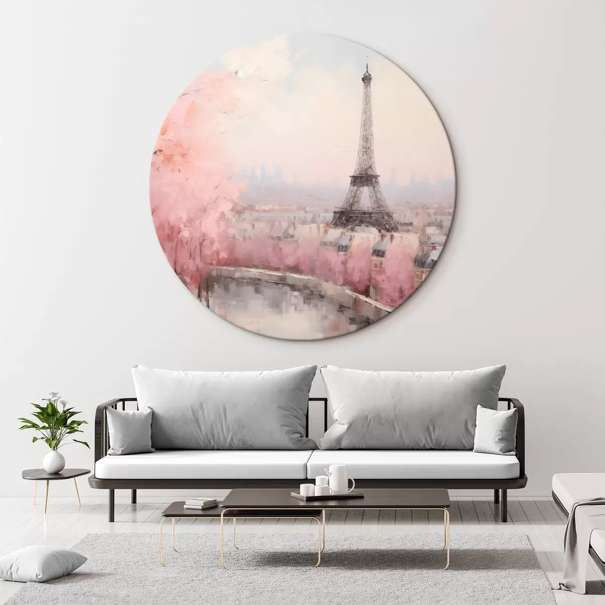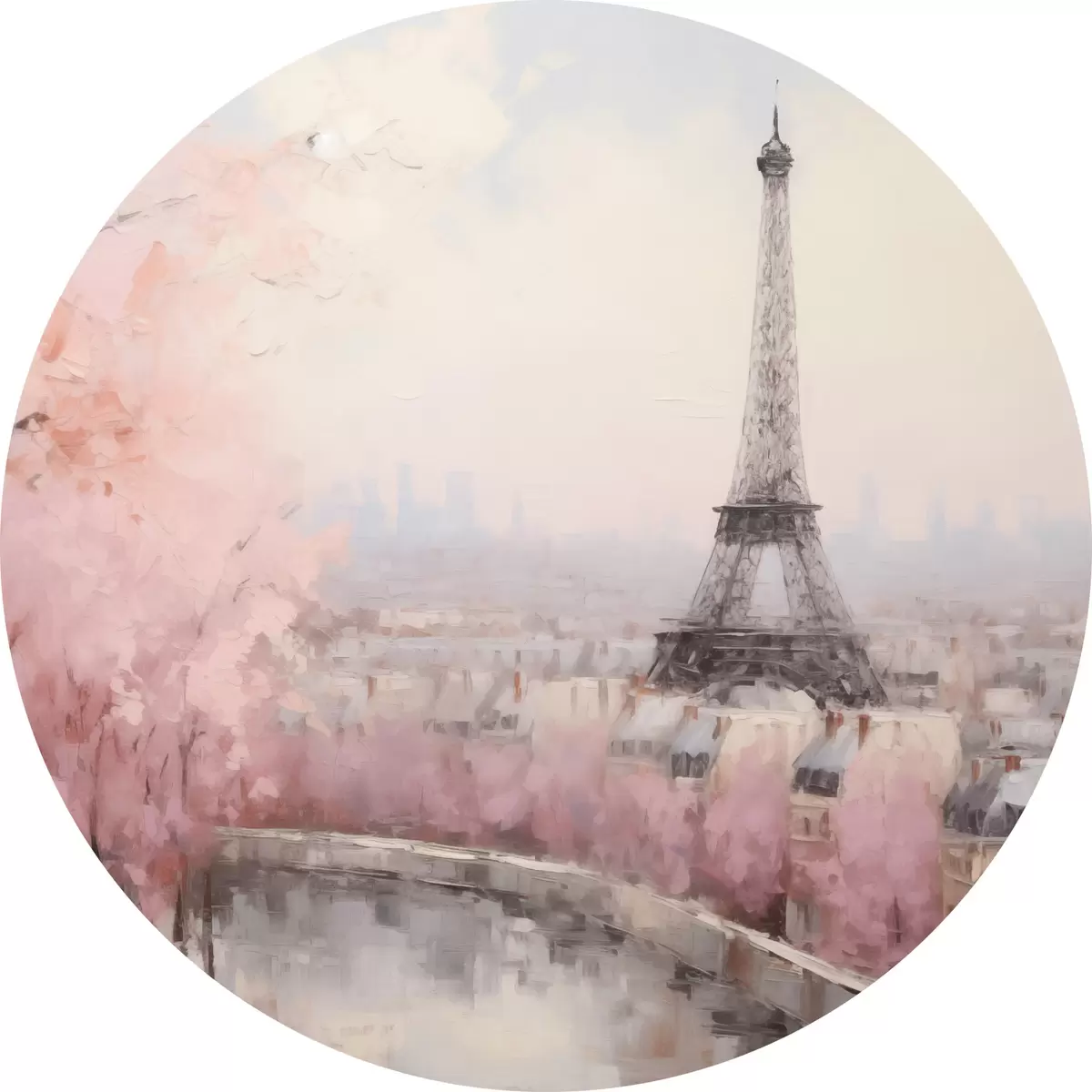 Picturi rotunde Turnul Eiffel din Paris cu cireși înfloriți primăvara, culori pastelate moi Nr r44398