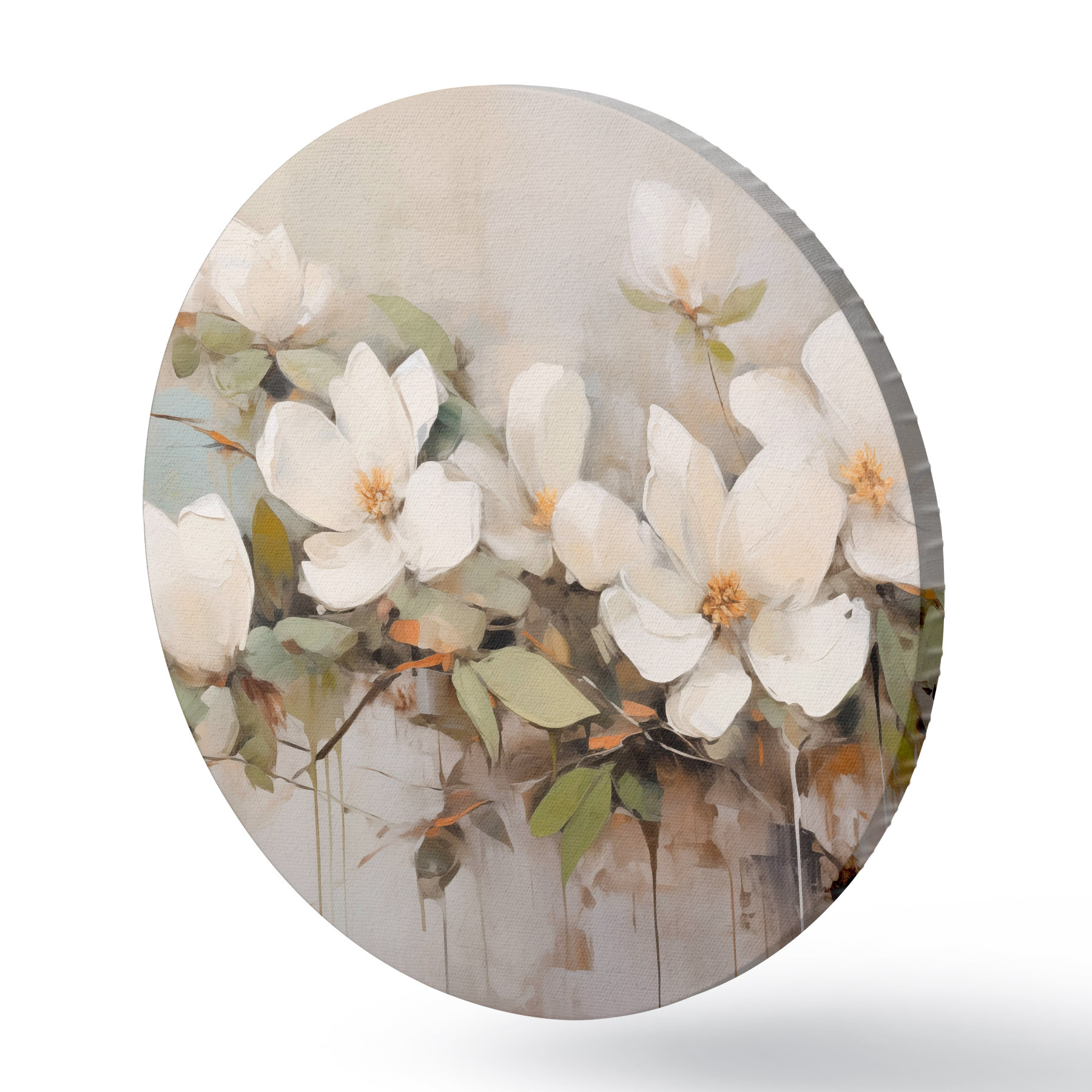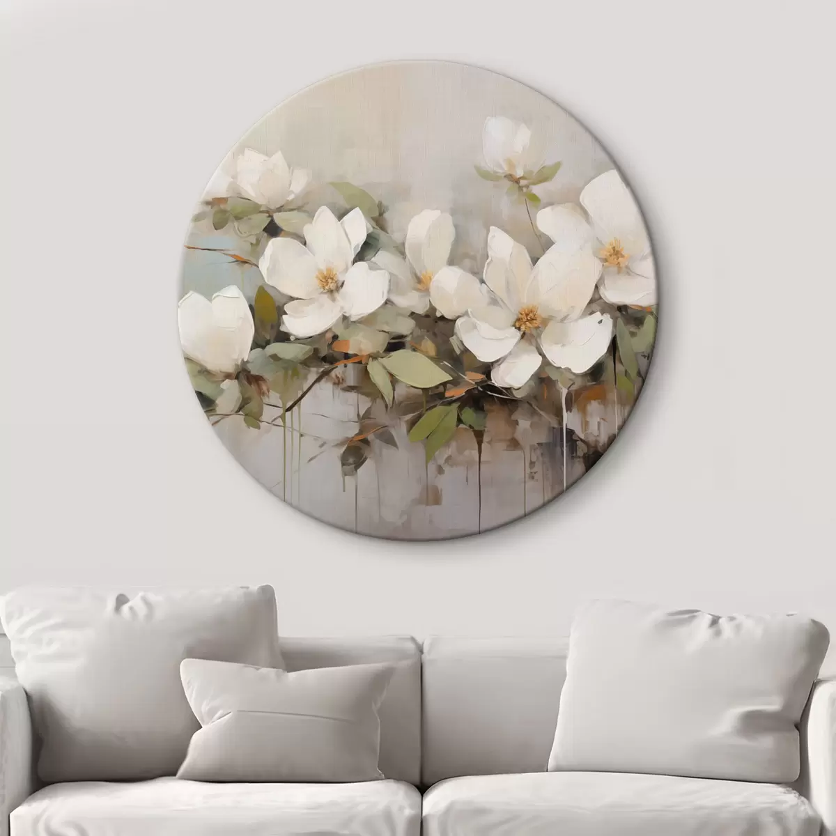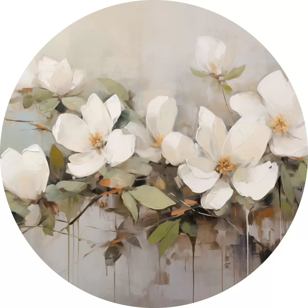 Picturi rotunde Flori albe de magnolie cu frunze verzi pe o ramură, tușe moi, culori stinse Nr r44404