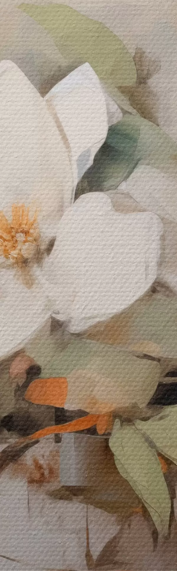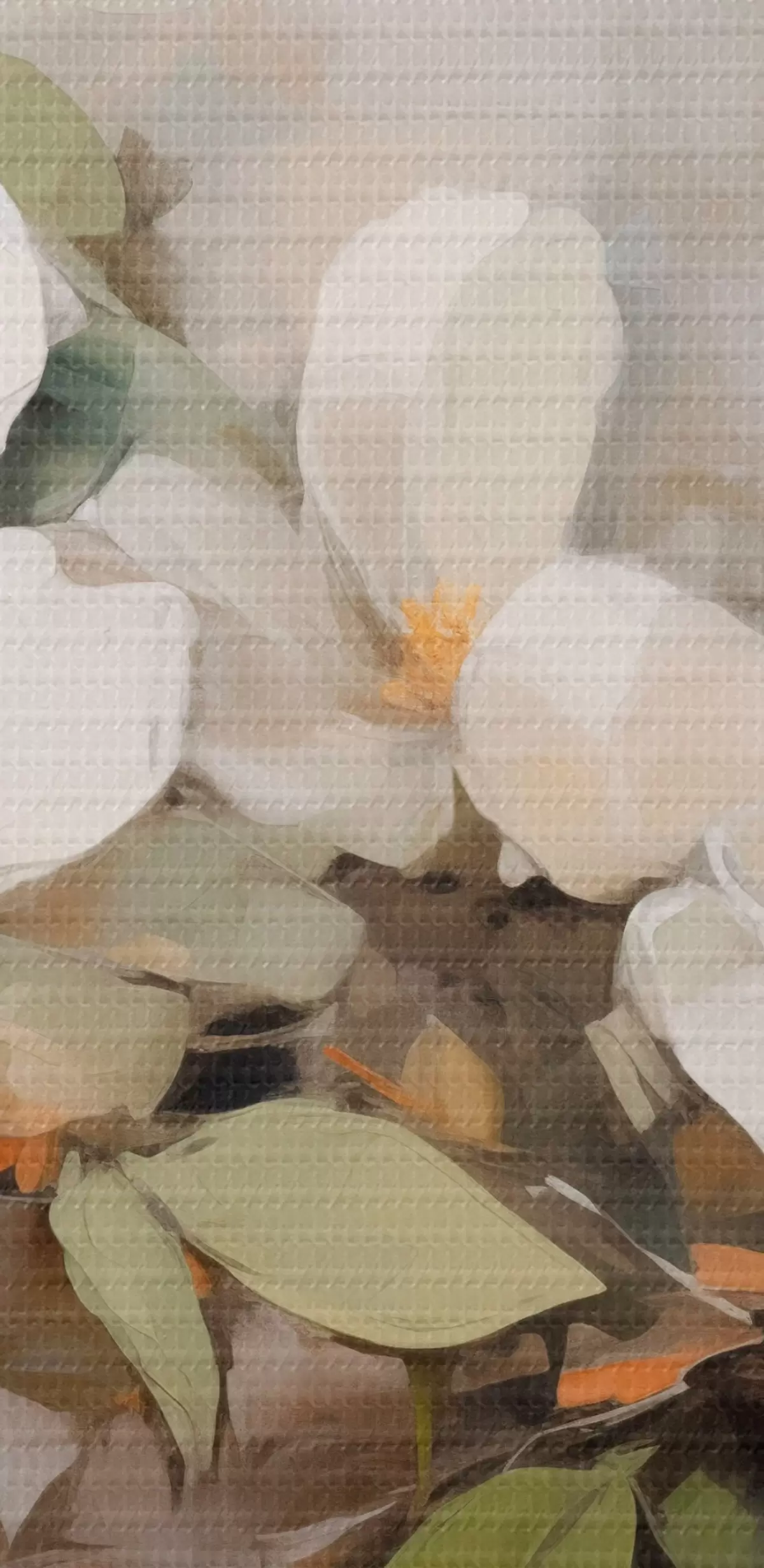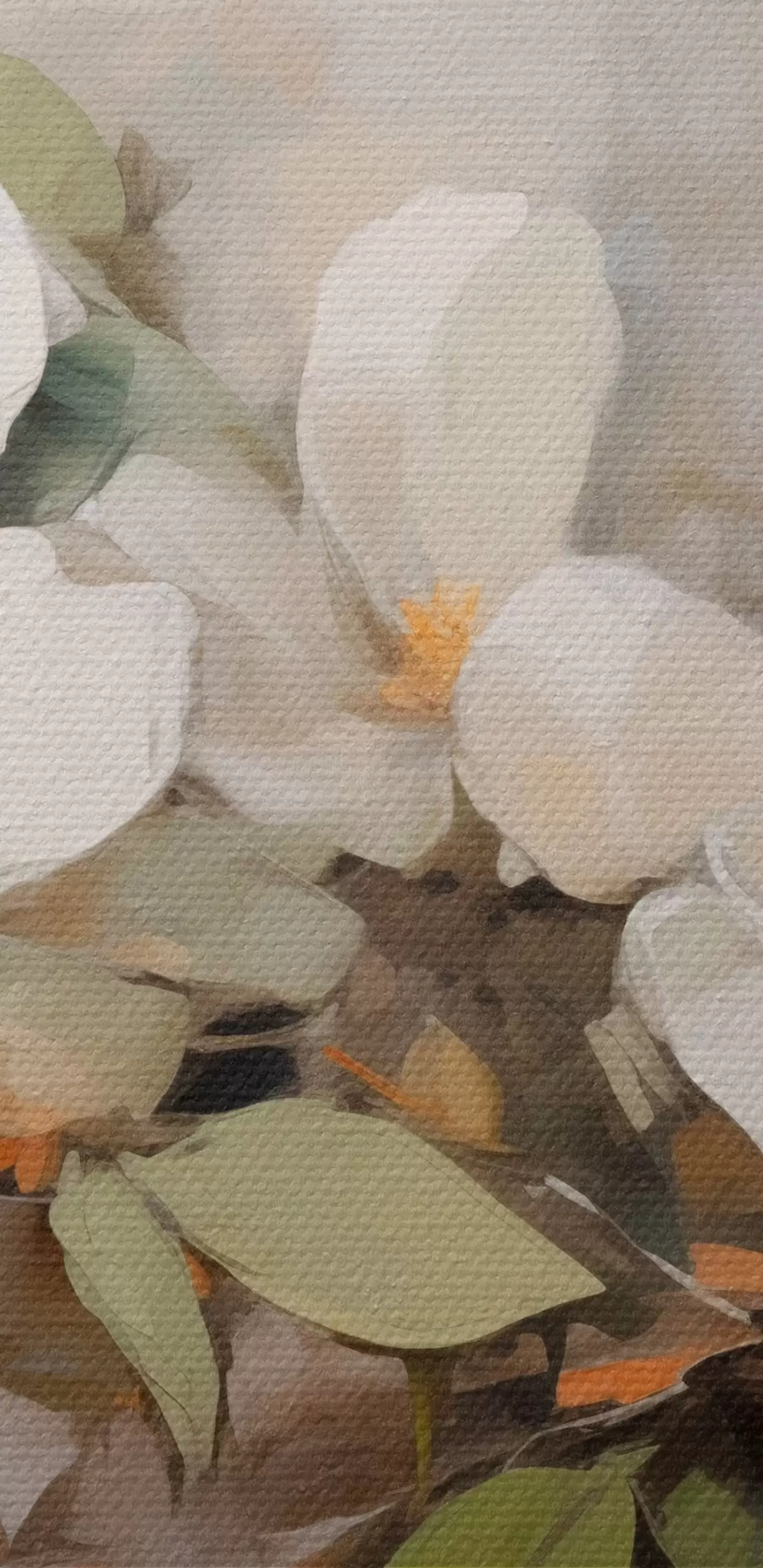 Picturi rotunde Flori albe de magnolie cu frunze verzi pe o ramură, tușe moi, culori stinse Nr r44404