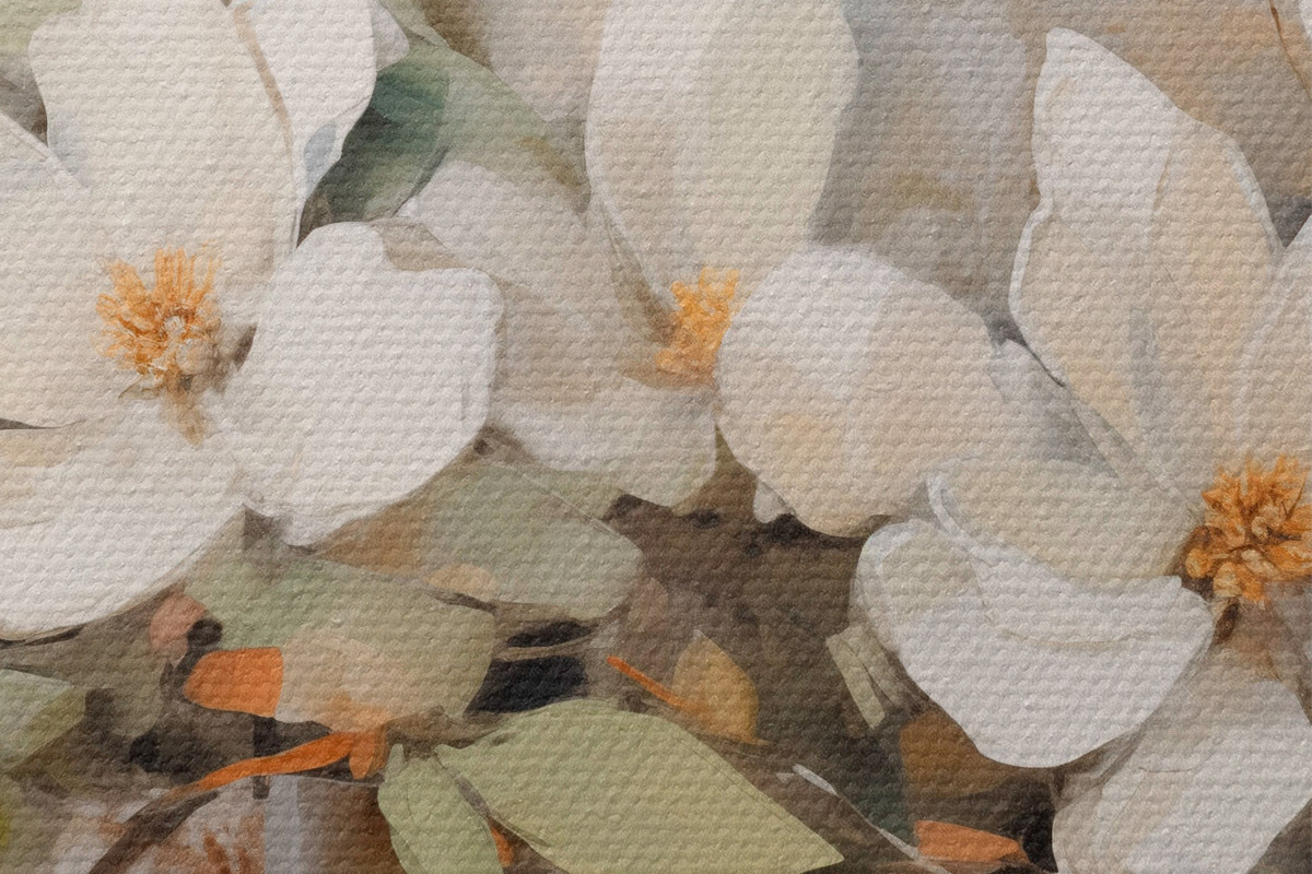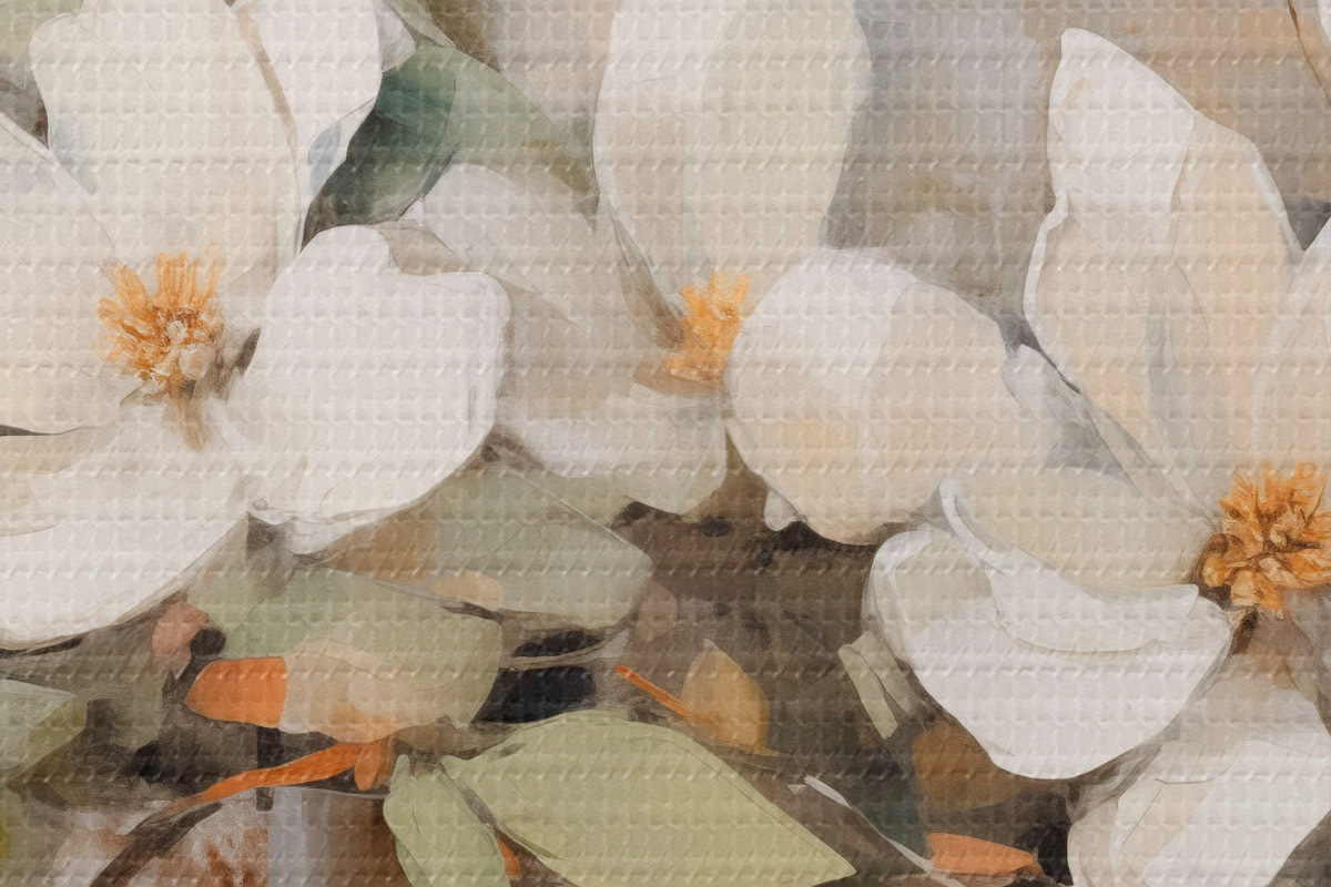 Picturi rotunde Flori albe de magnolie cu frunze verzi pe o ramură, tușe moi, culori stinse r44404