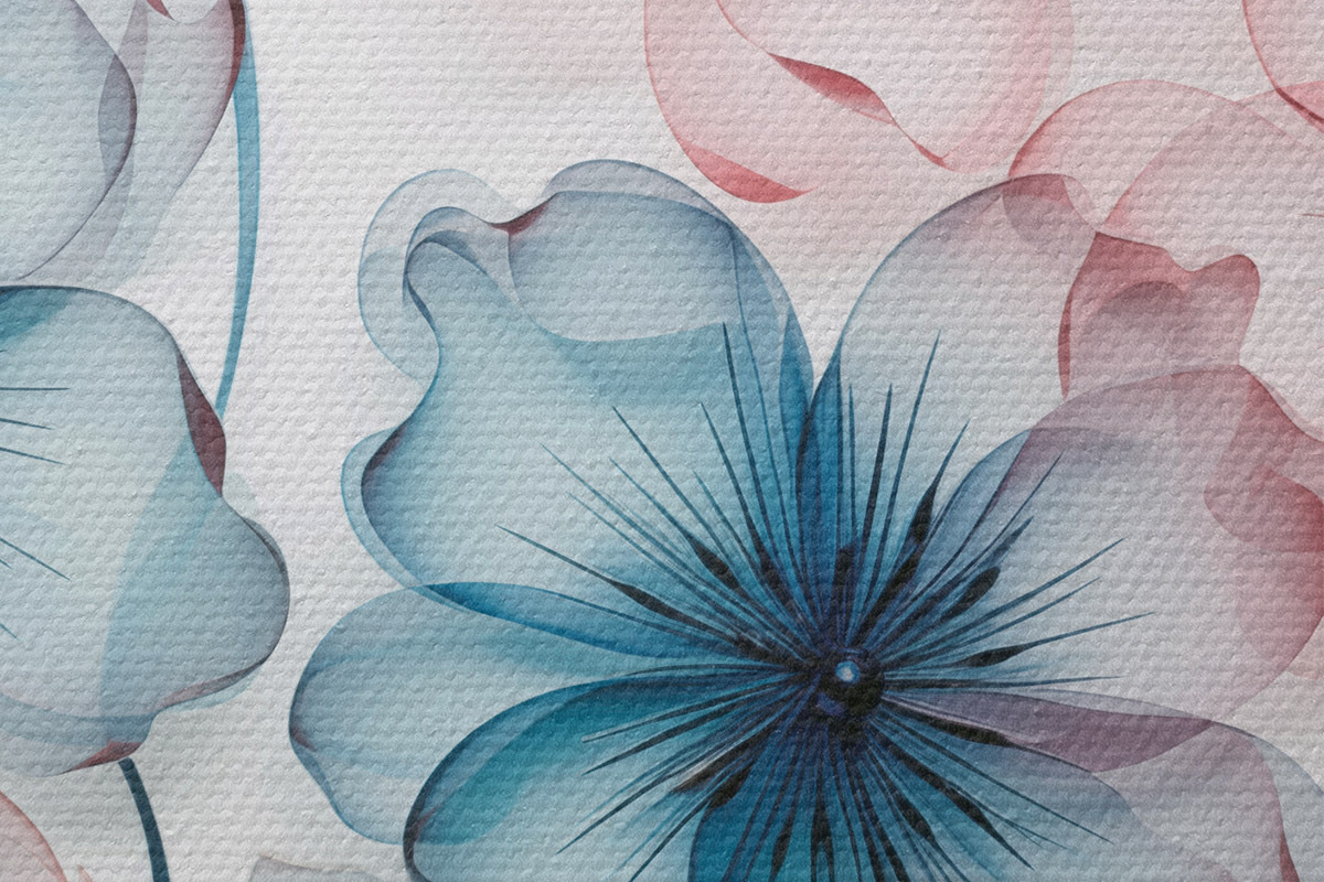 Picturi rotunde Flori translucide roz și albastru, cu stamine și tulpini vizibile r44405