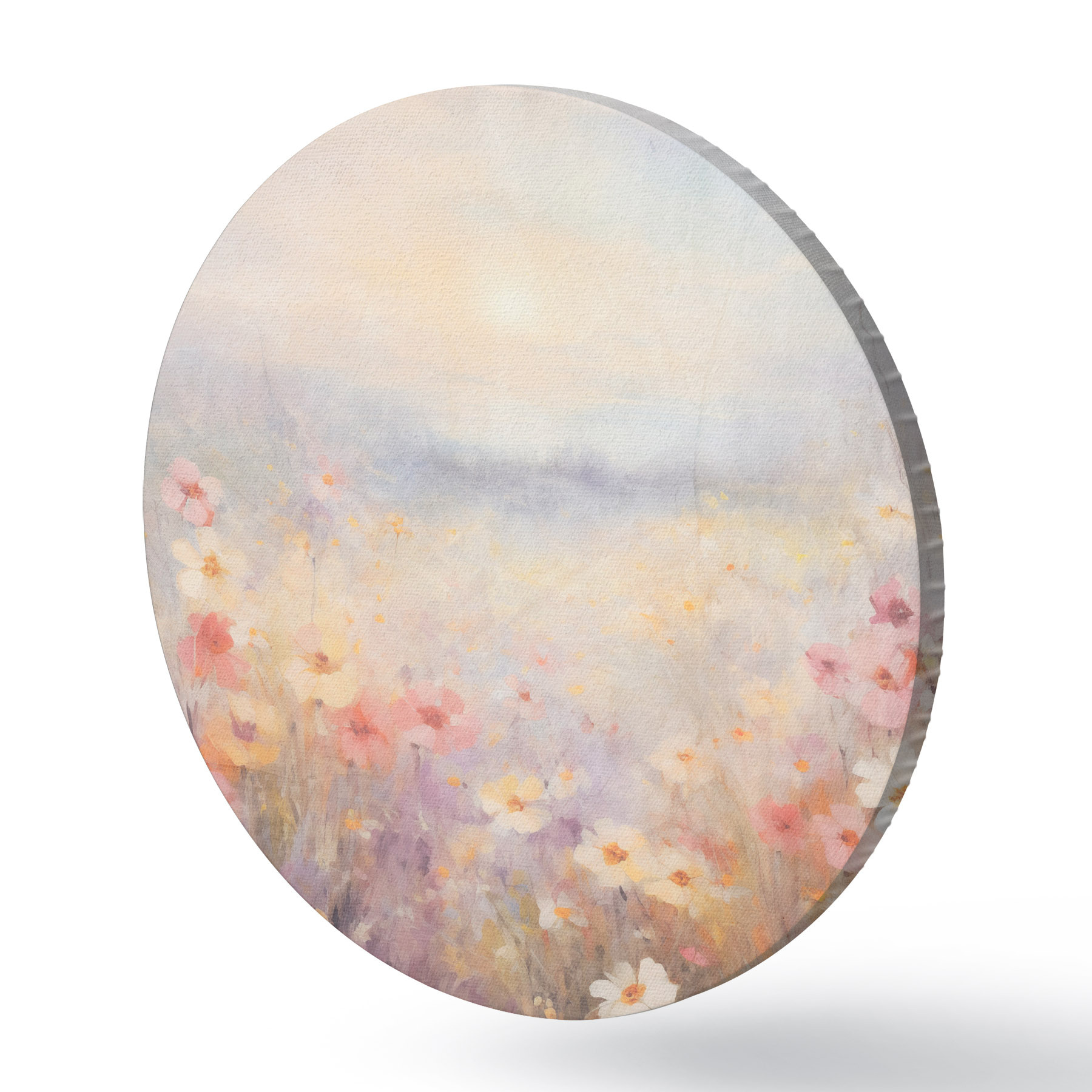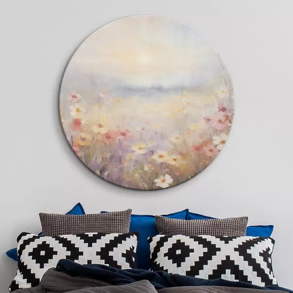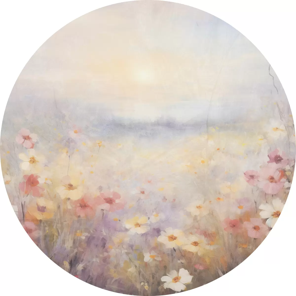 Picturi rotunde Peisaj însorit texturat de câmp de flori, culori pastelate moi, atmosferă de vis Nr r44408