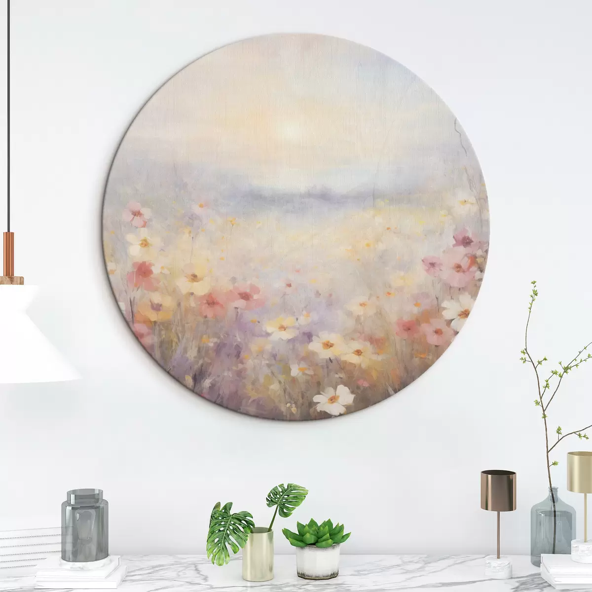 Picturi rotunde Peisaj însorit texturat de câmp de flori, culori pastelate moi, atmosferă de vis r44408