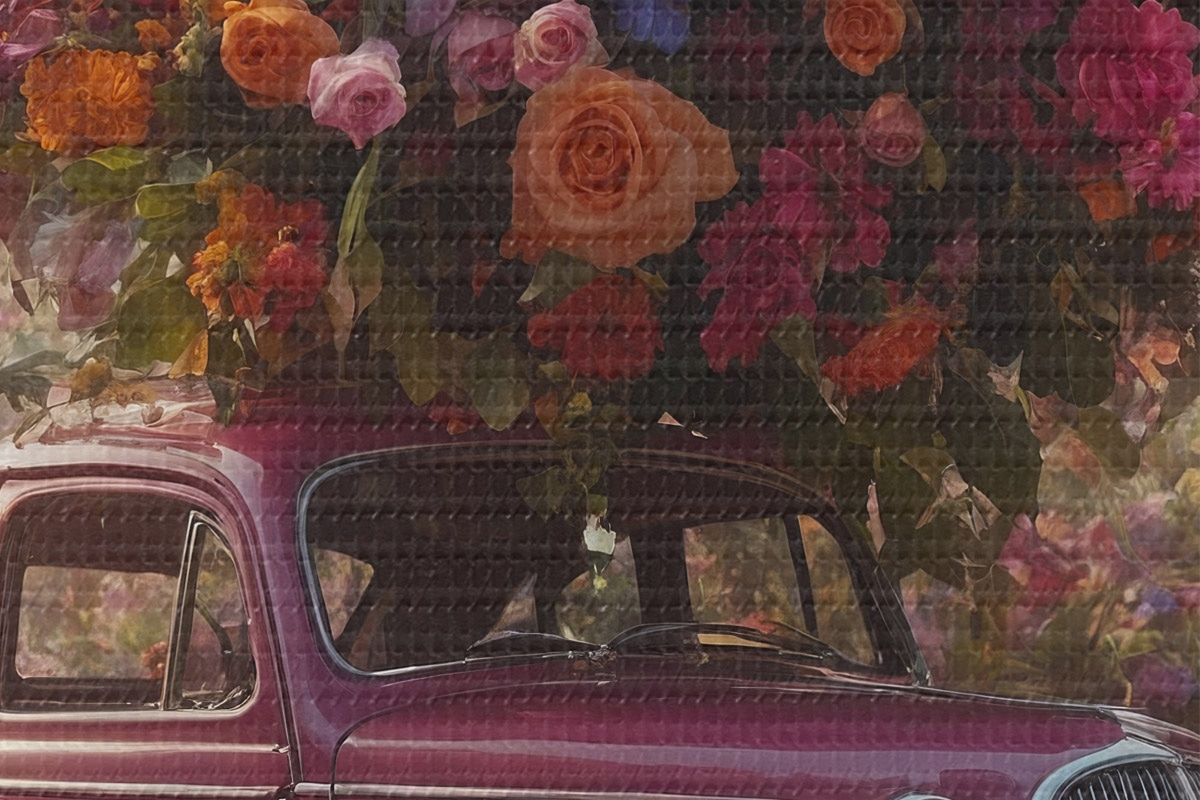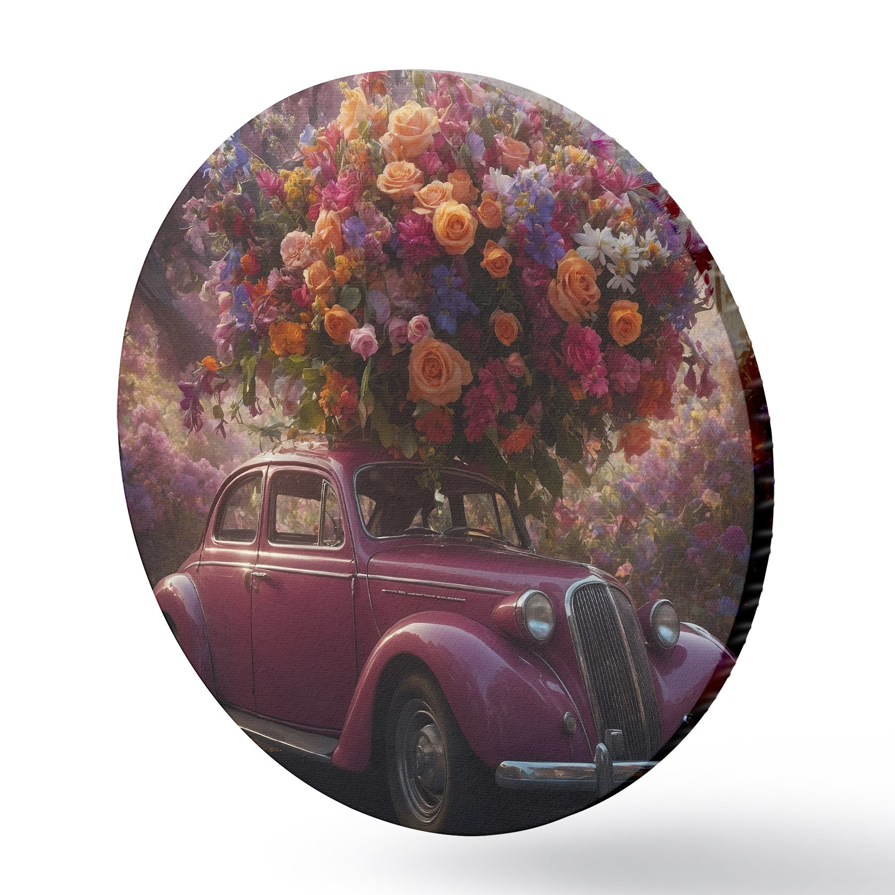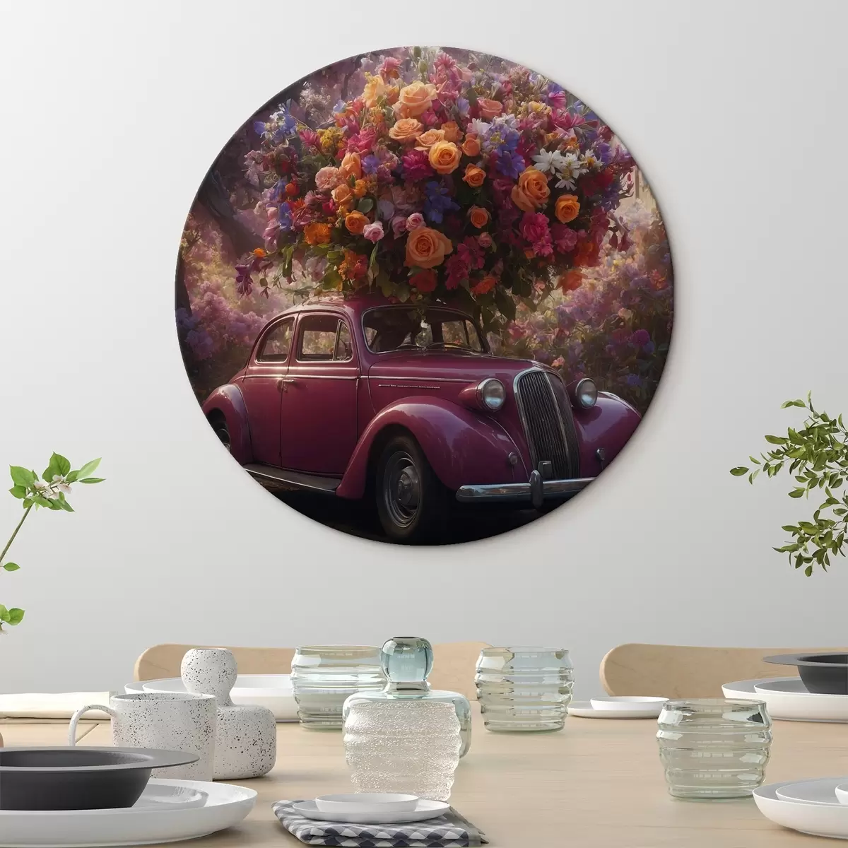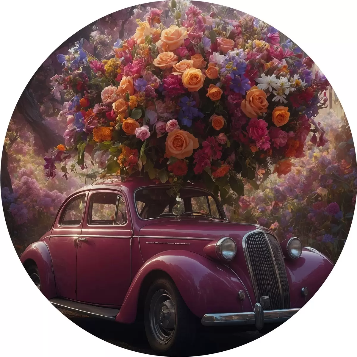 Picturi rotunde Mașină retro și un buchet imens de flori r44471