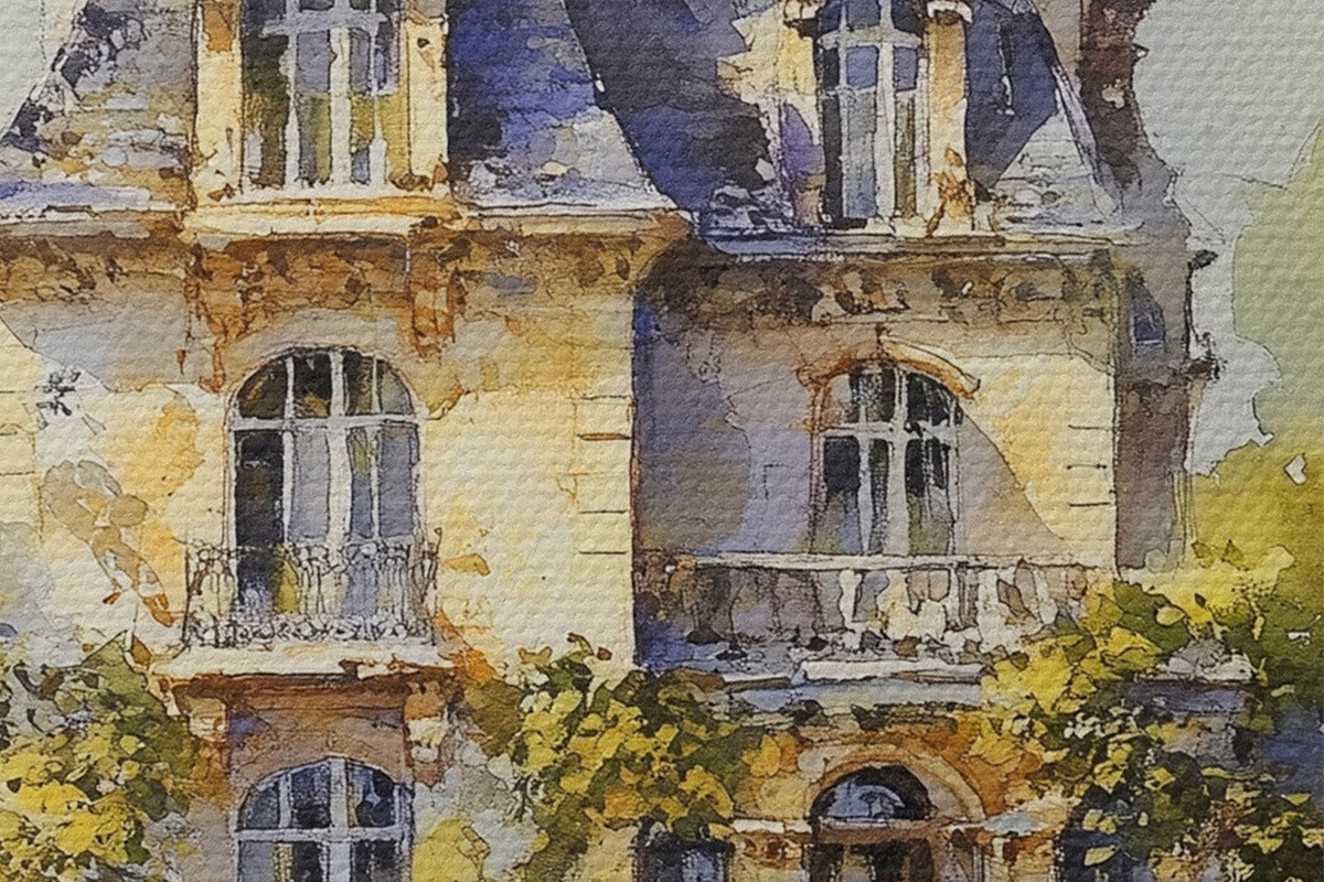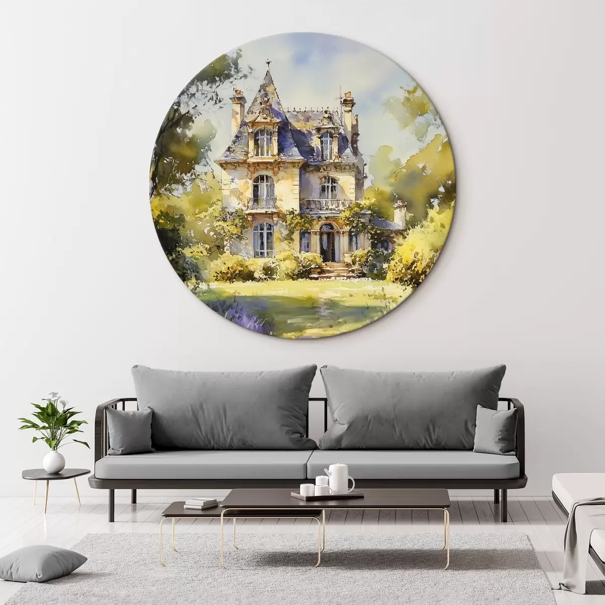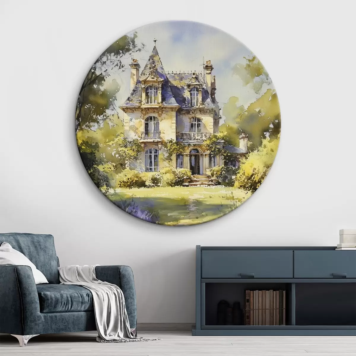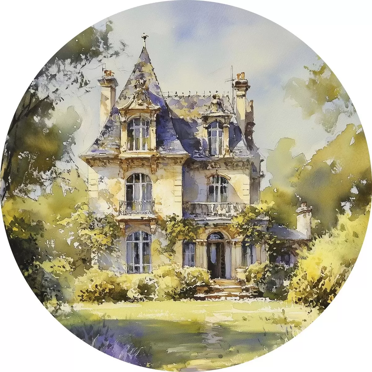 Picturi rotunde Cabană rurală franceză, stil acuarelă, câmpuri de lavandă Nr r44501