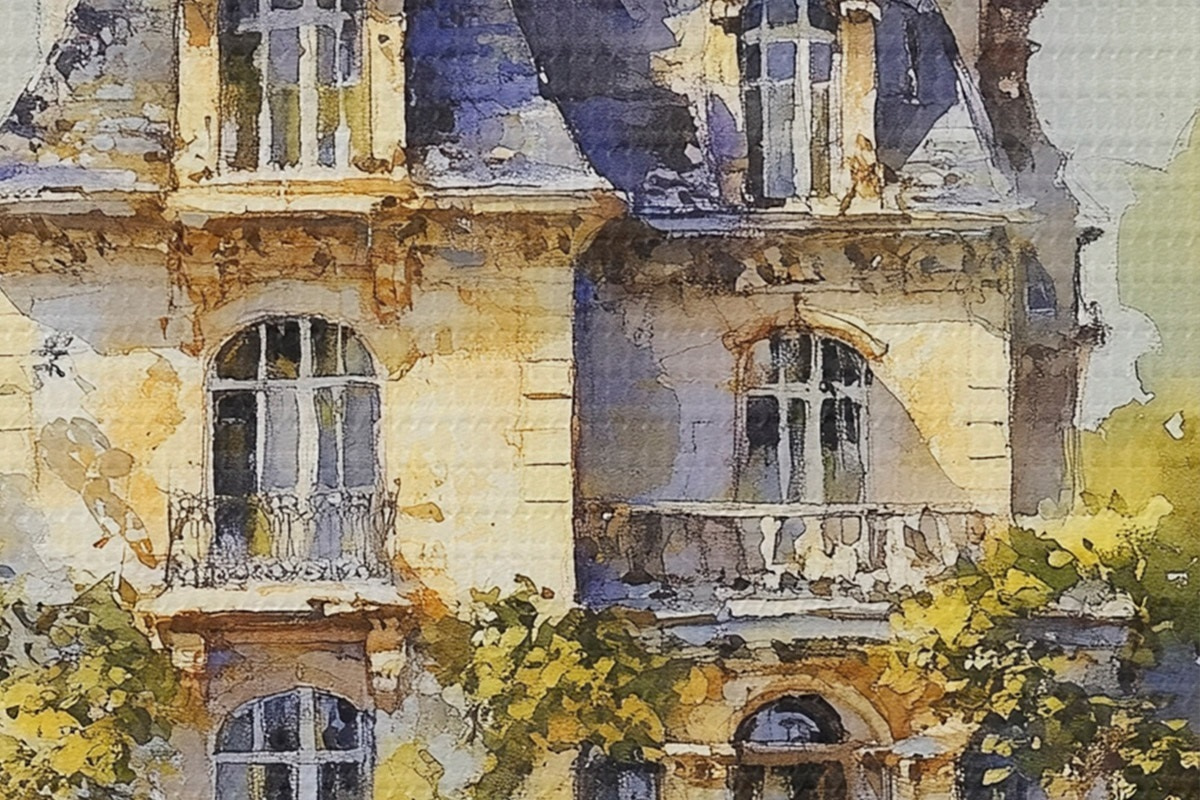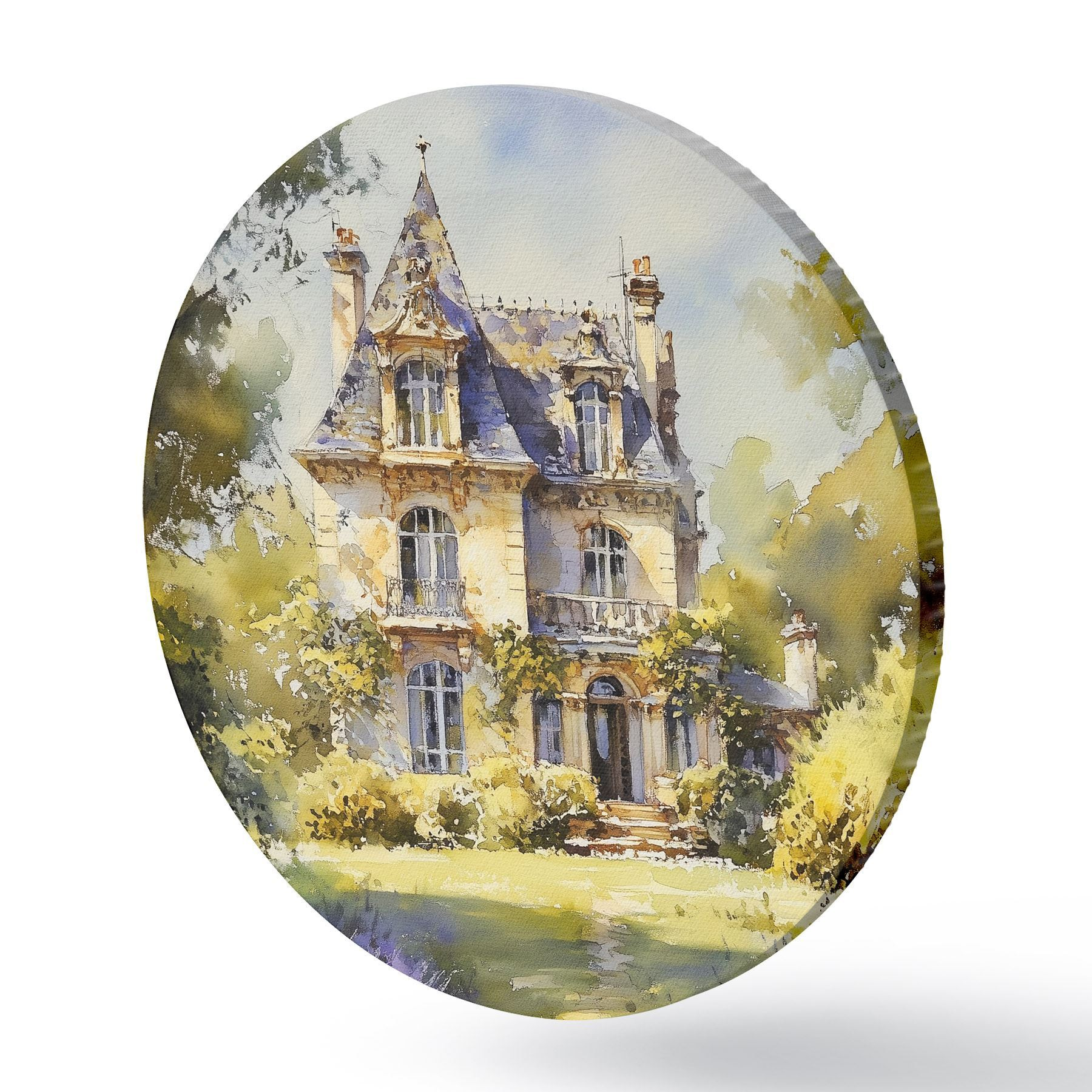 Picturi rotunde Cabană rurală franceză, stil acuarelă, câmpuri de lavandă r44501