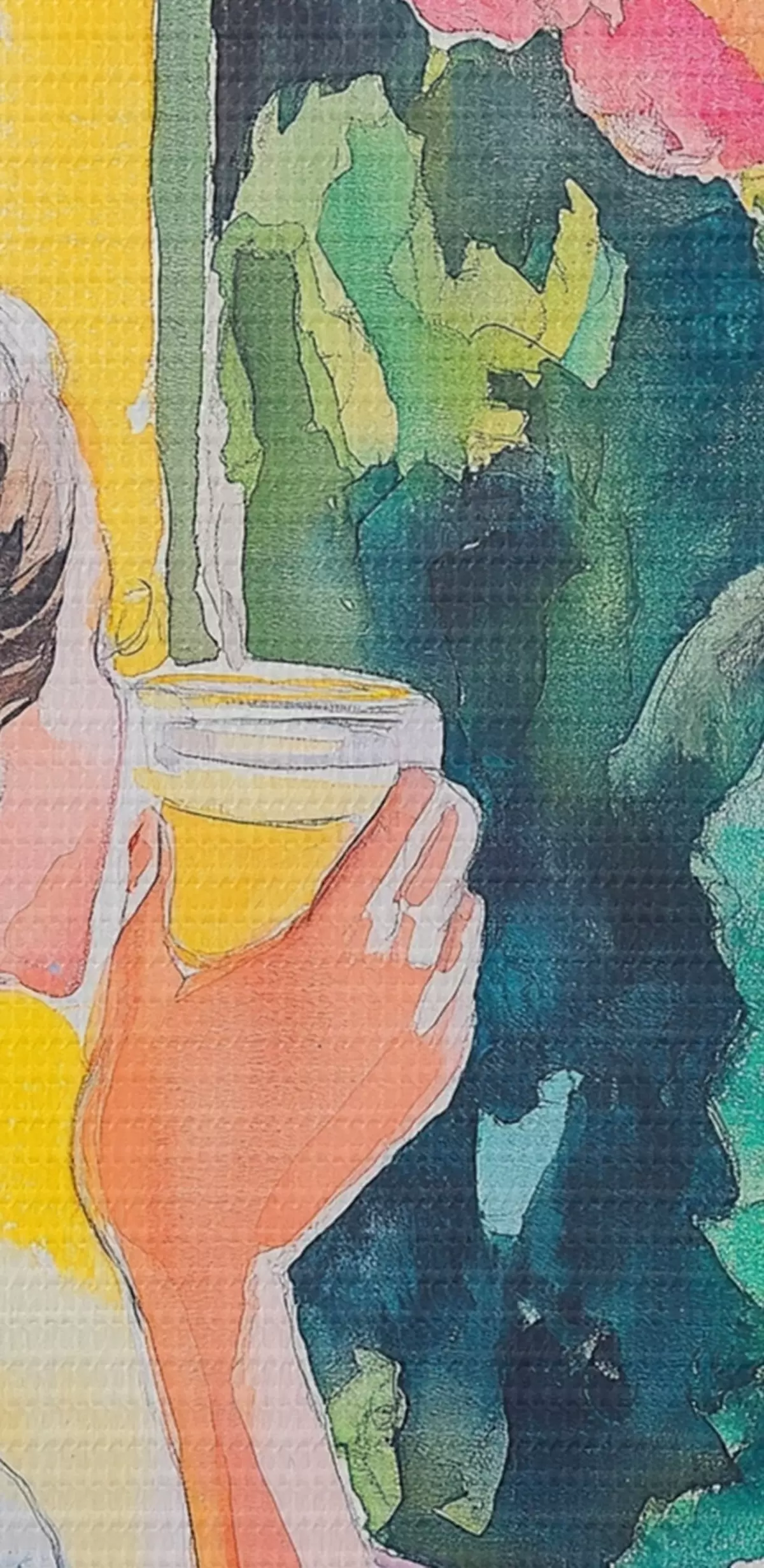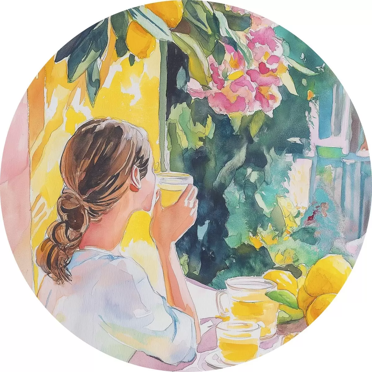 Picturi rotunde Vibrații de vară, fată în cafenea, limoncello, Italia, stil acuarelă r44505