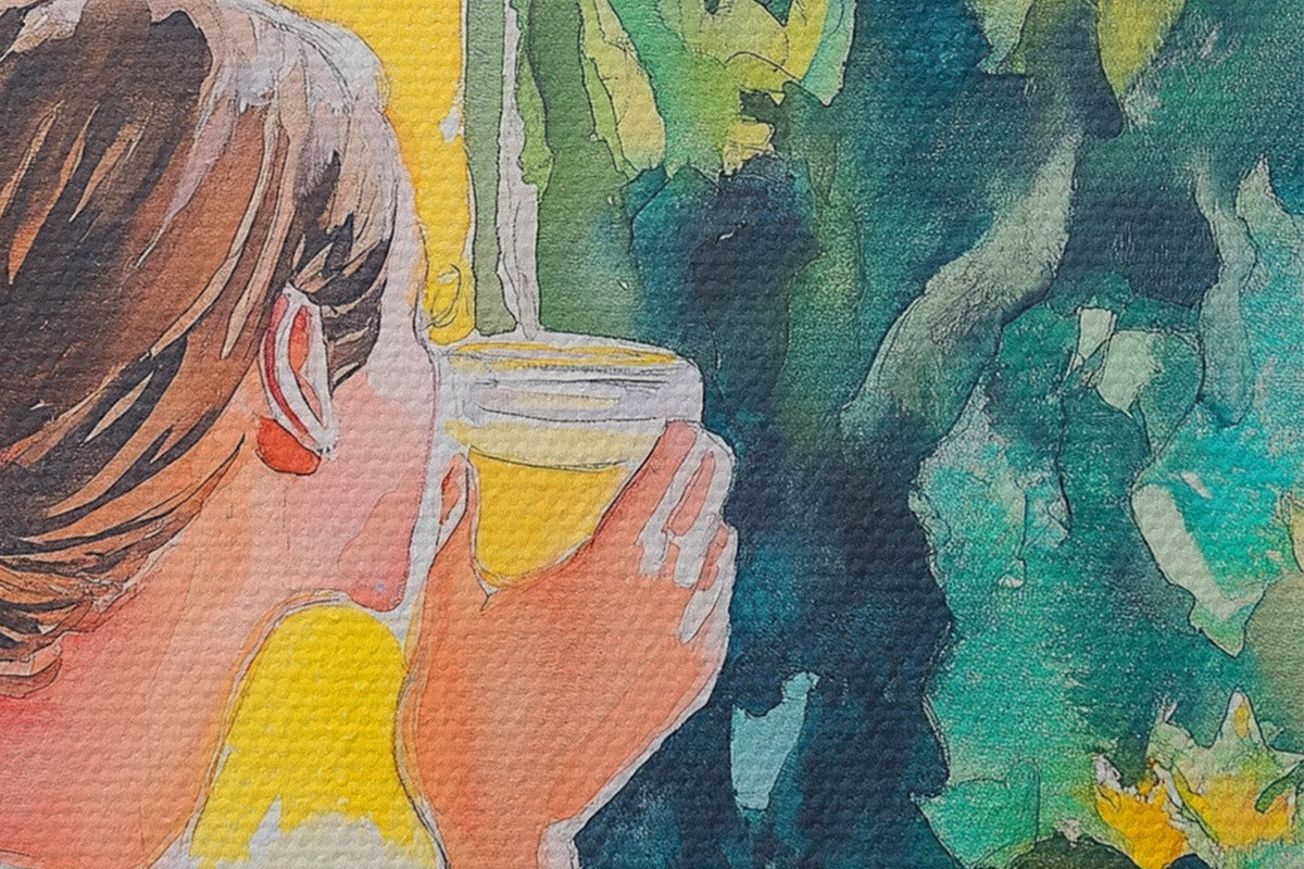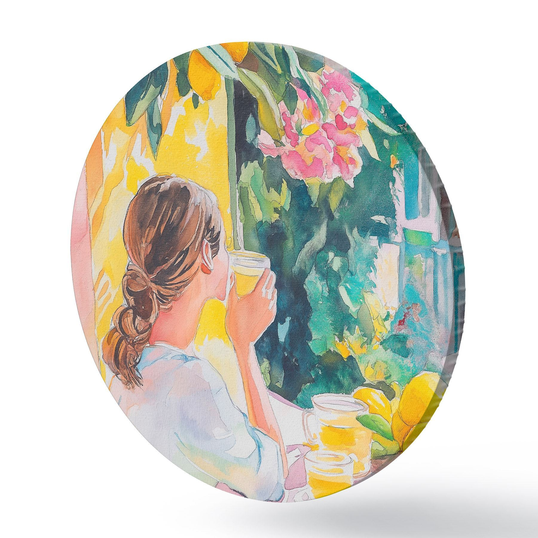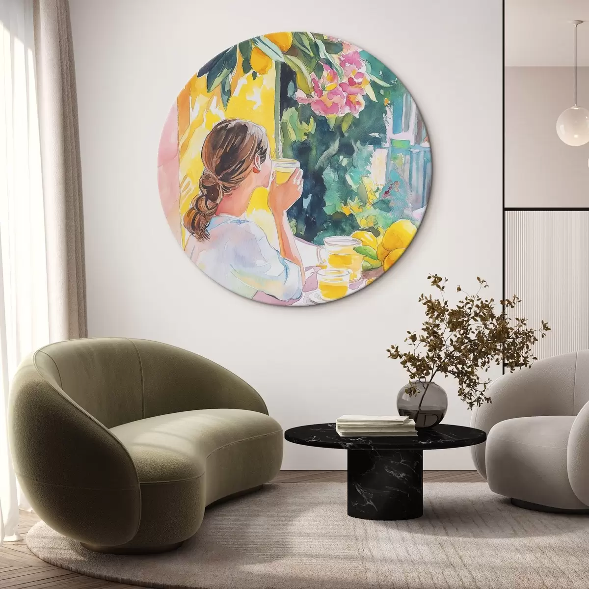 Picturi rotunde Vibrații de vară, fată în cafenea, limoncello, Italia, stil acuarelă Nr r44505