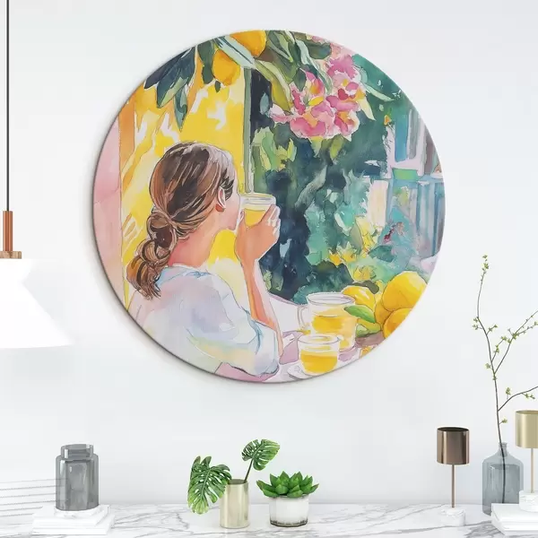 Picturi rotunde Vibrații de vară, fată în cafenea, limoncello, Italia, stil acuarelă Nr r44505
