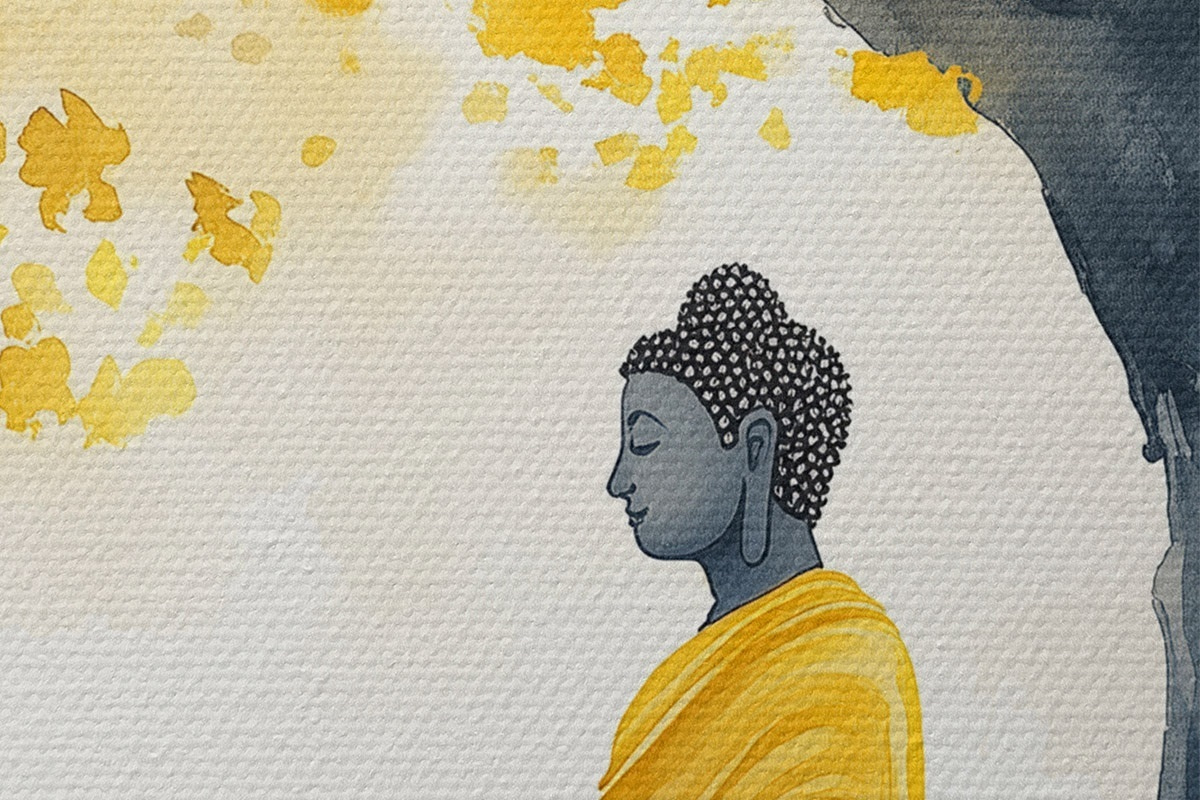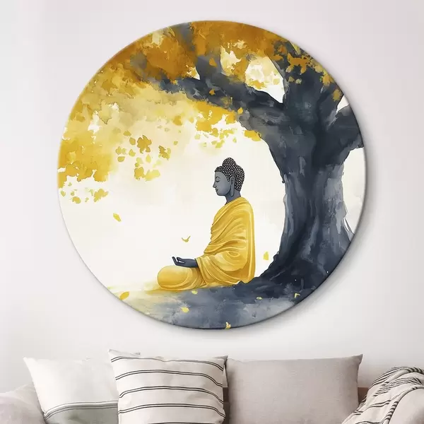 Picturi rotunde Buddha meditând sub copac, culorile galben și gri Nr r44509