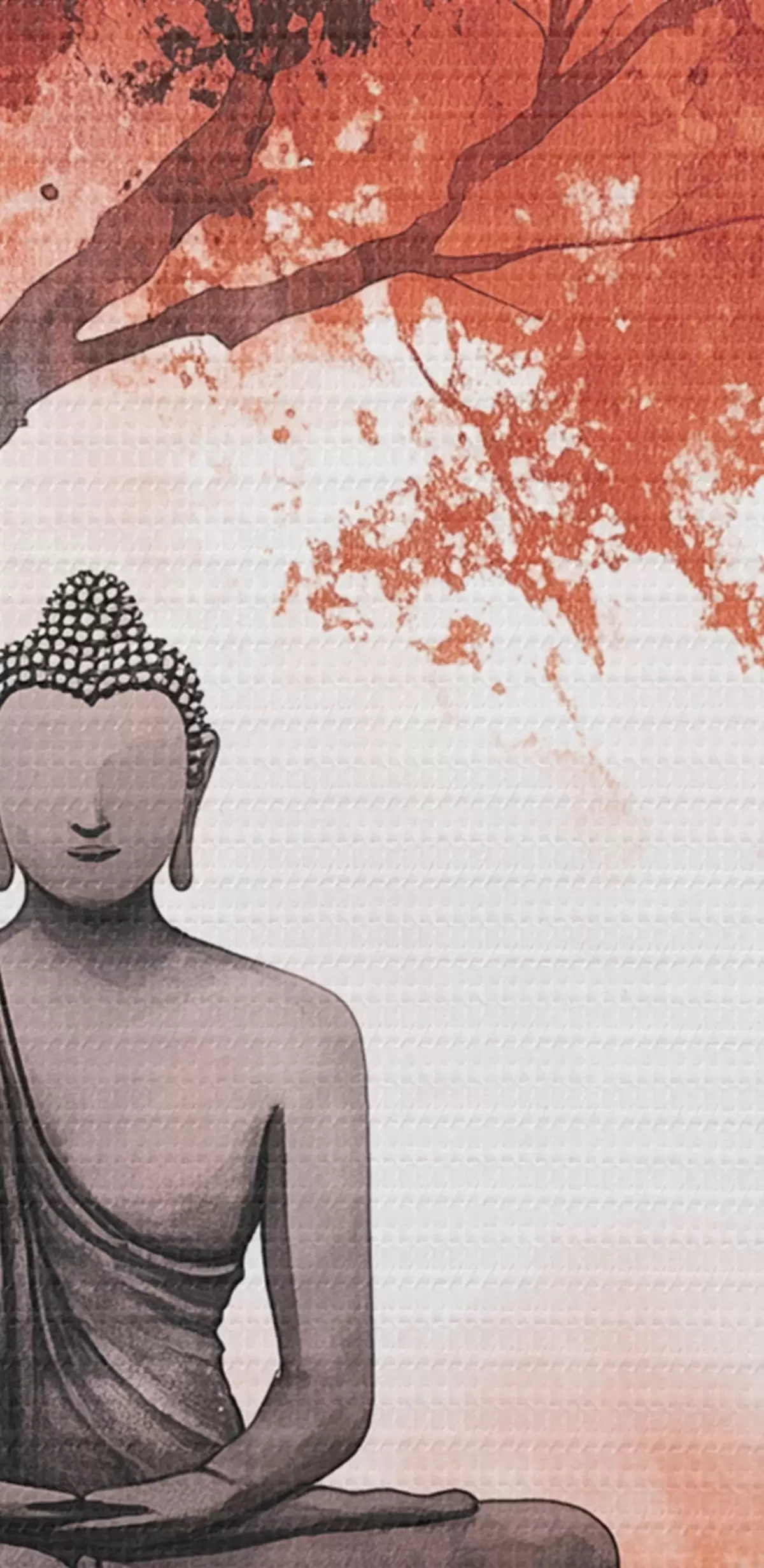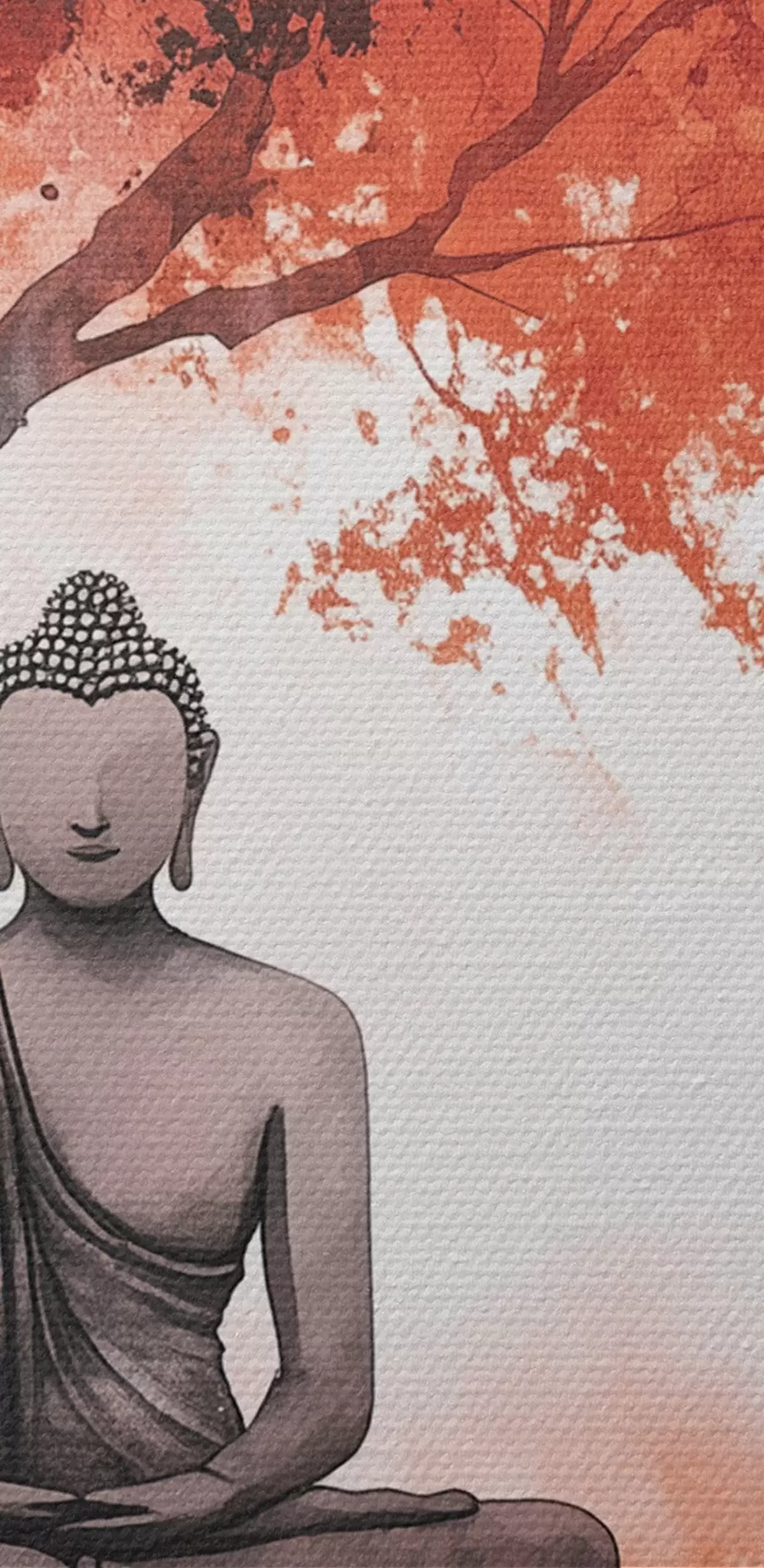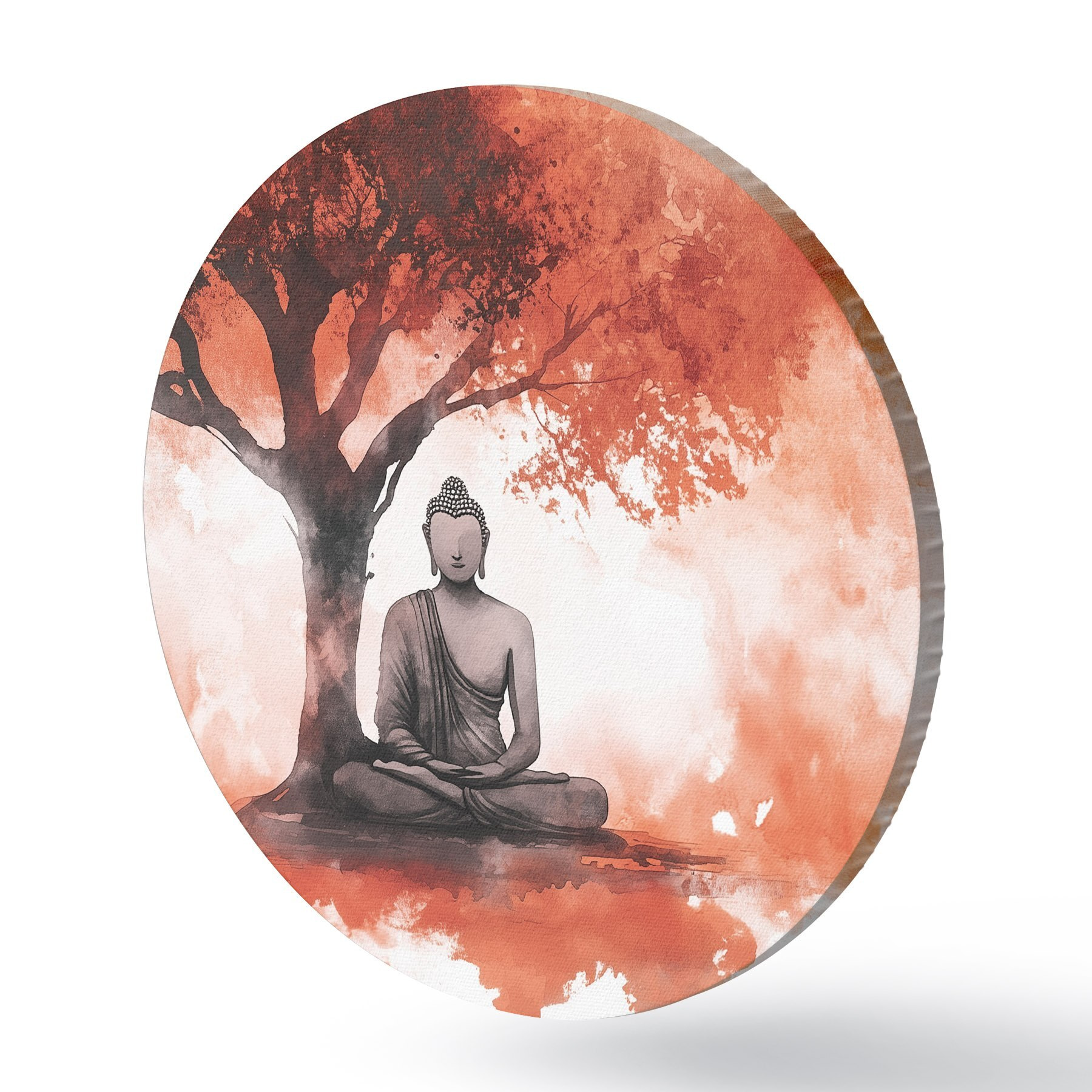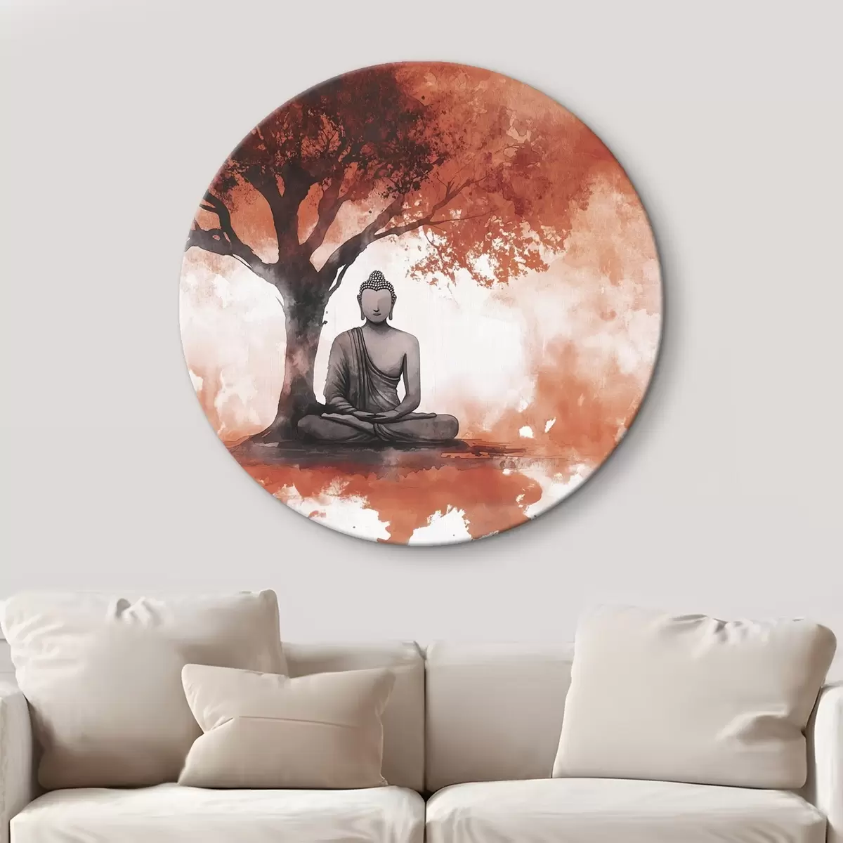 Picturi rotunde Buddha stând sub copac, meditație, spiritual, culori portocalii Nr r44512