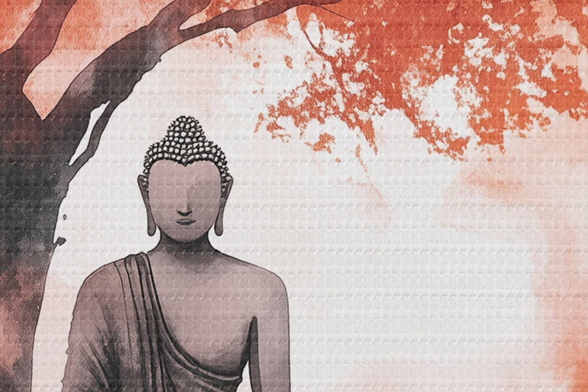 Picturi rotunde Buddha stând sub copac, meditație, spiritual, culori portocalii r44512