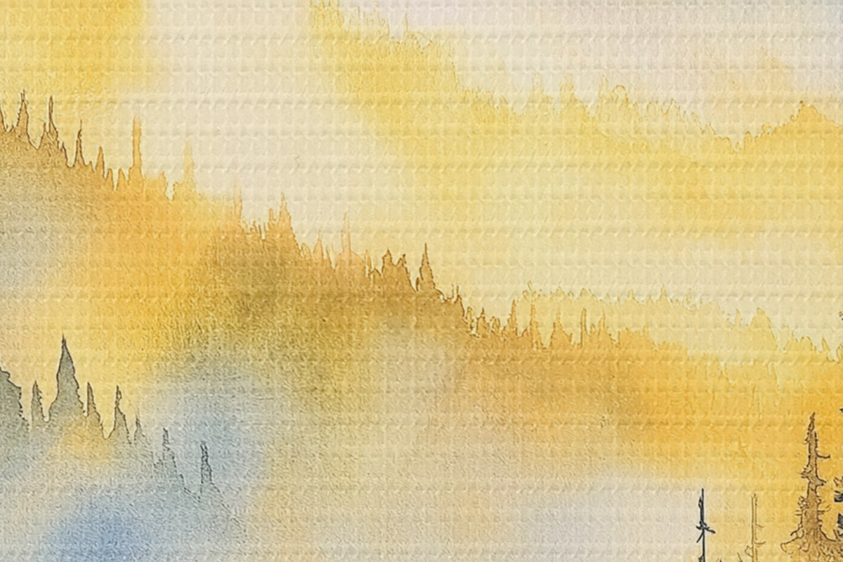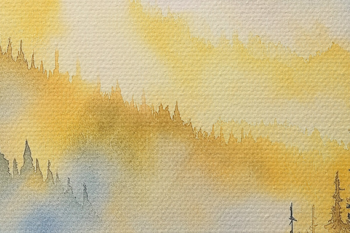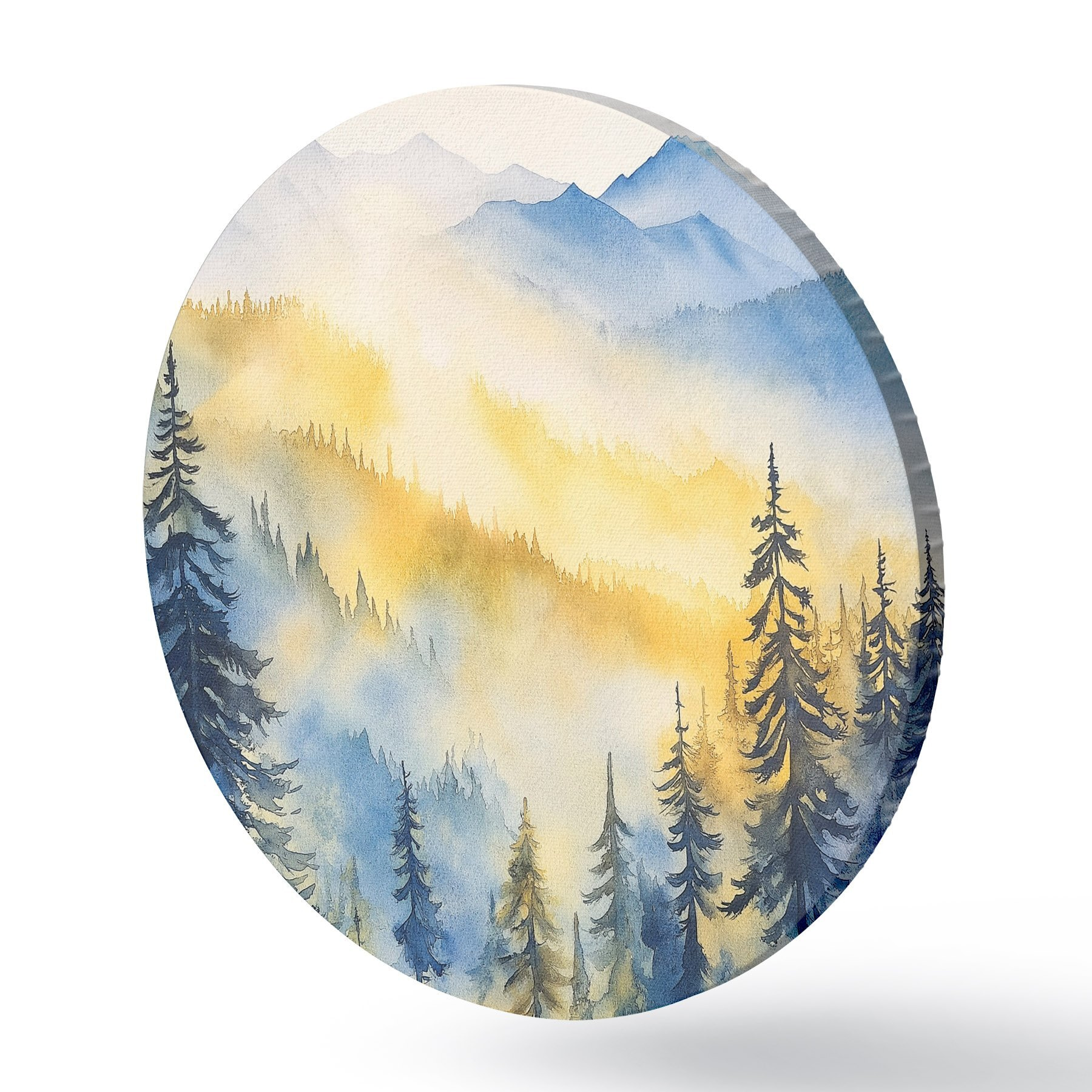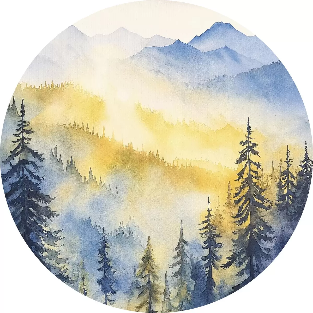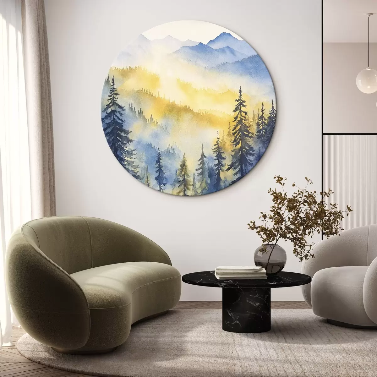 Picturi rotunde Munți cețoși pe un răsărit de soare, păduri de pin, culori albastru și galben Nr r44602