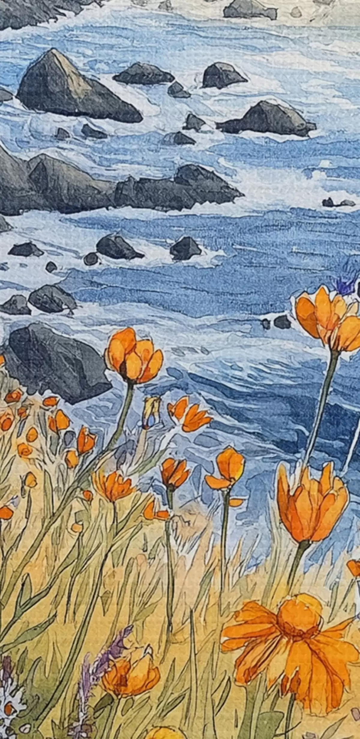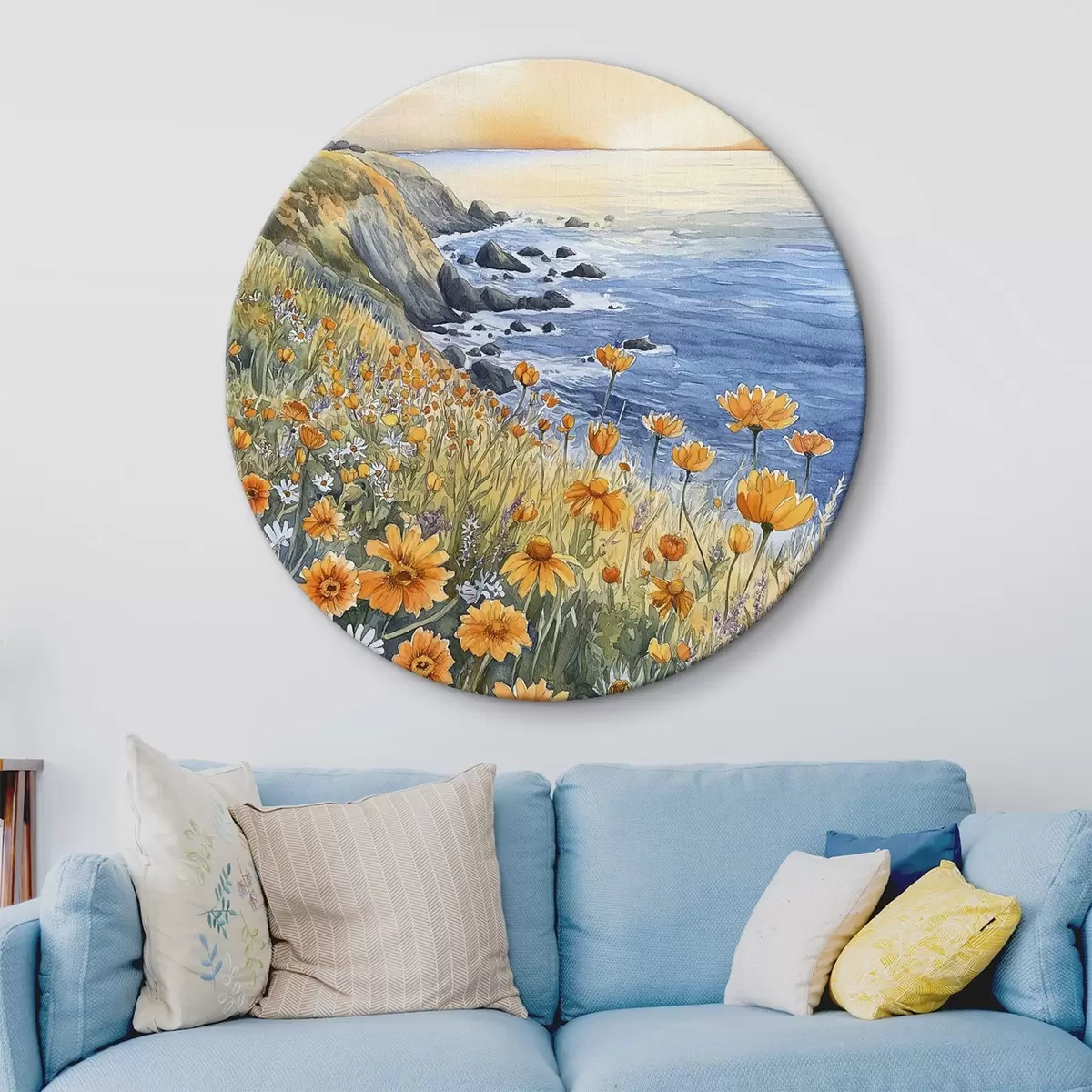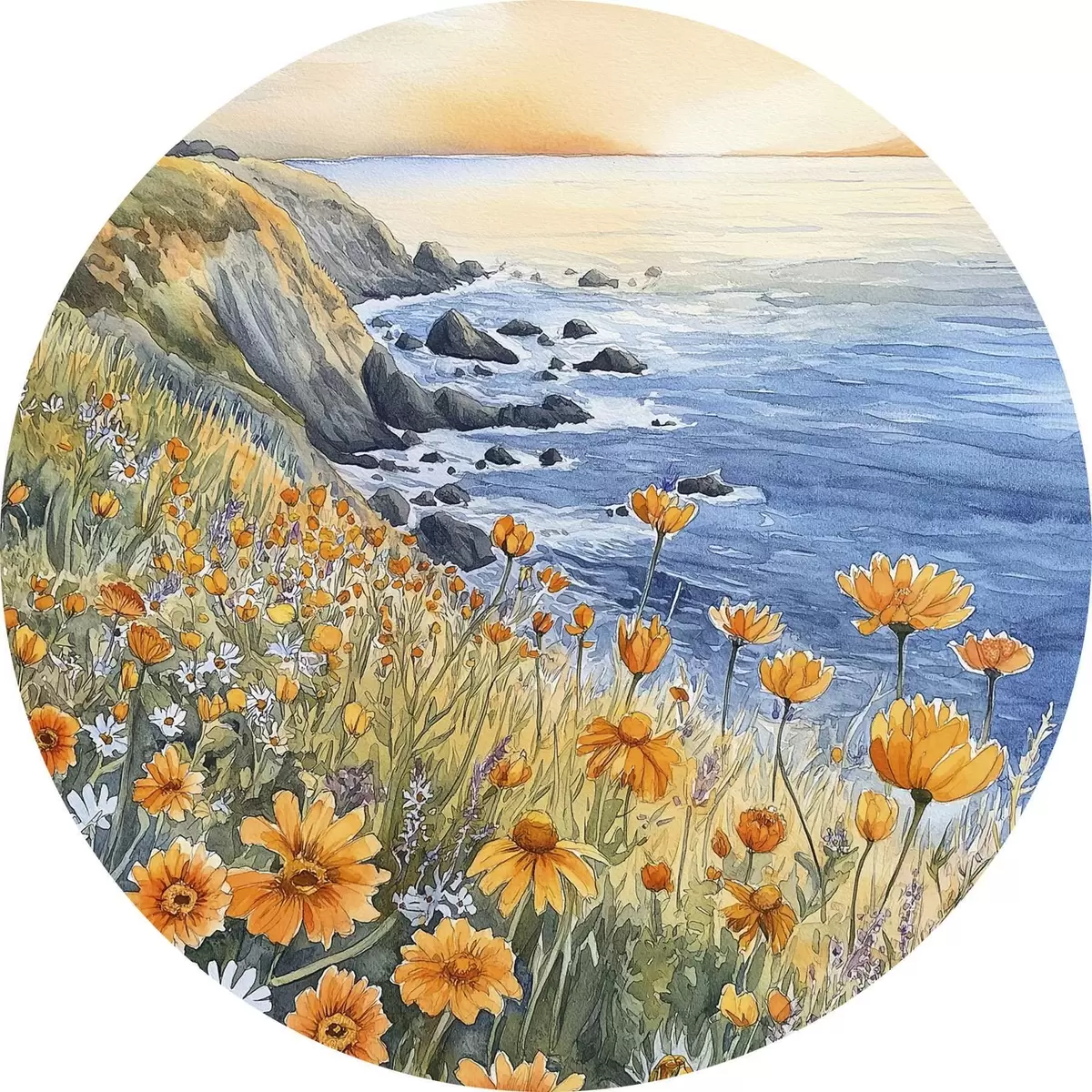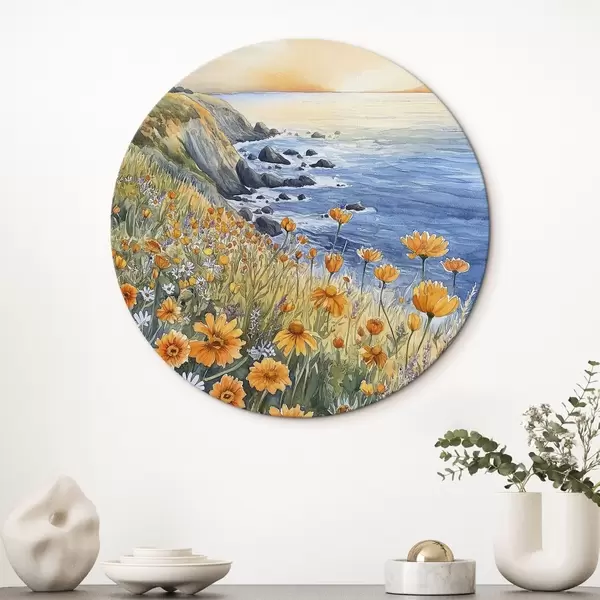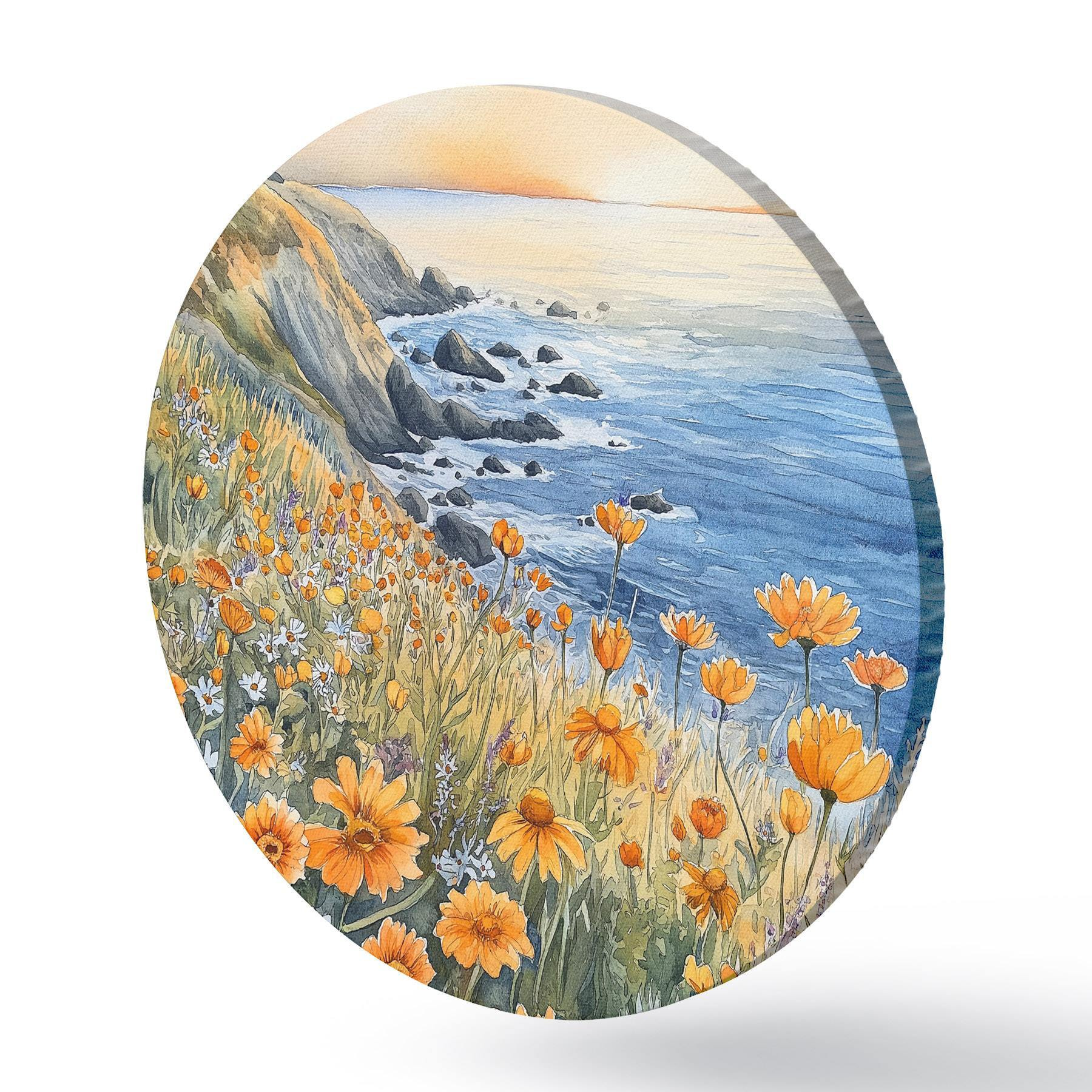 Picturi rotunde Cliff cu flori portocalii, coasta oceanului, Portugalia, stil acuarelă Nr r44604