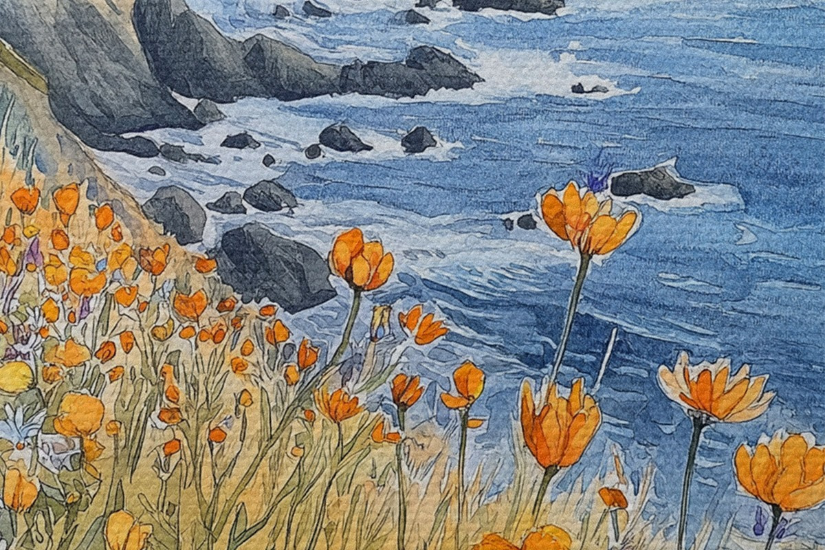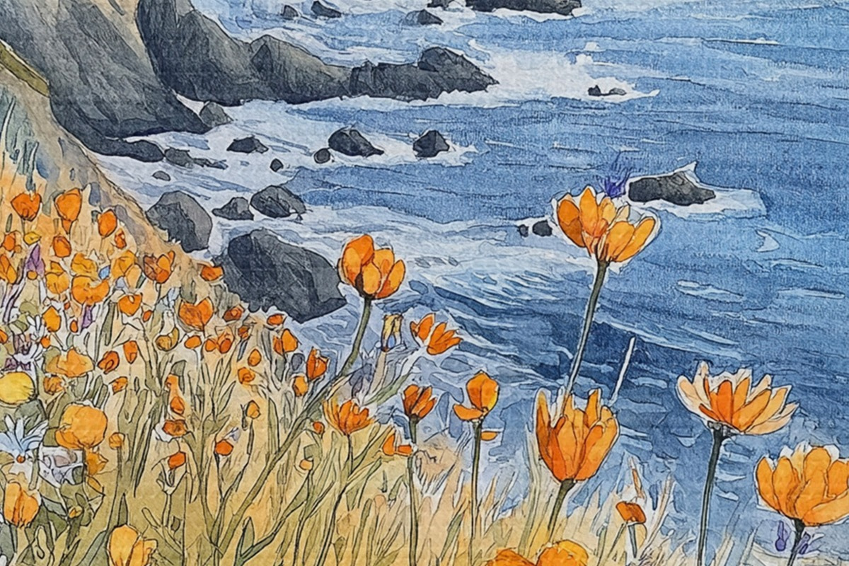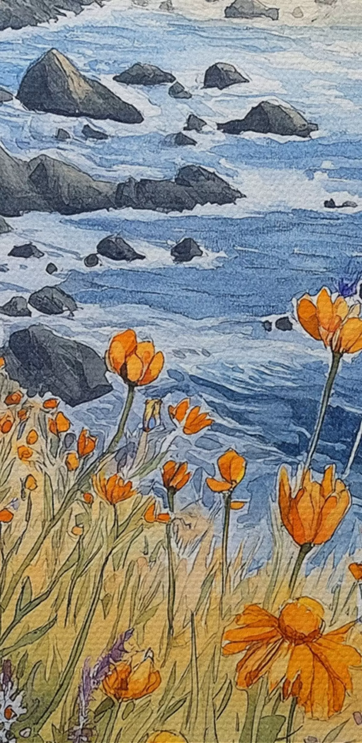 Picturi rotunde Cliff cu flori portocalii, coasta oceanului, Portugalia, stil acuarelă r44604