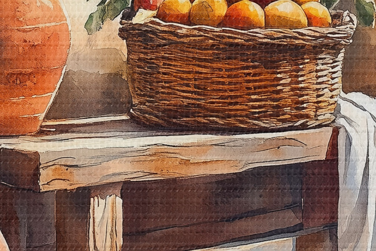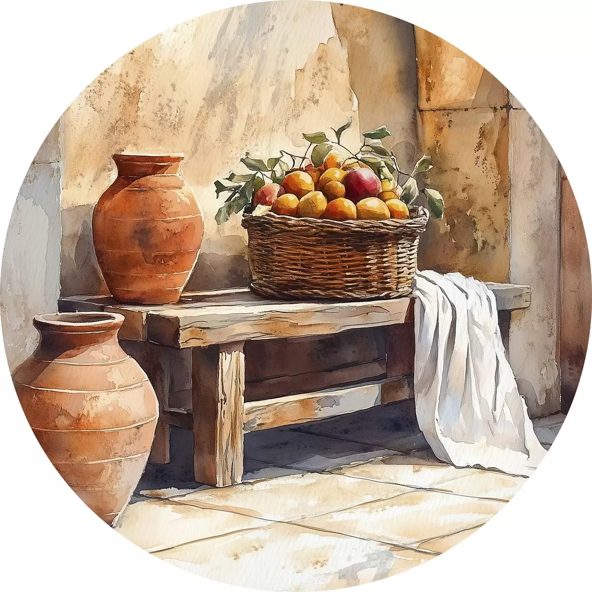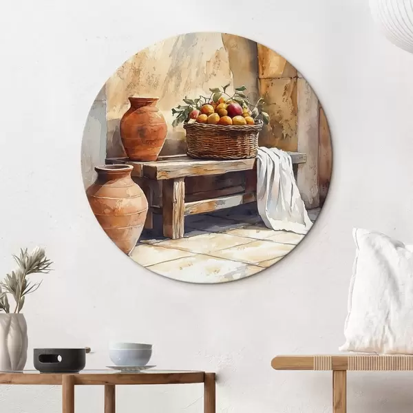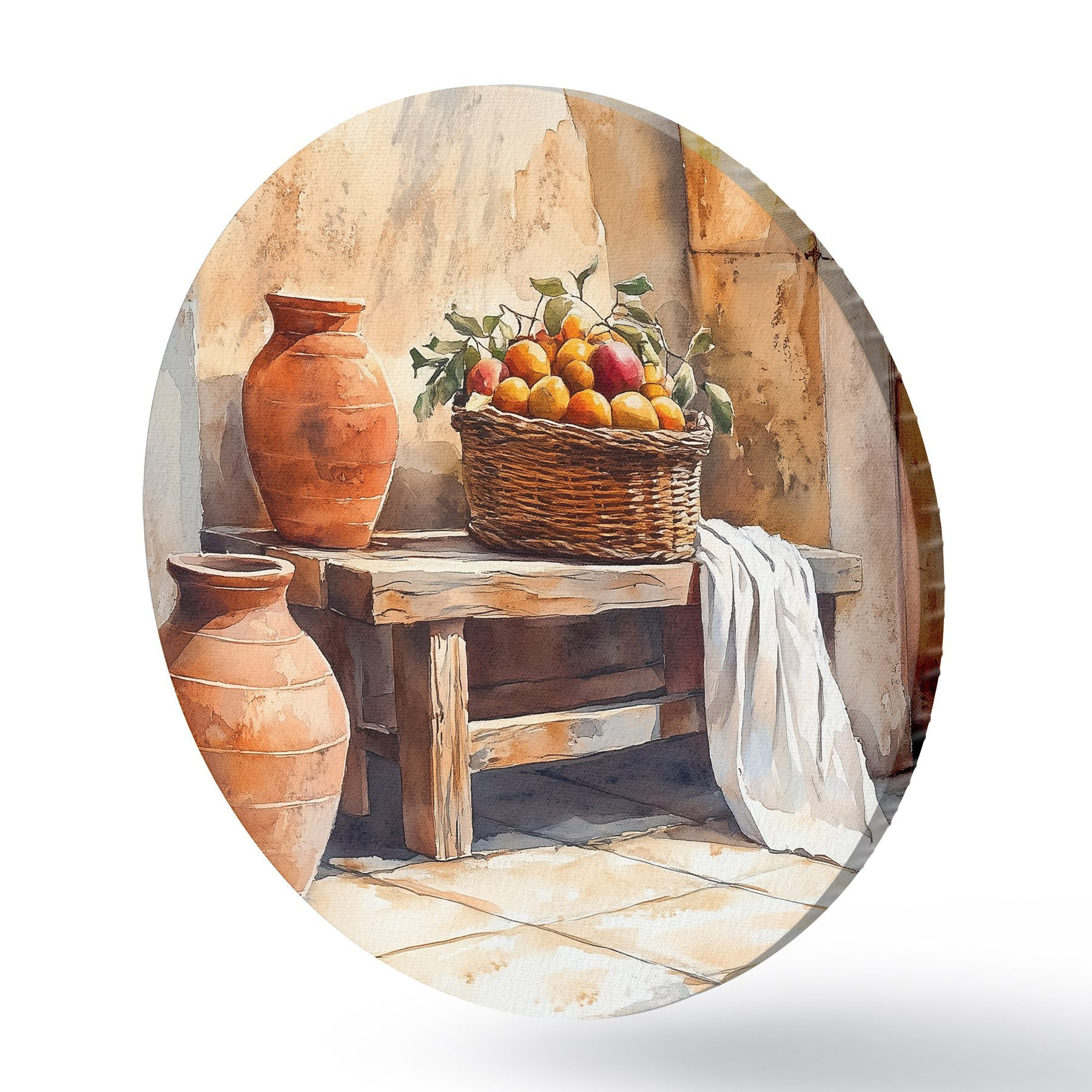 Picturi rotunde Vase estetice și coș de răchită cu portocale, Toscana, stil rustic r44605