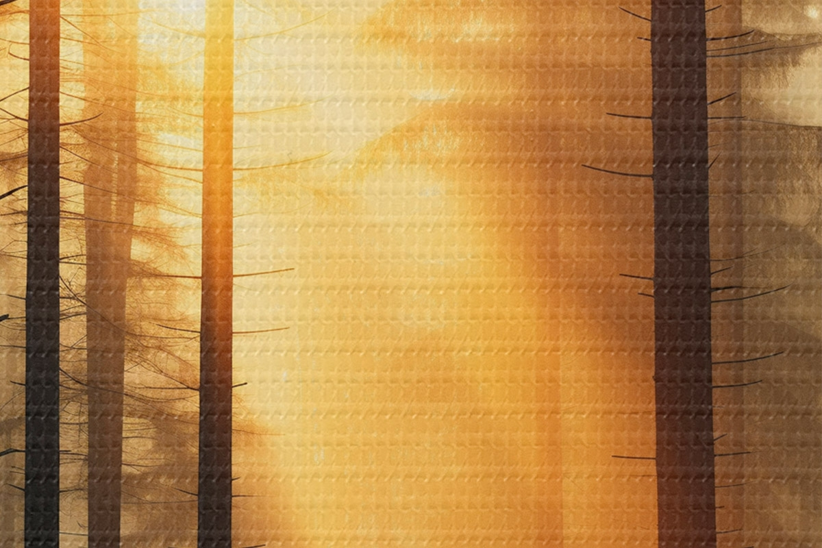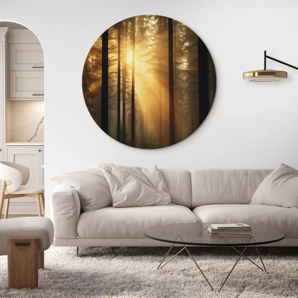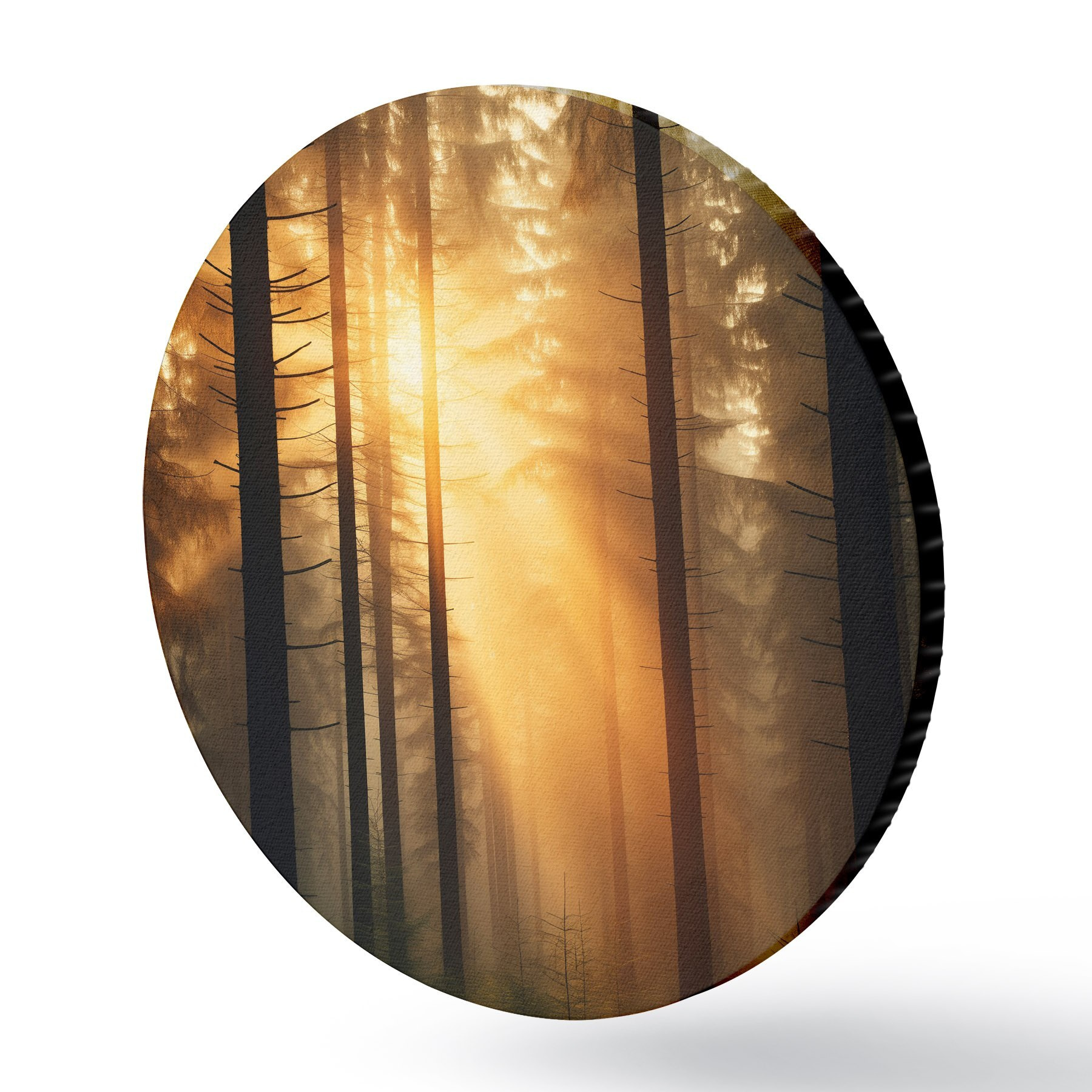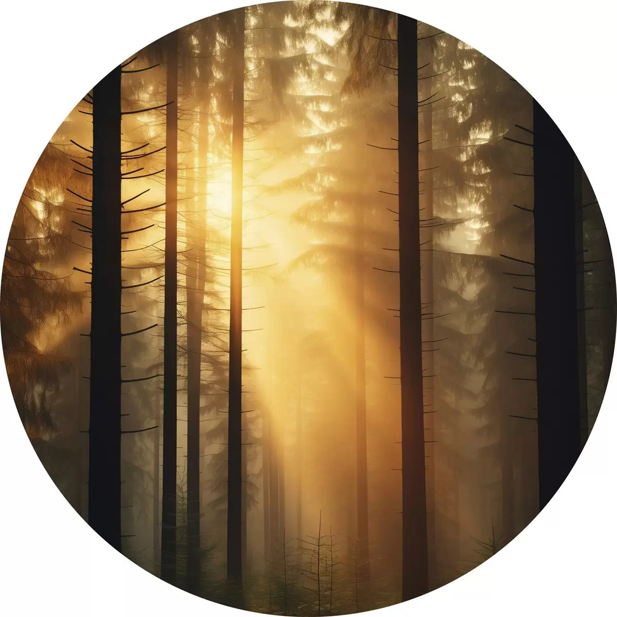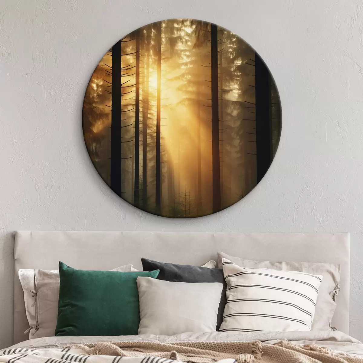 Picturi rotunde Pădure de pin densă cu lumina apusului de soare, realism, natură Nr r44615