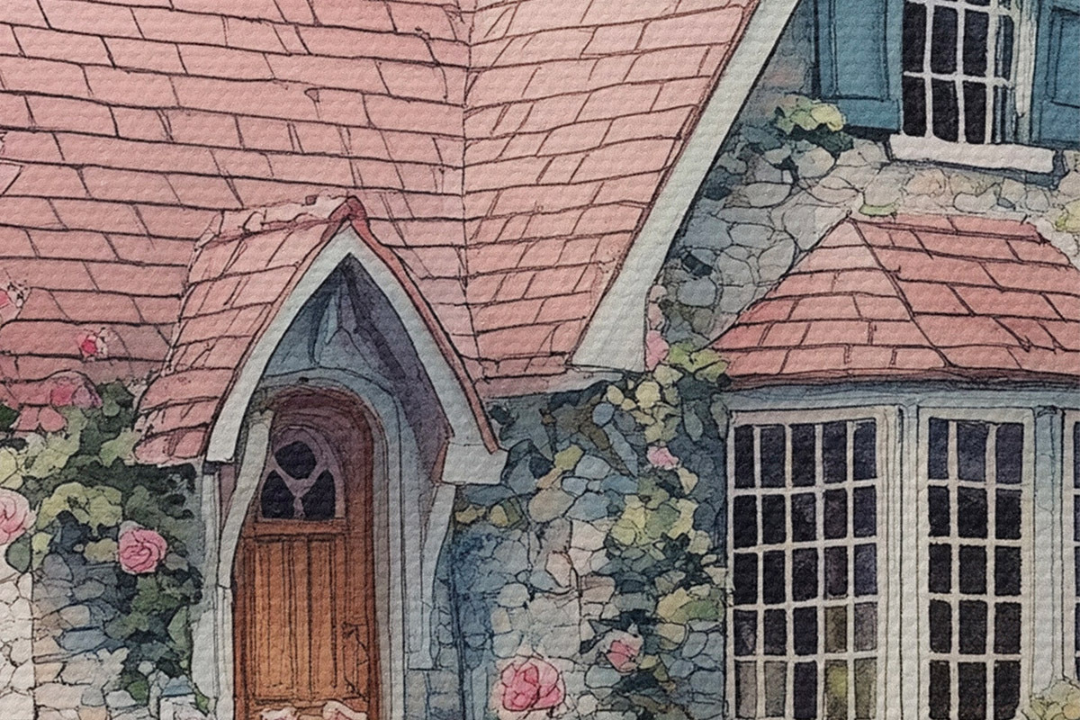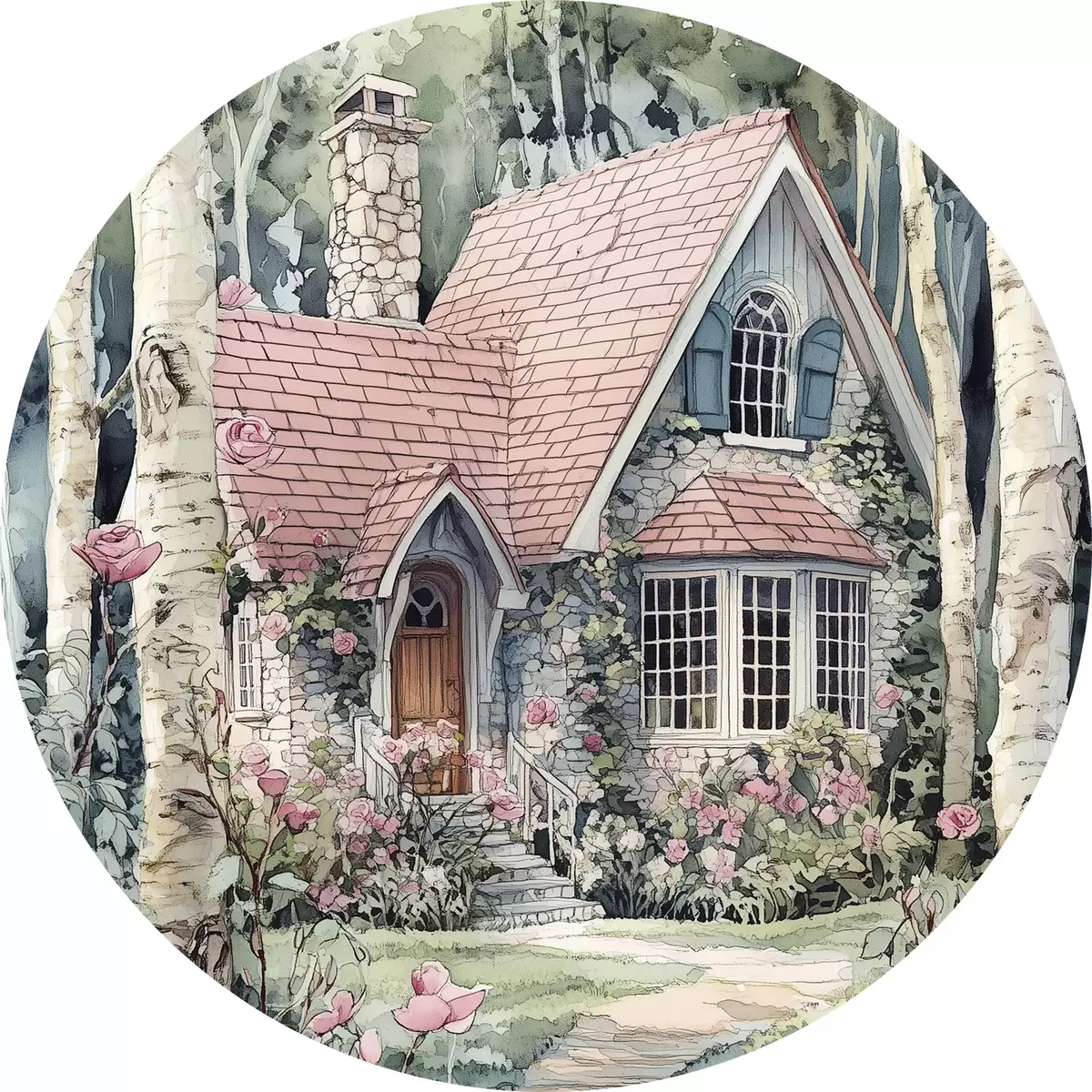 Picturi rotunde Casă frumoasă în copaci de mesteacăn, grădină de trandafiri Nr r44721