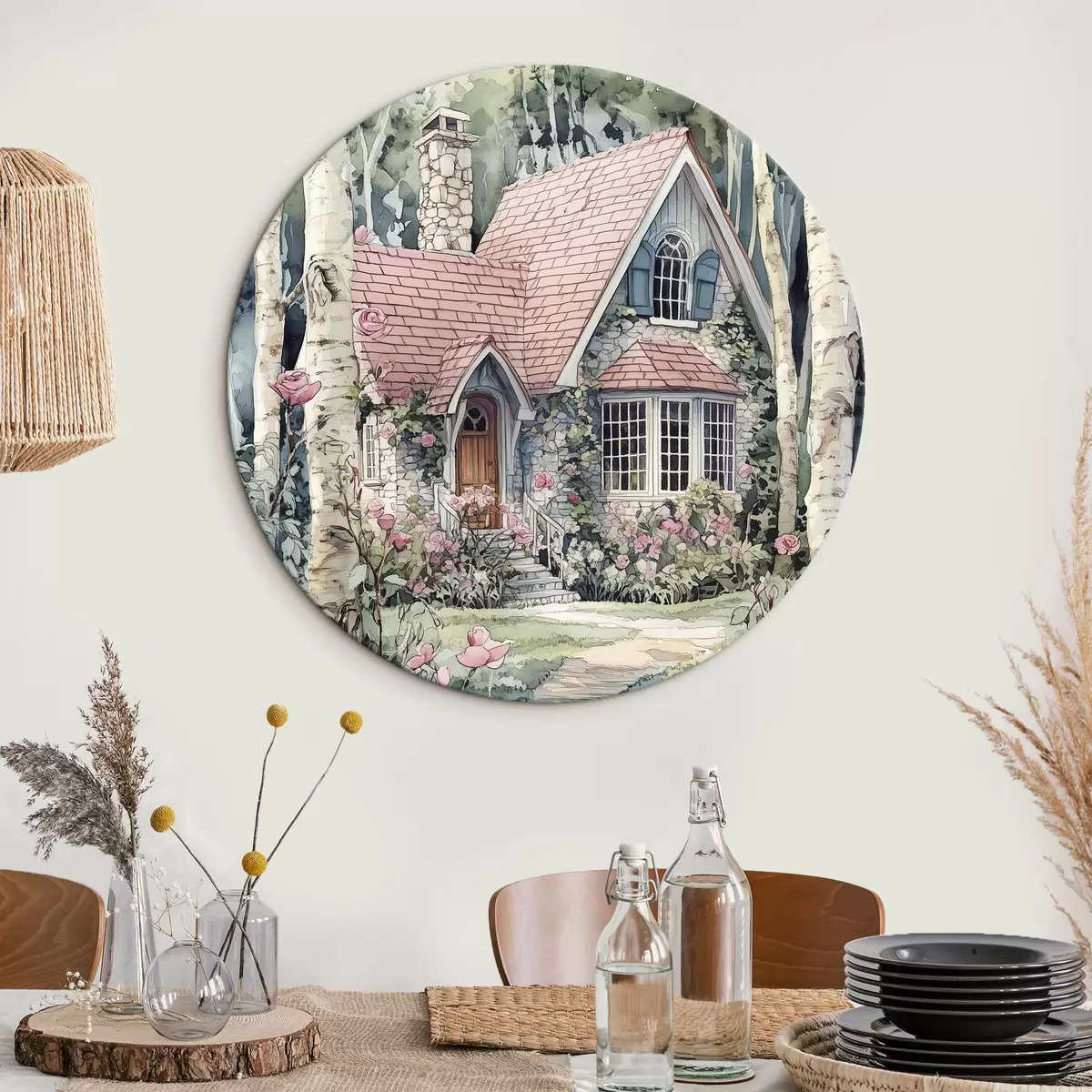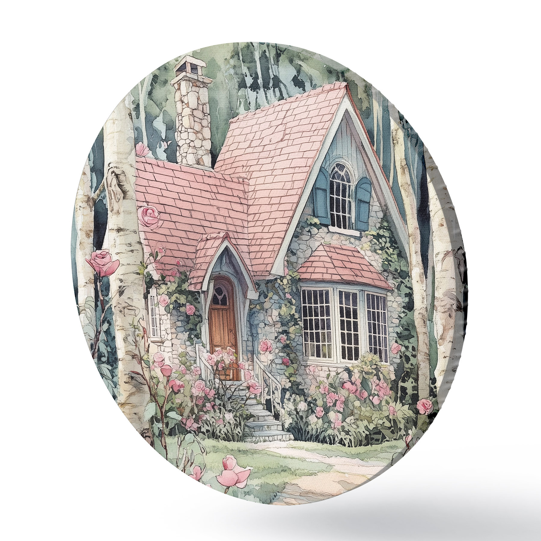 Picturi rotunde Casă frumoasă în copaci de mesteacăn, grădină de trandafiri r44721