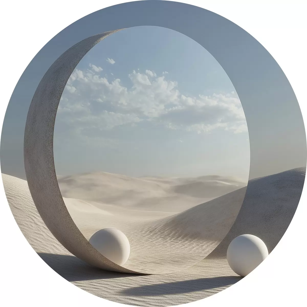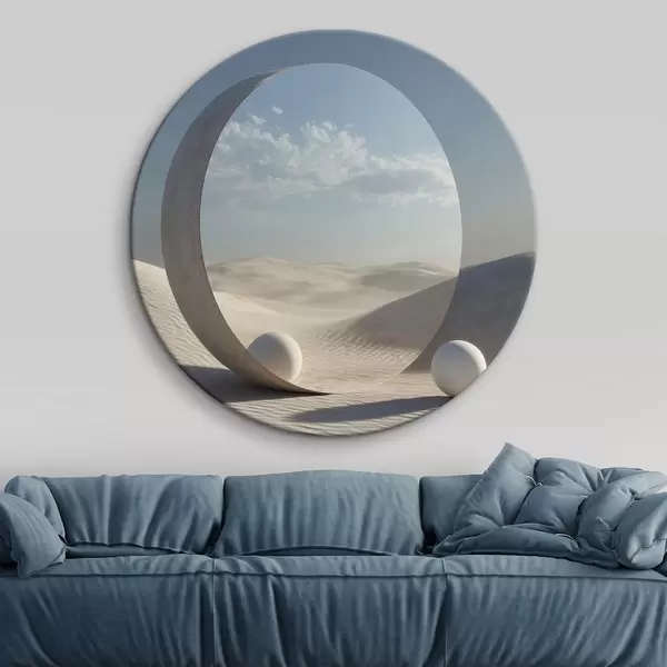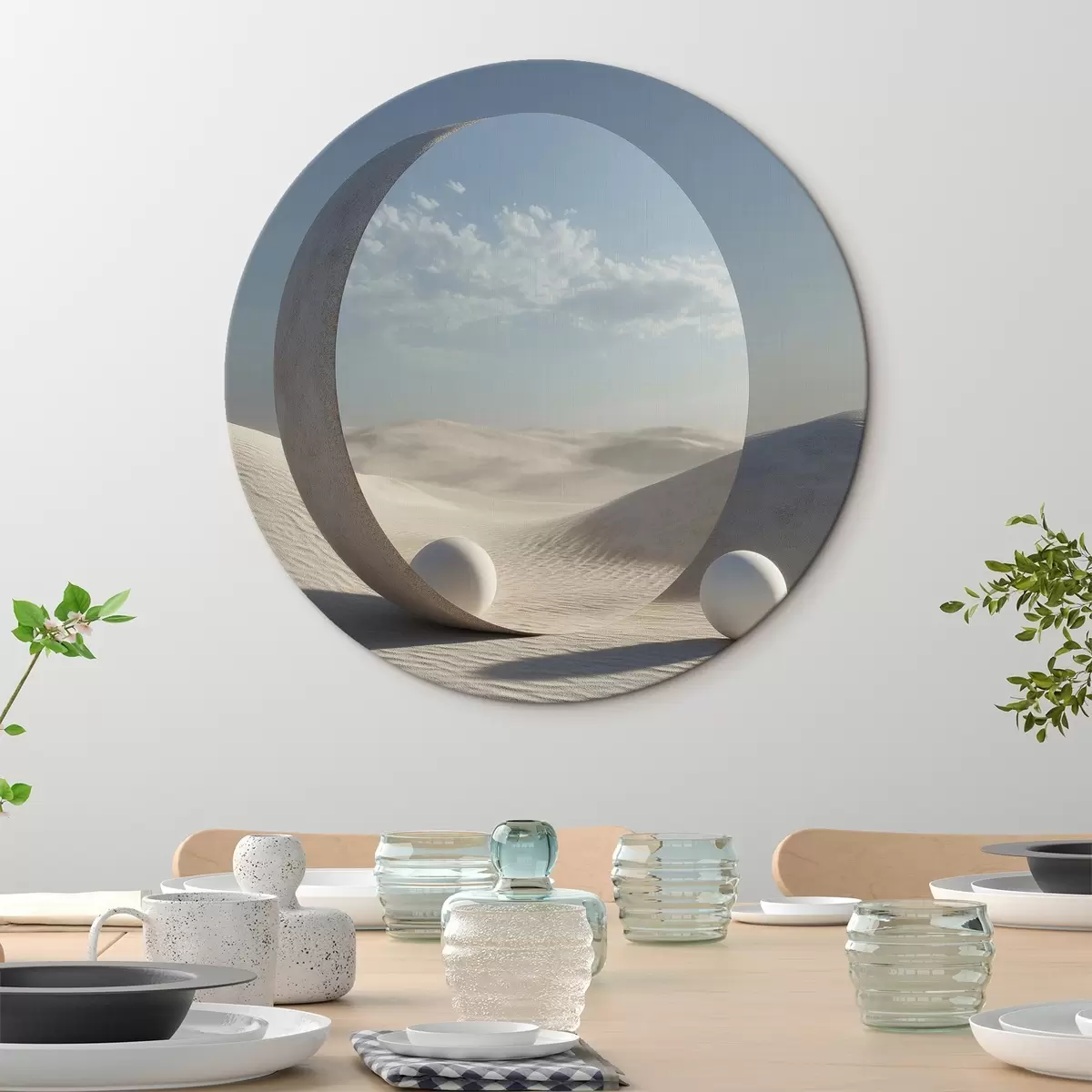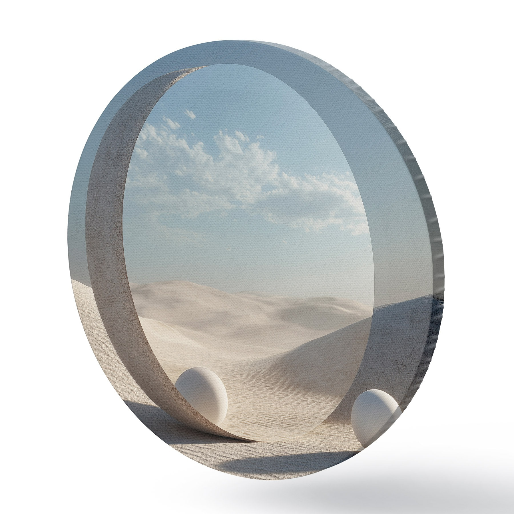 Picturi rotunde Peisaj deșertic suprarealist cu o oglindă rotundă care reflectă cerul și luna Nr r44792