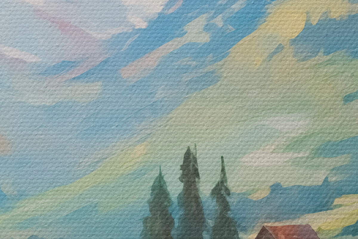 Țesătura fină a firelor de pe această pânză seamănă cu suprafața pânzelor artiștilor profesioniști.