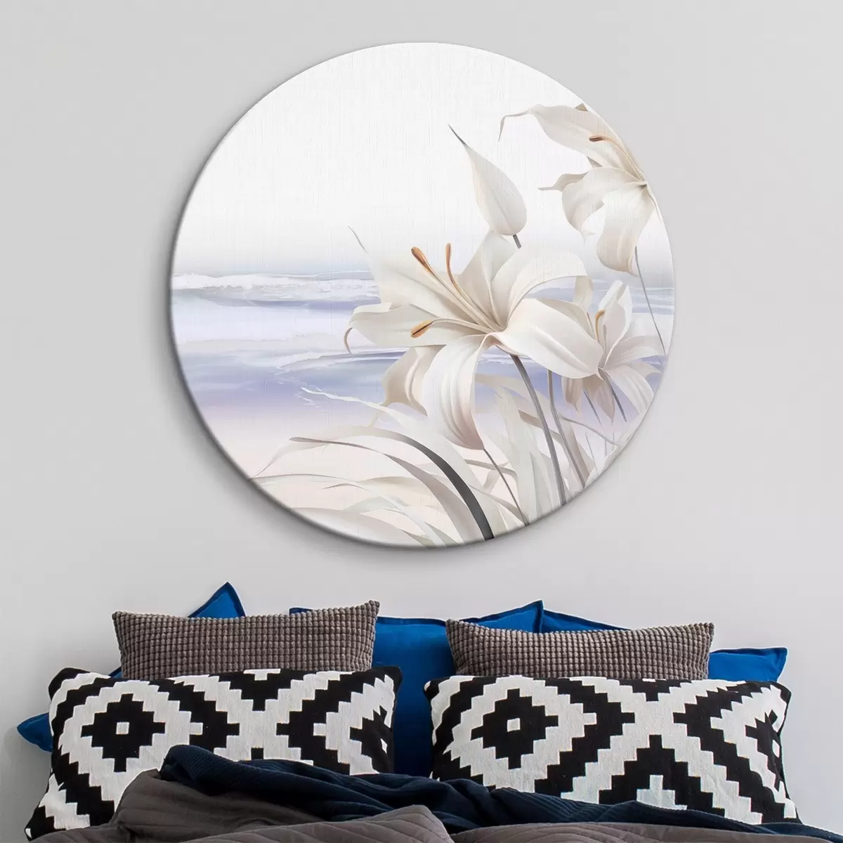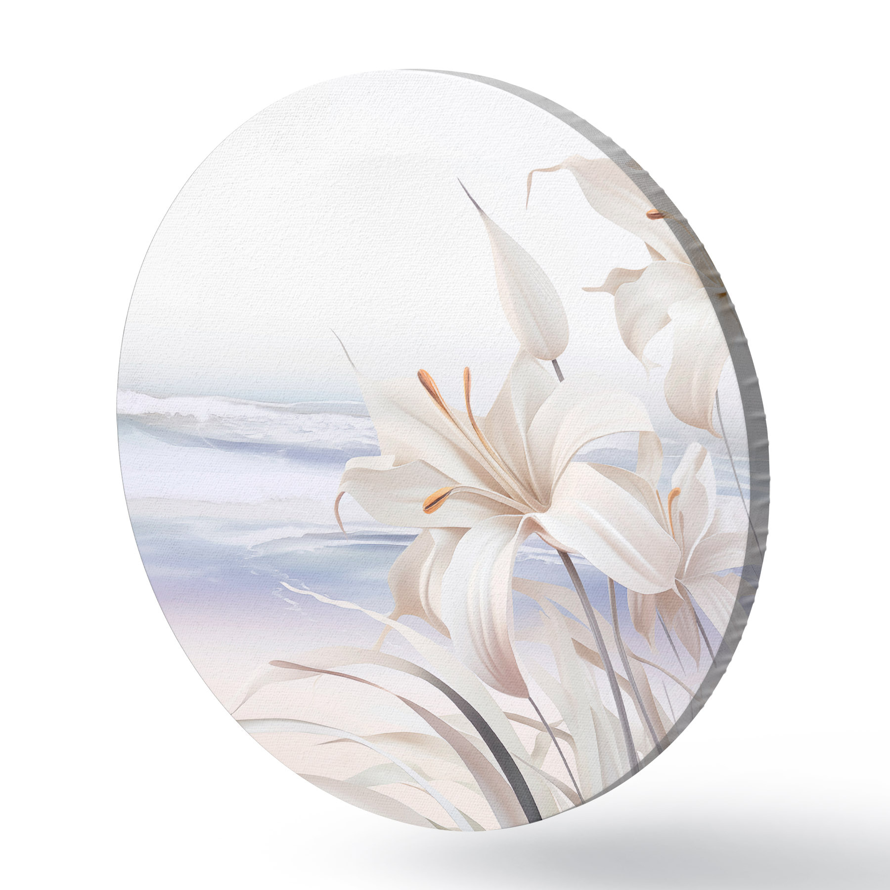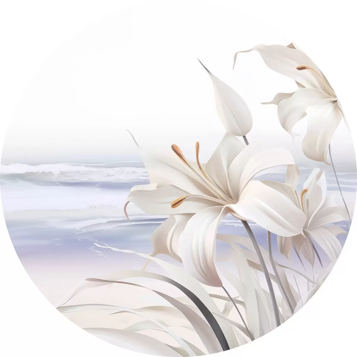 Picturi rotunde Crini albi cu pistil portocaliu și frunze lungi pe o plajă cu valuri moi în fundal, culori pastelate Nr r44850