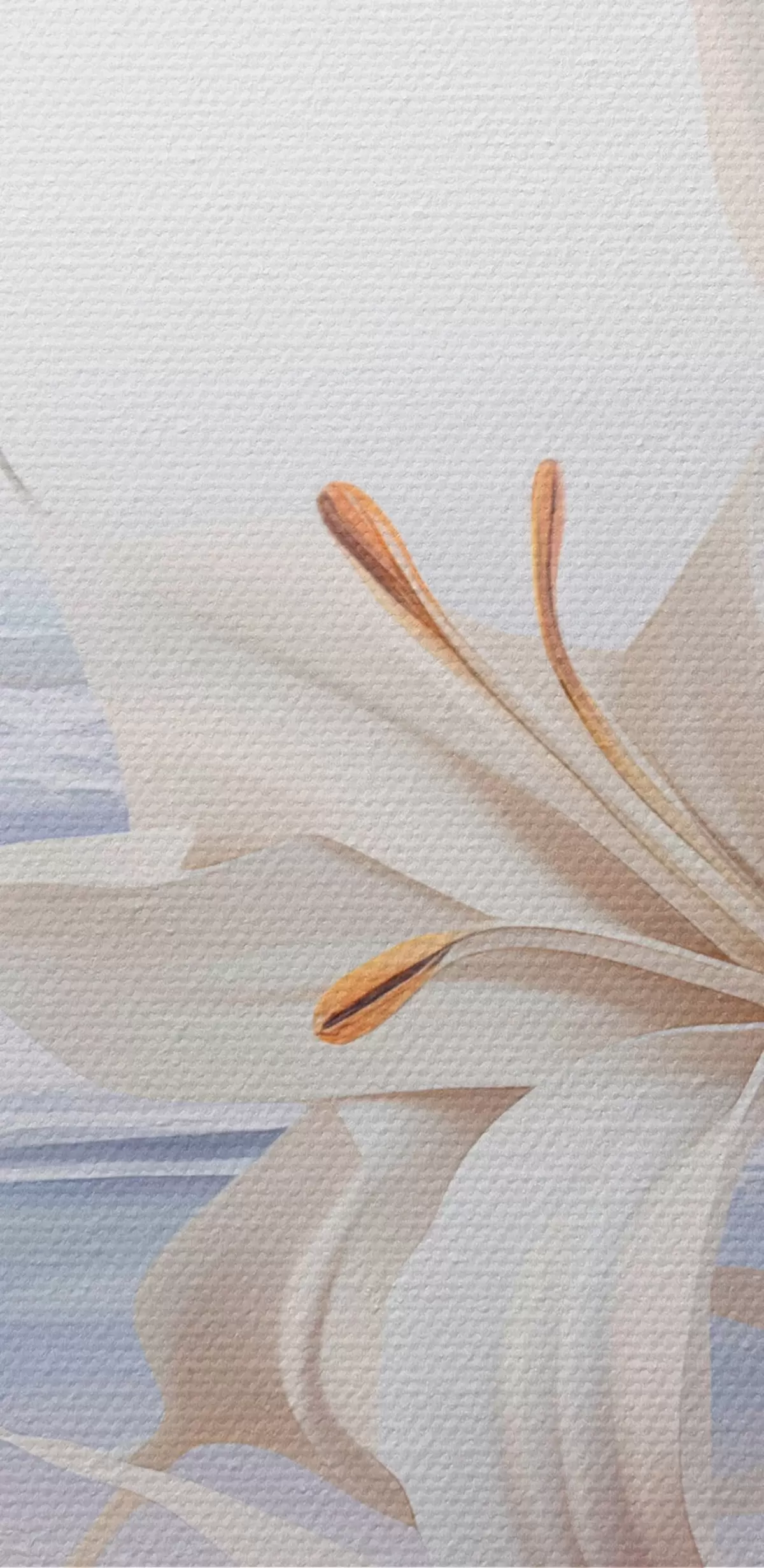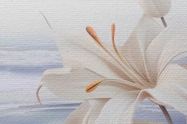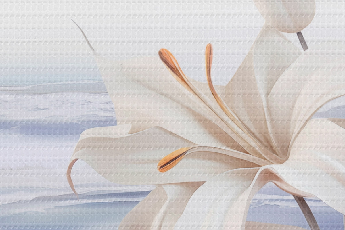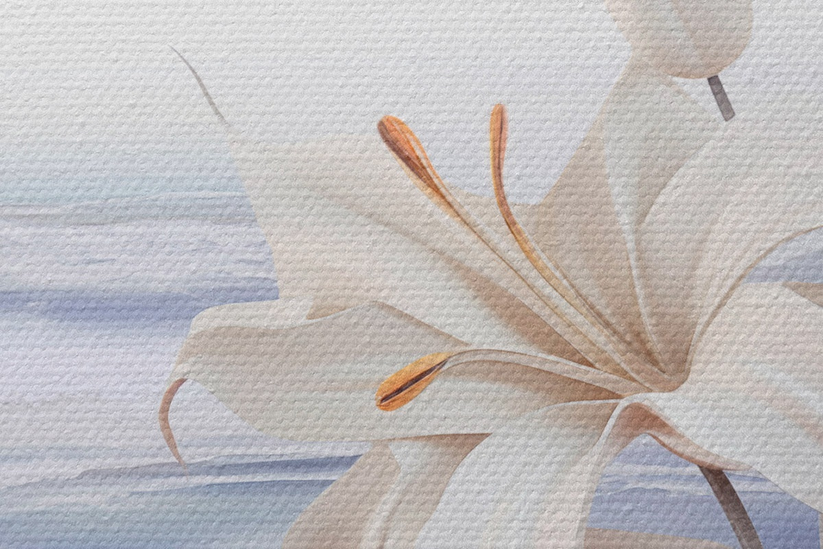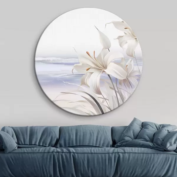 Picturi rotunde Crini albi cu pistil portocaliu și frunze lungi pe o plajă cu valuri moi în fundal, culori pastelate Nr r44850