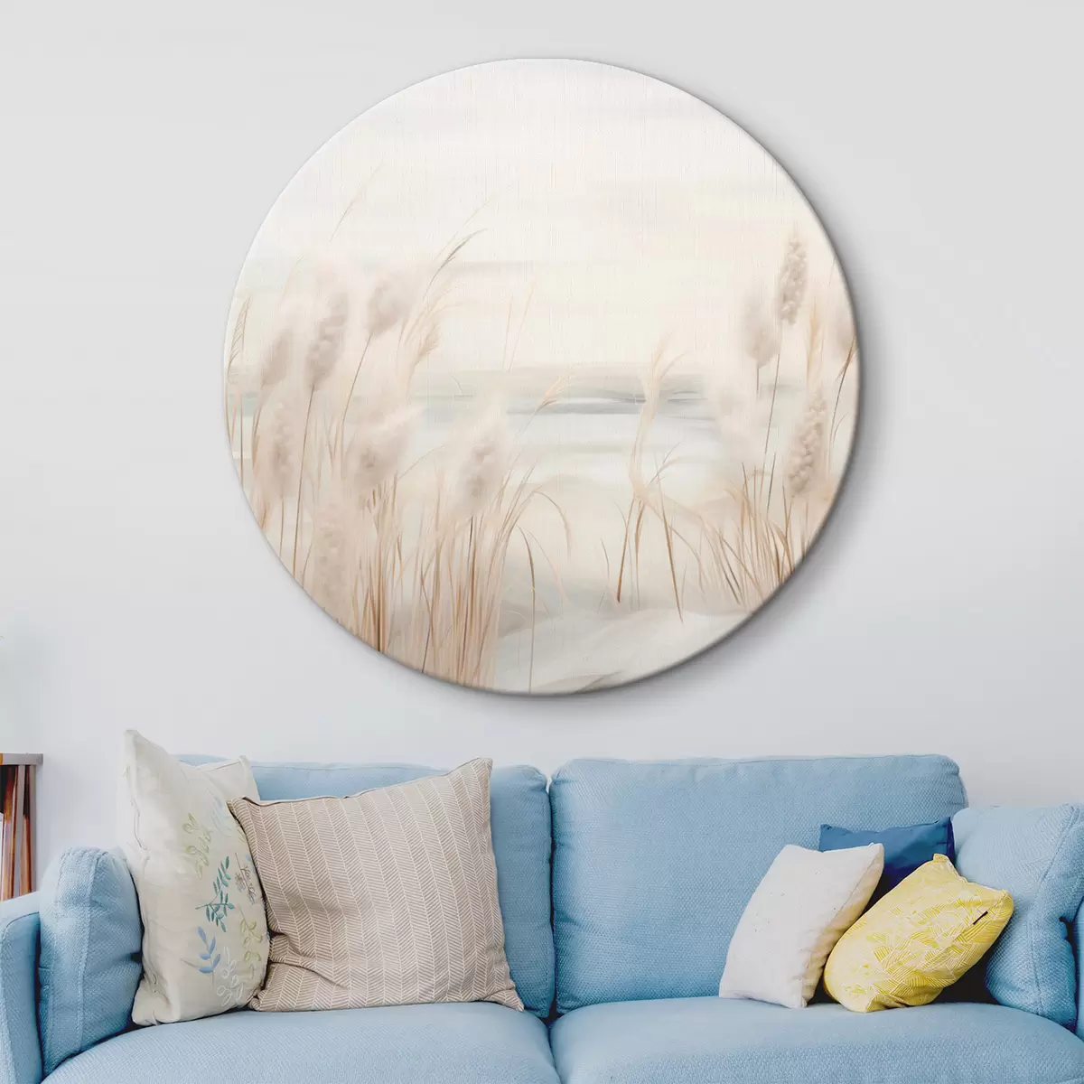 Picturi rotunde Reed bej în prim-plan, cu capete de semințe, moale și delicat , un fundal neclar și un cer deschis Nr r44851