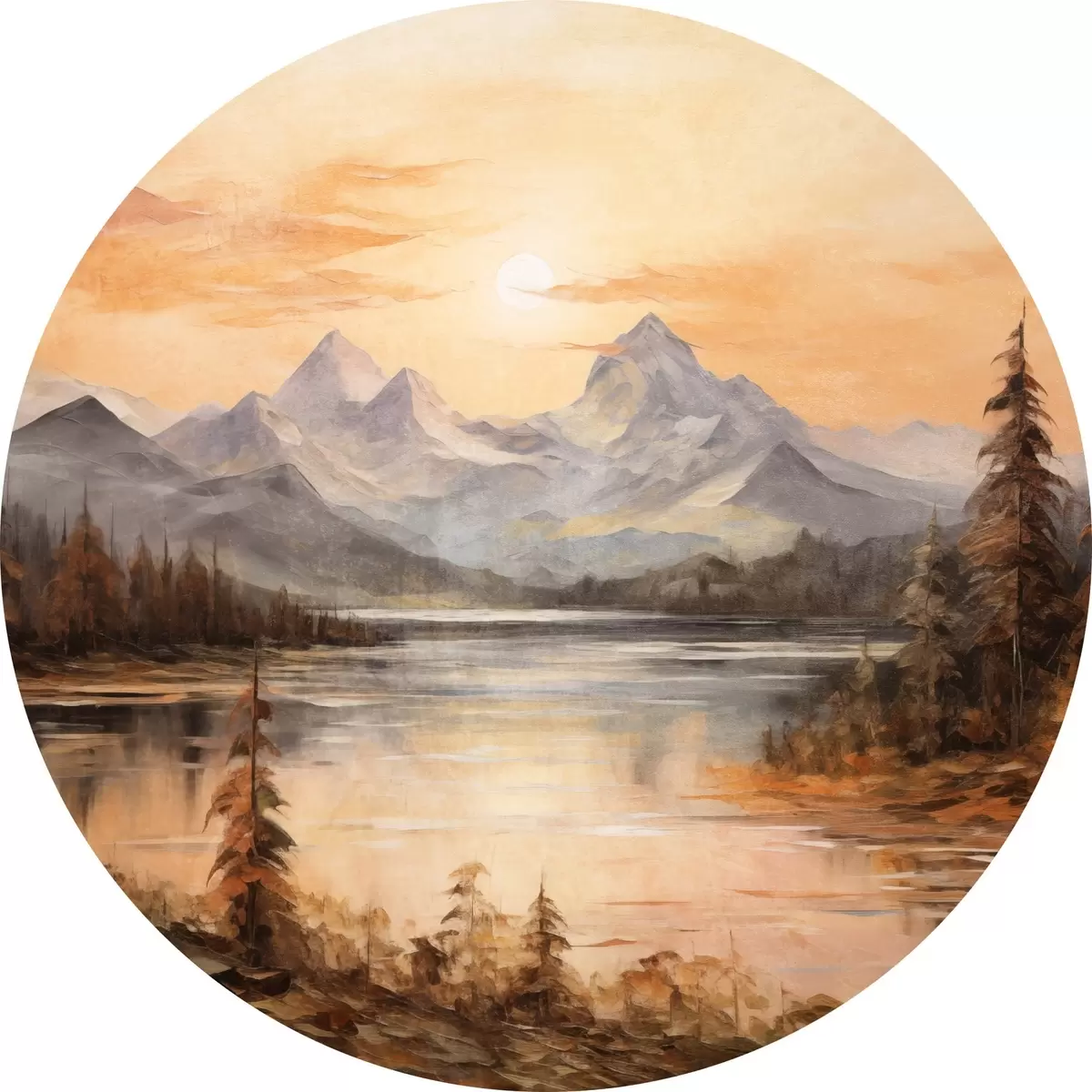 Picturi rotunde Peisaj cu un lac înconjurat de copaci și munți în fundal, cer portocaliu cu soare Nr r44857
