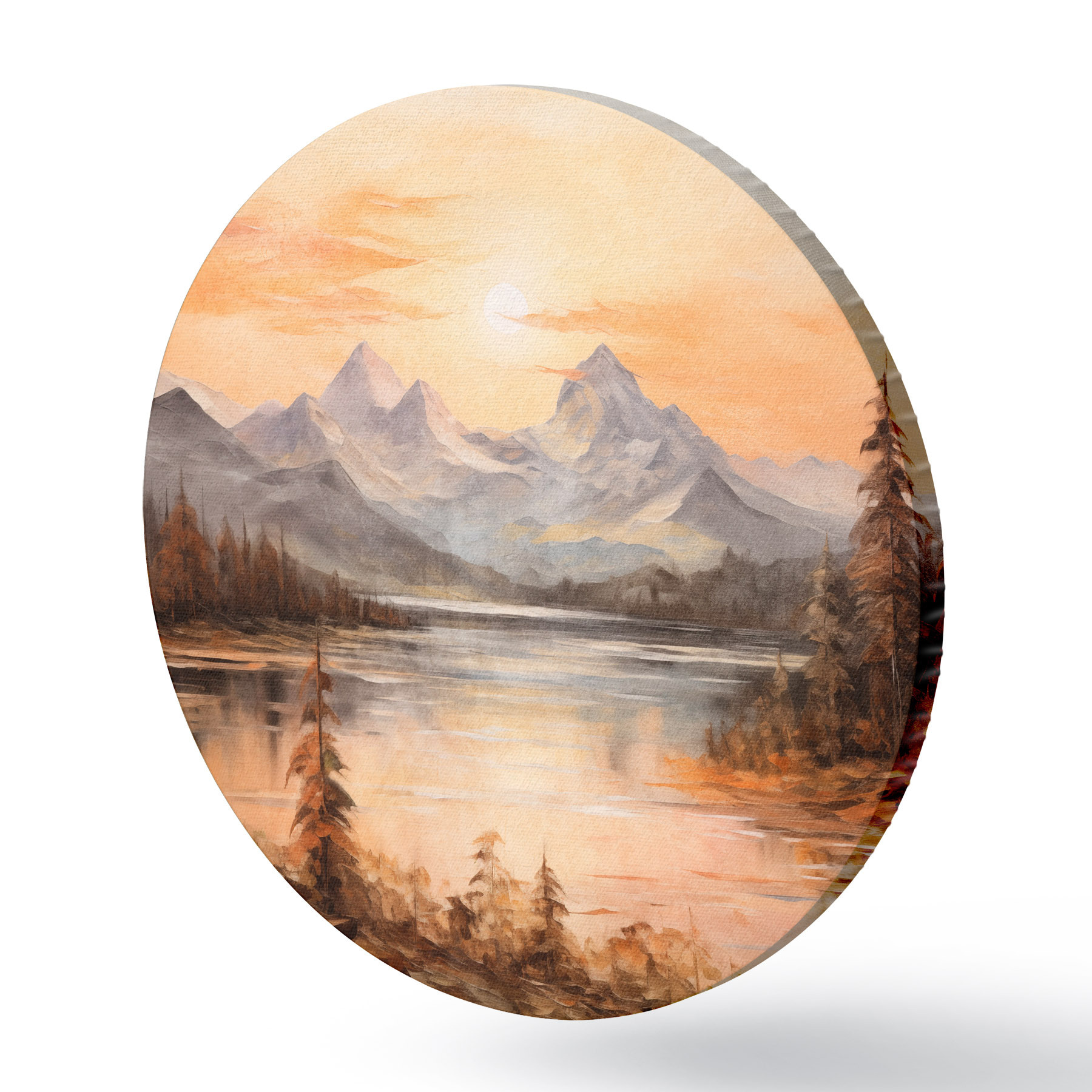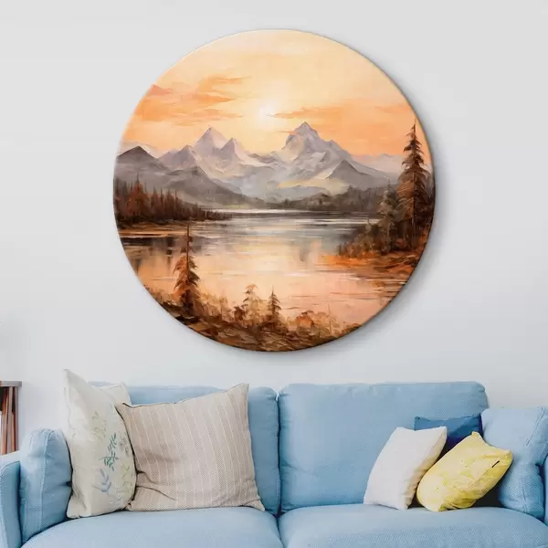 Picturi rotunde Peisaj cu un lac înconjurat de copaci și munți în fundal, cer portocaliu cu soare r44857