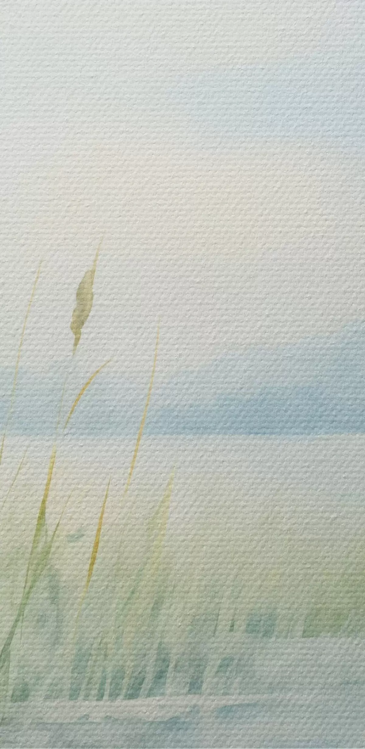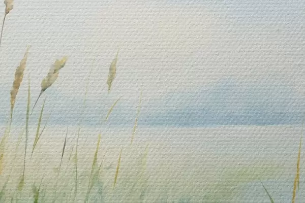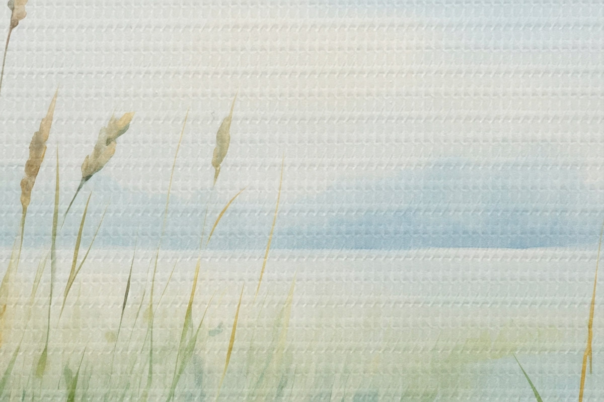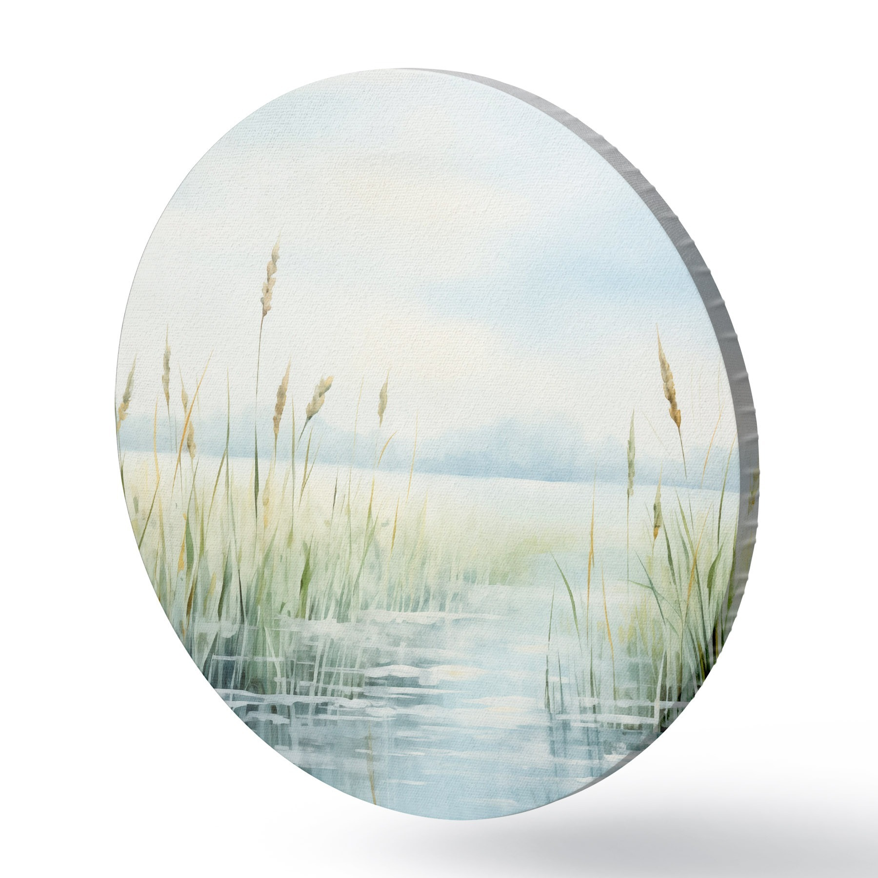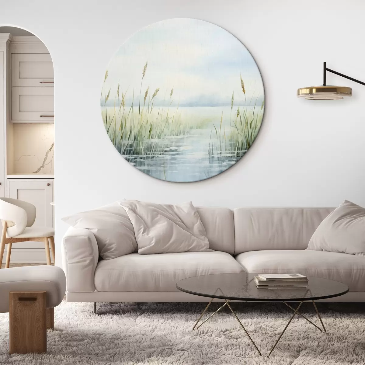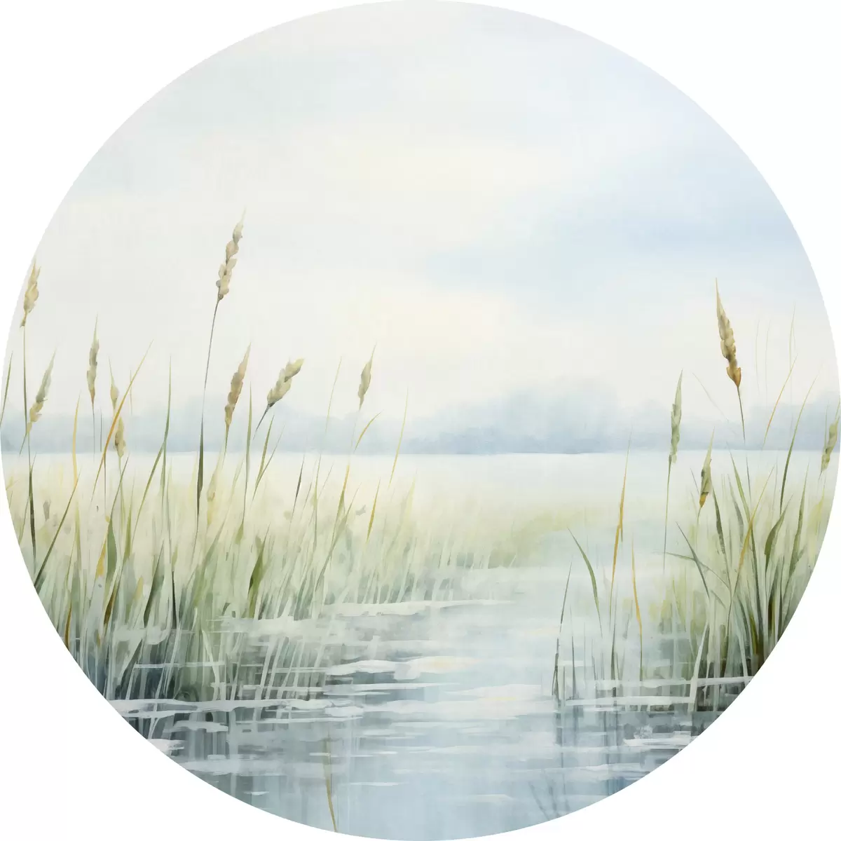Picturi rotunde O imitație de pictură acuarelă de iarbă înaltă în creștere lângă apă, cer acoperit de nori și fundal neclar Nr r44860