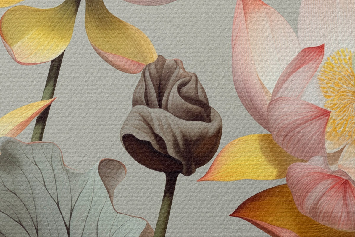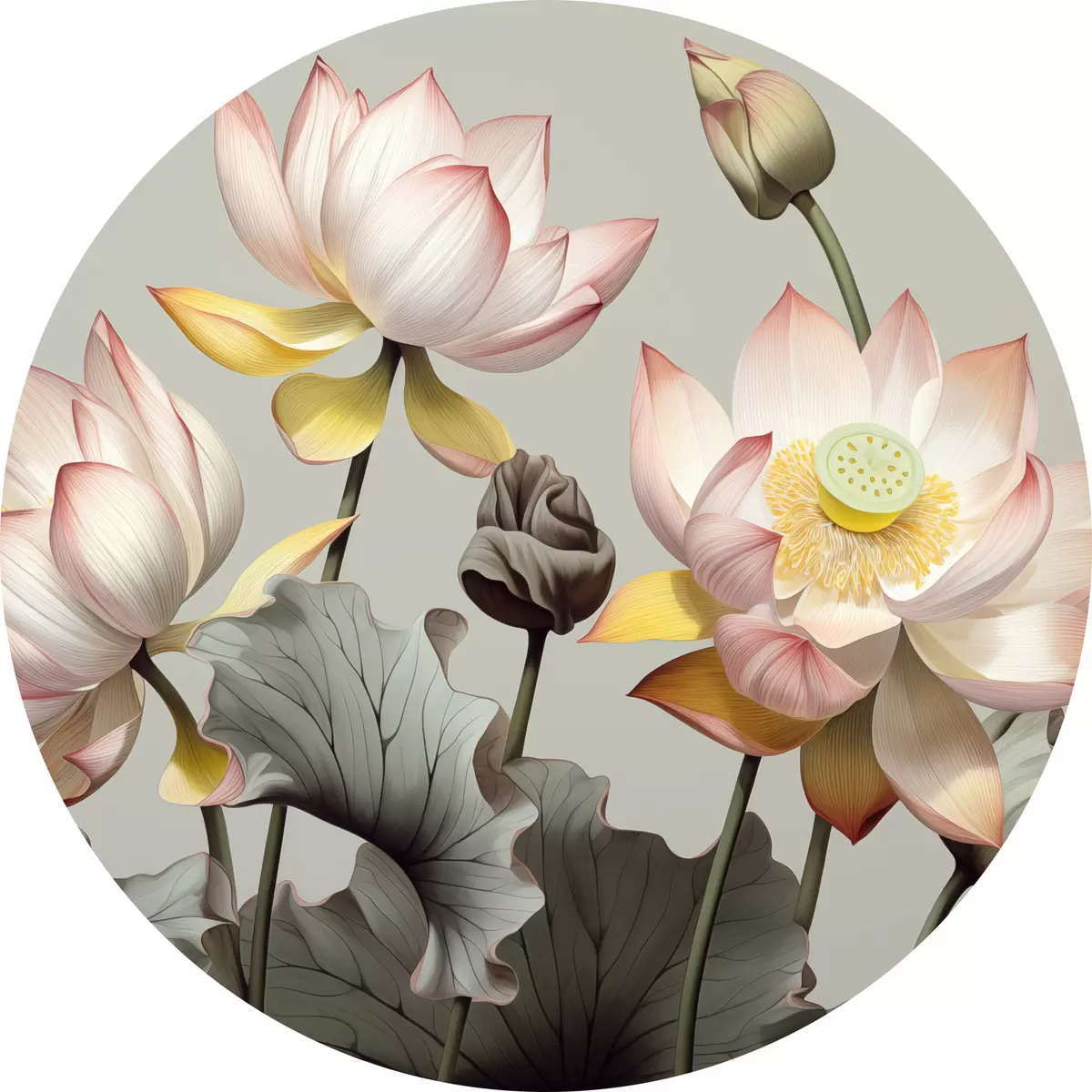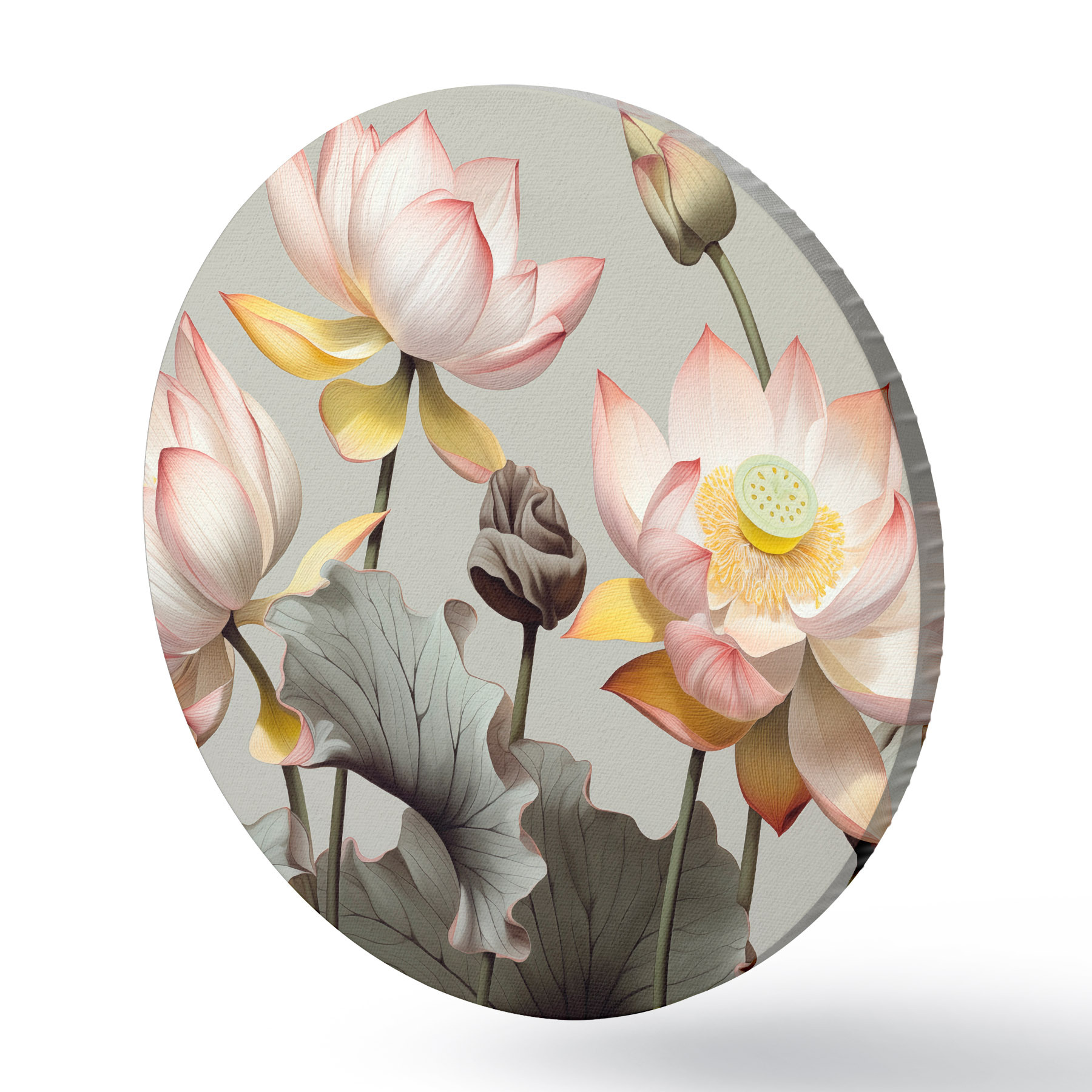 Picturi rotunde Flori de lotus cu petale pastelate și frunze verzi, într-o paletă de culori atenuate, pe un fundal simplu r44862