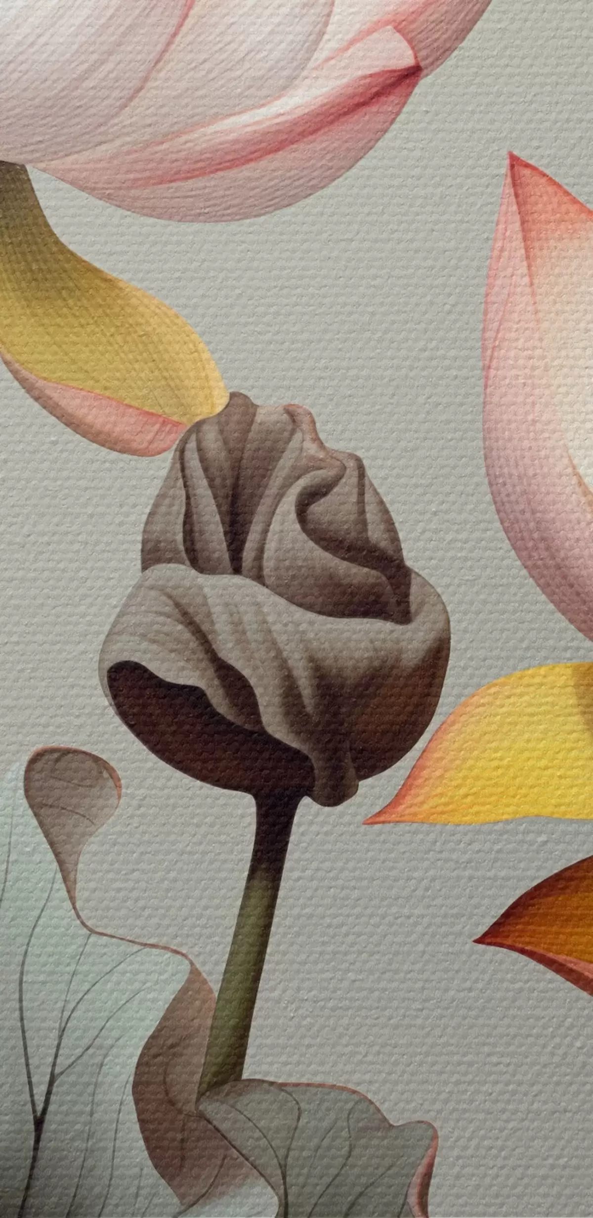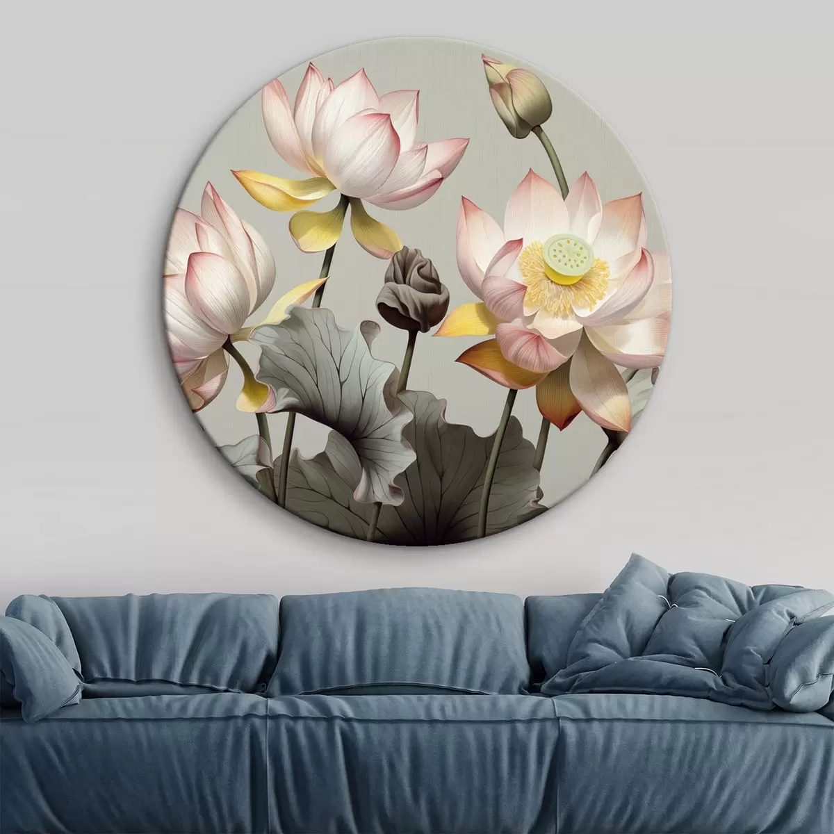 Picturi rotunde Flori de lotus cu petale pastelate și frunze verzi, într-o paletă de culori atenuate, pe un fundal simplu Nr r44862
