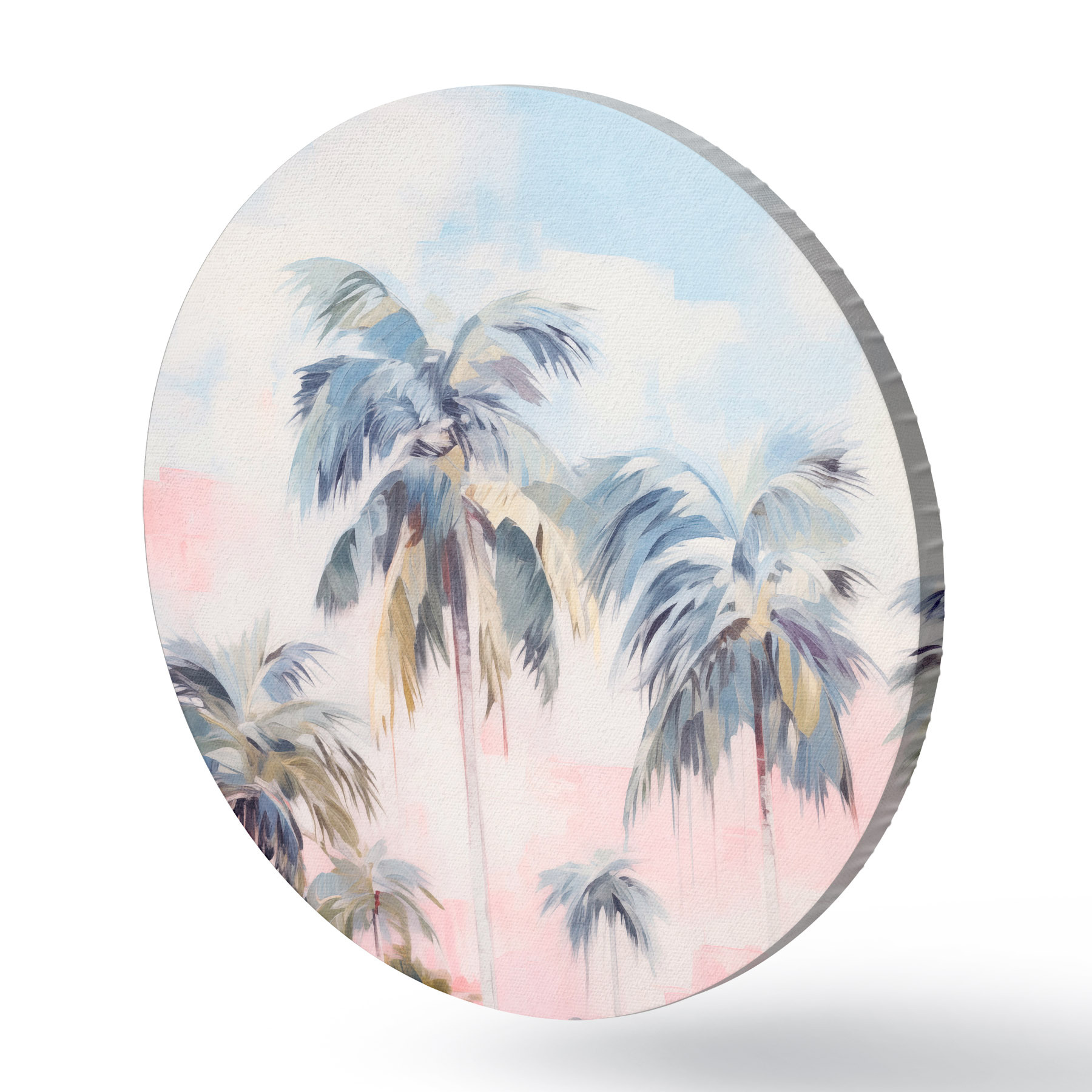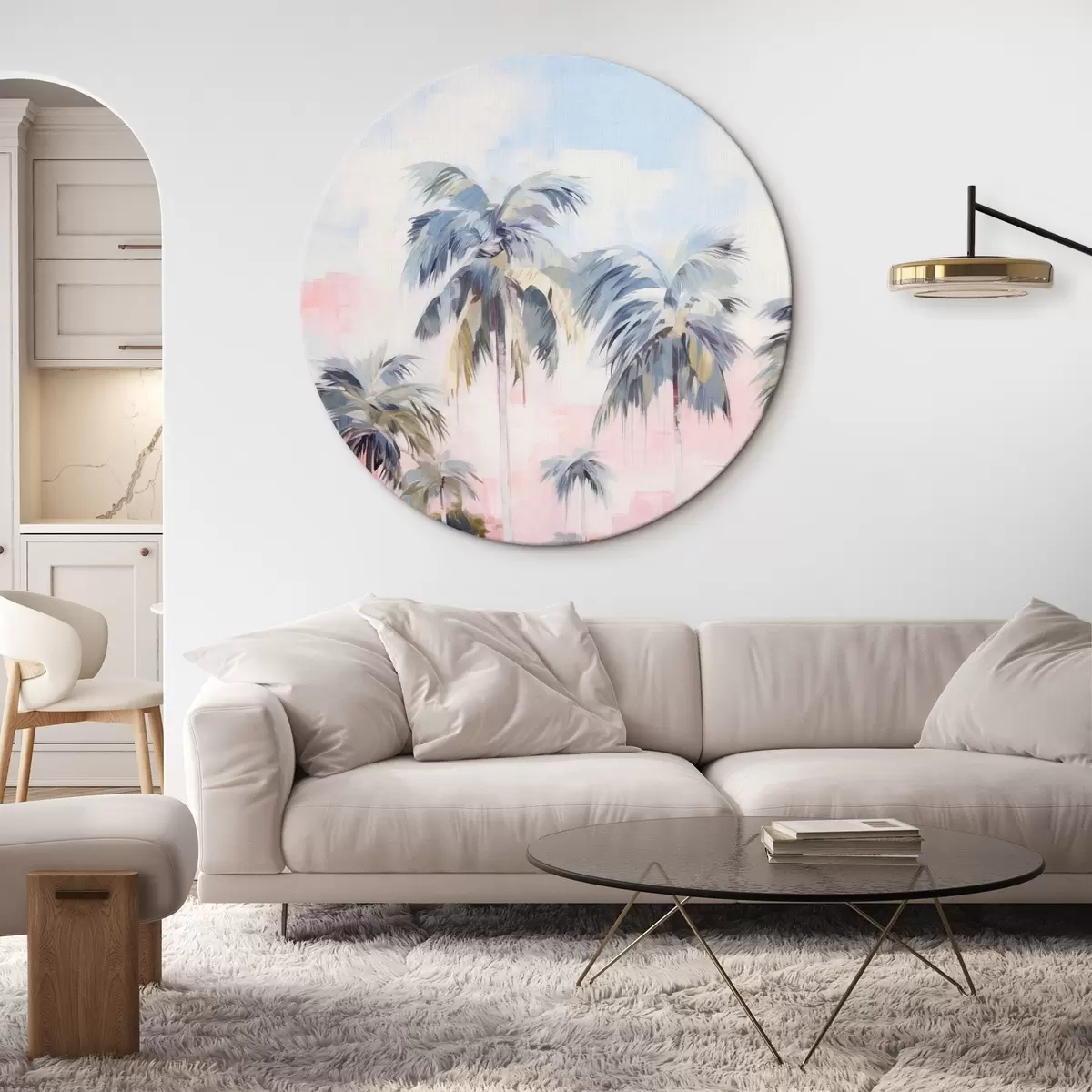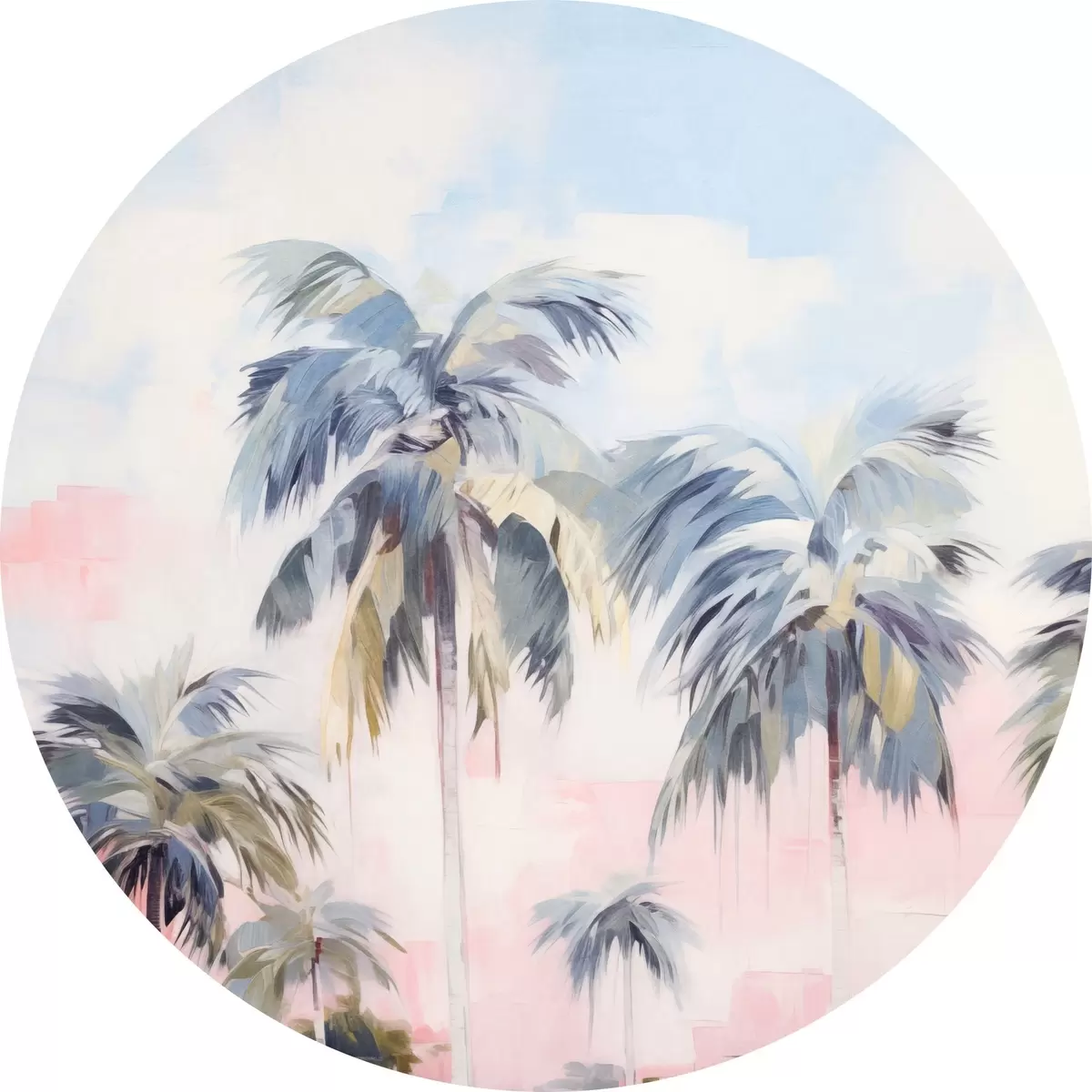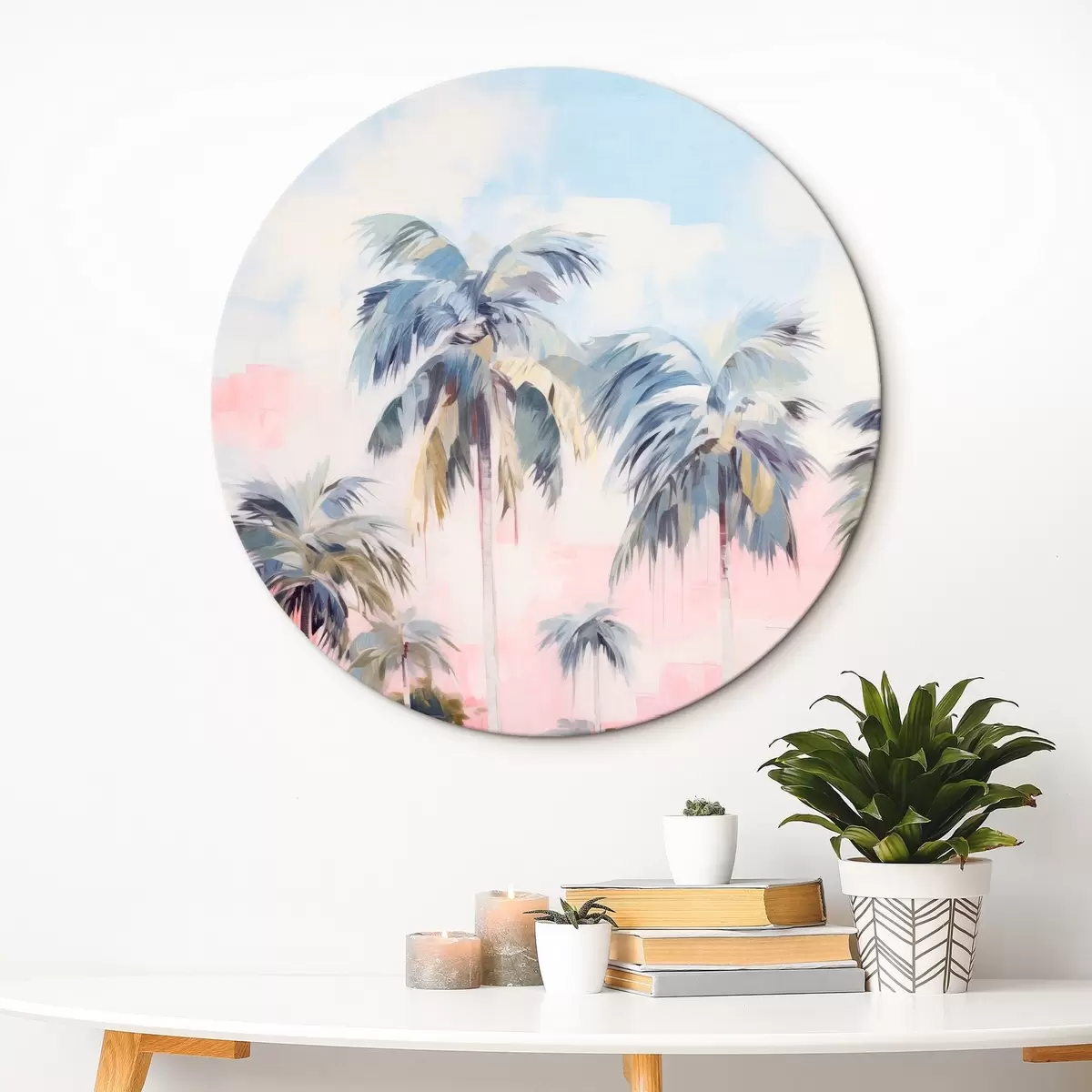 Picturi rotunde Palmieri cu frunze de culori pastelate și trunchiuri maro, cer roz și albastru, mediu tropical Nr r44866