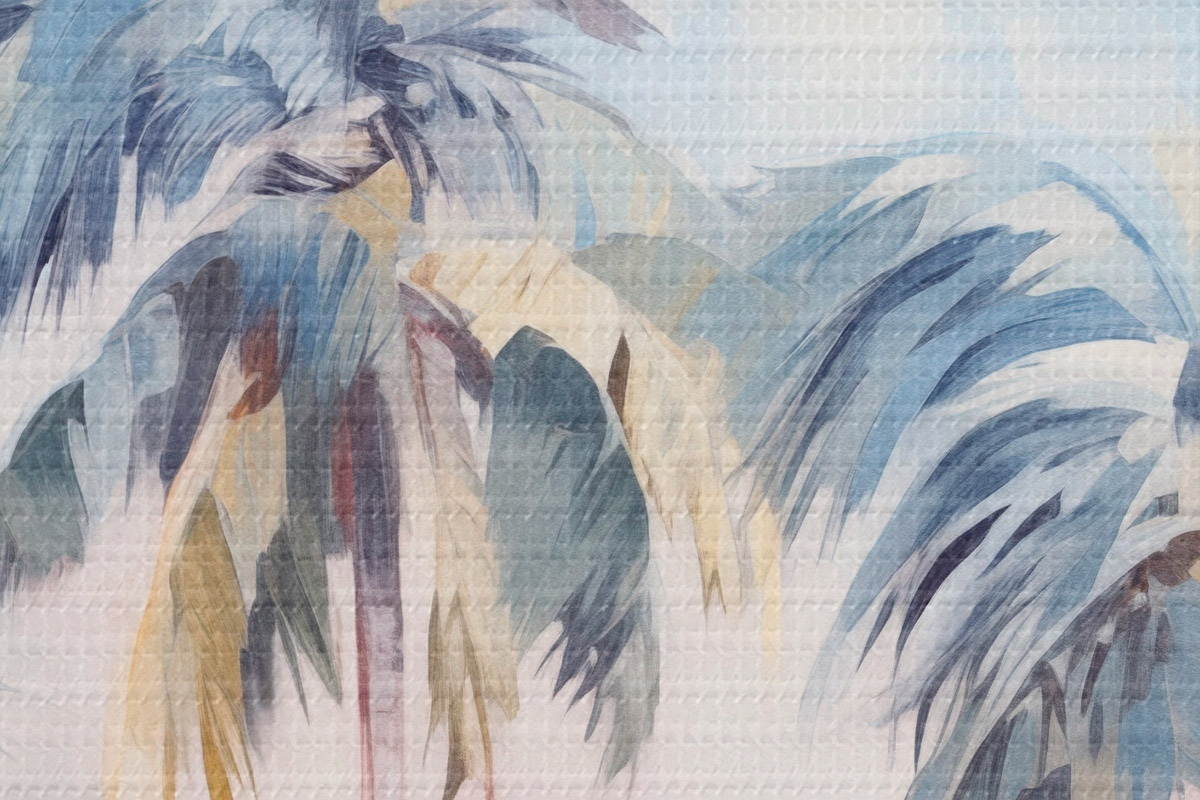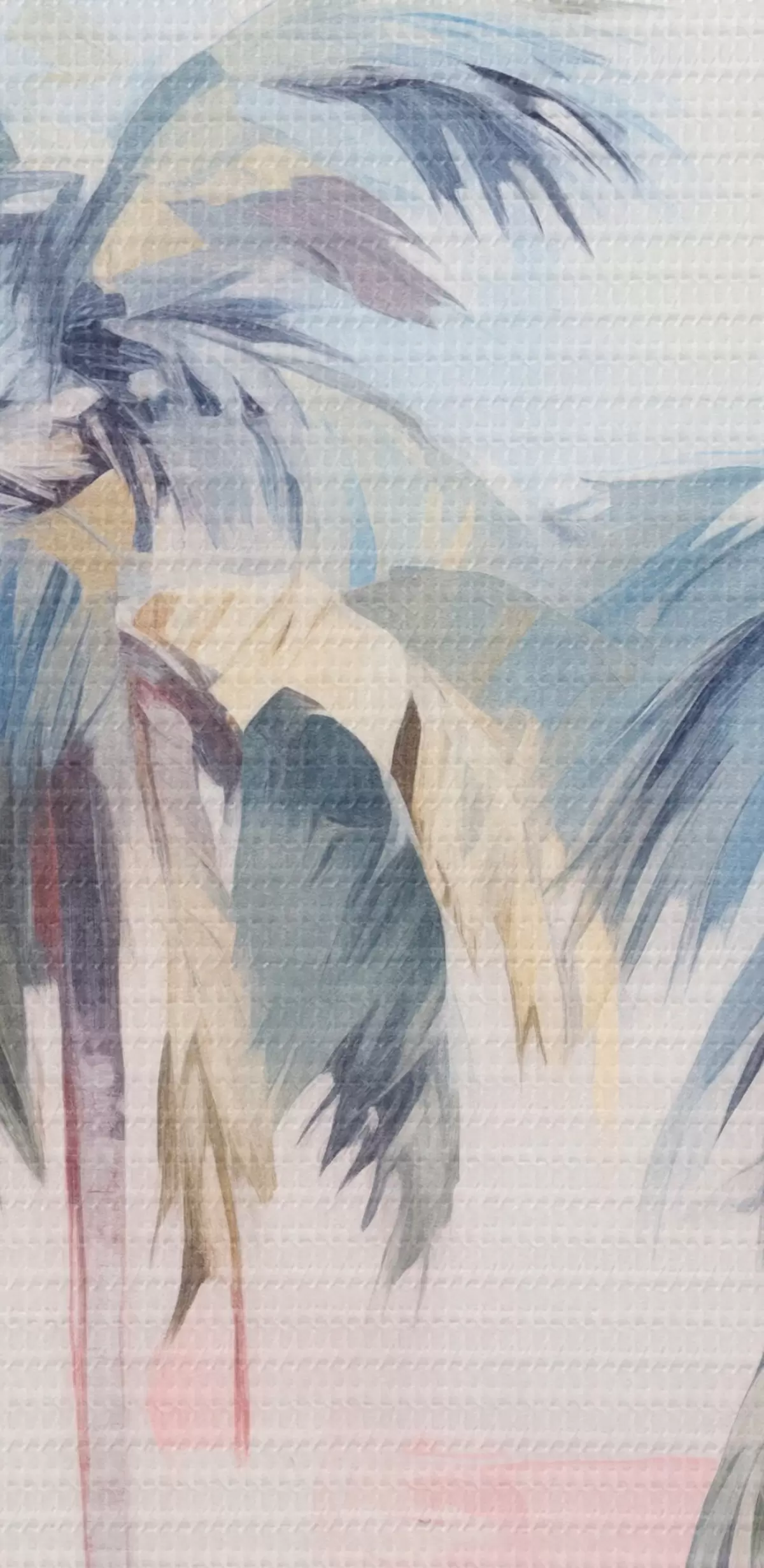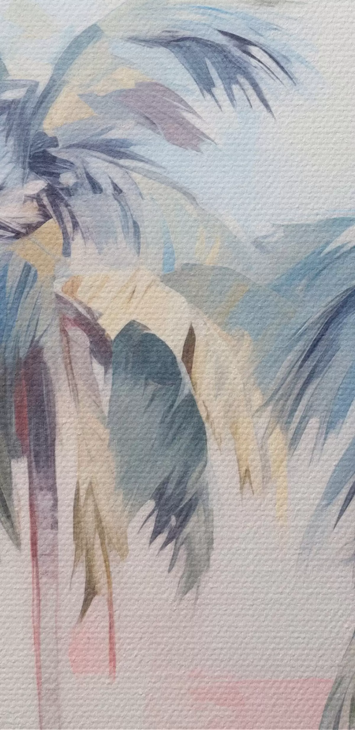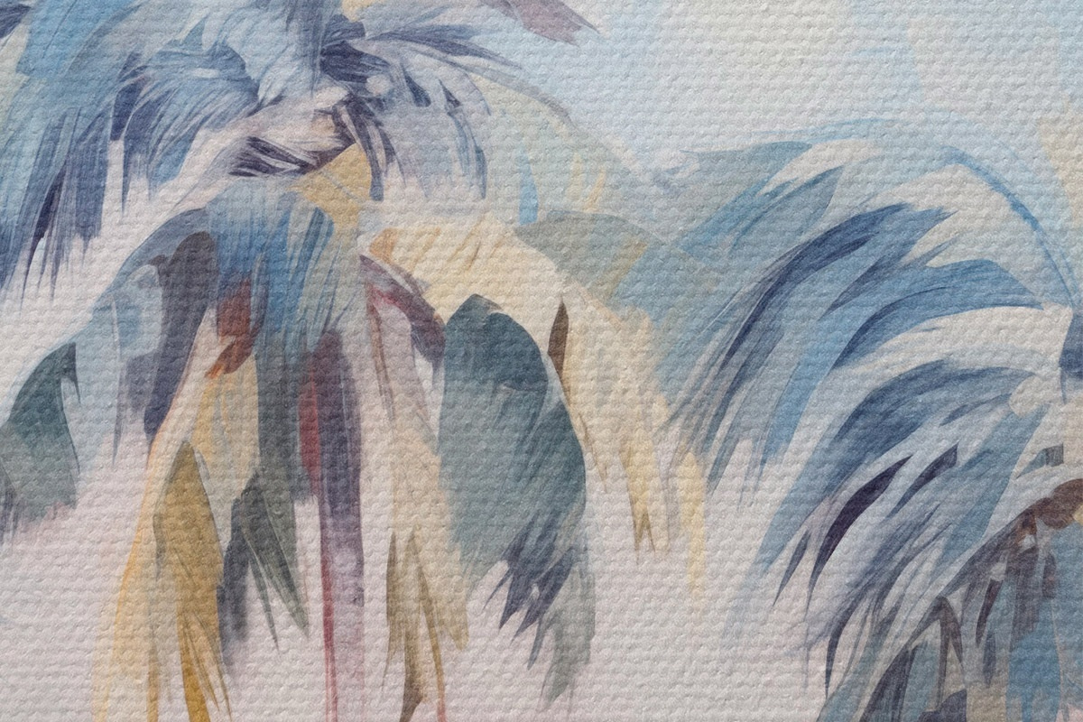 Picturi rotunde Palmieri cu frunze de culori pastelate și trunchiuri maro, cer roz și albastru, mediu tropical r44866