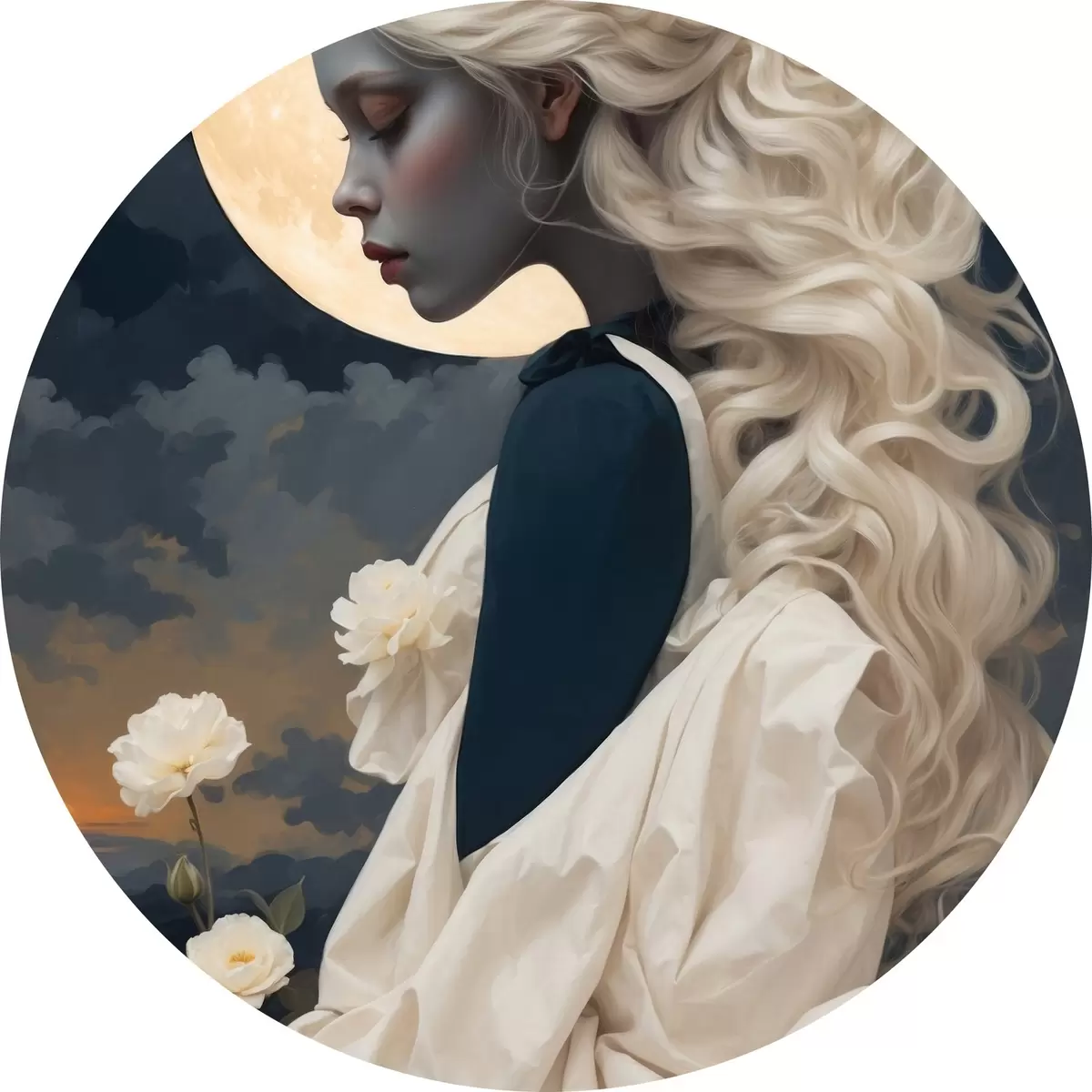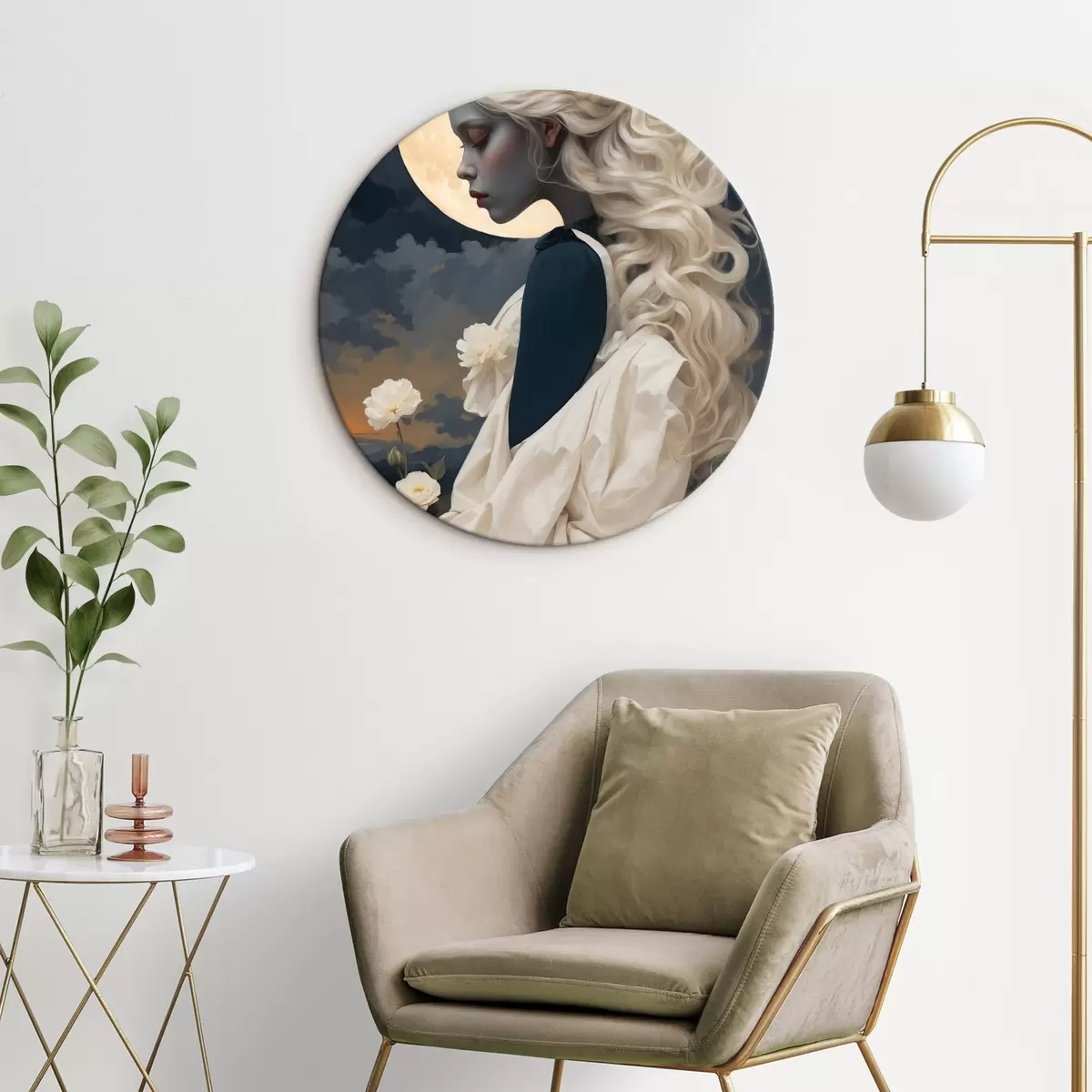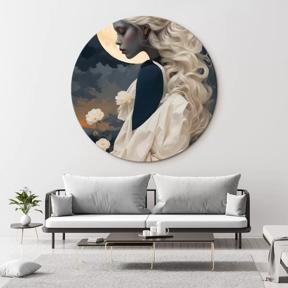 Picturi rotunde Portret de fată cu păr alb și lună plină Nr r44887