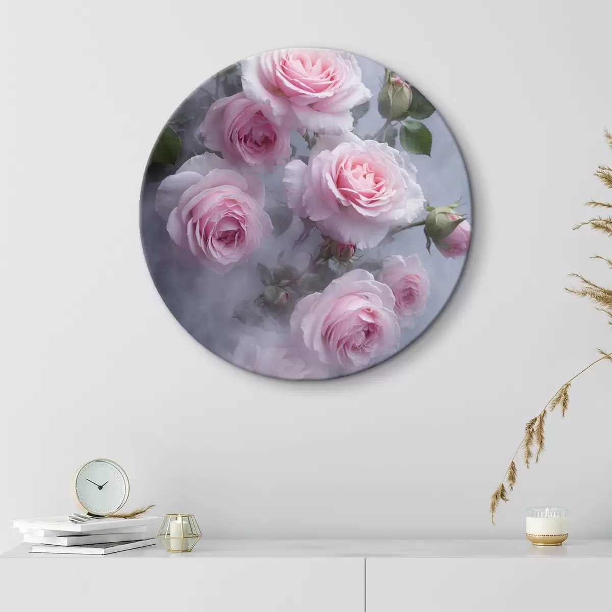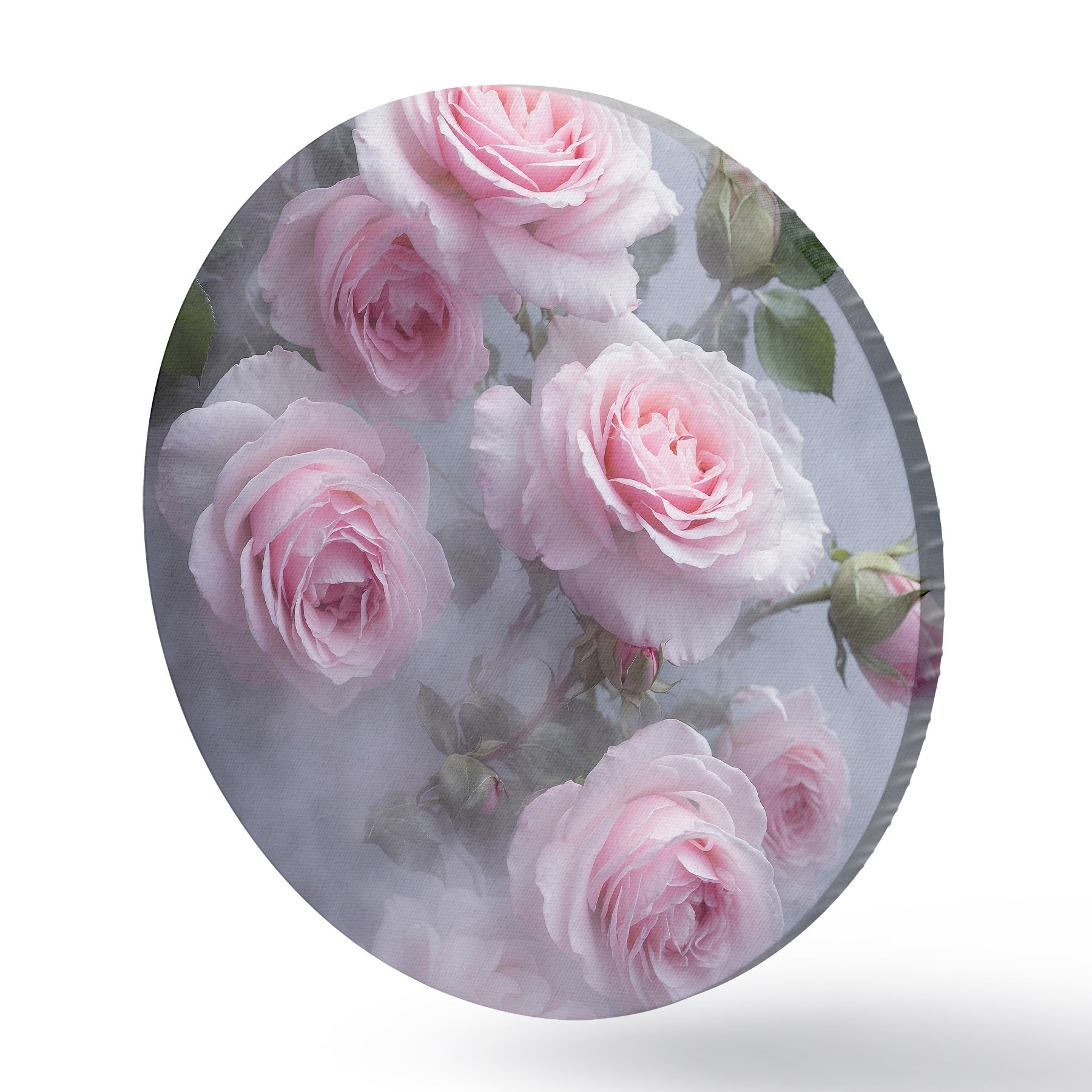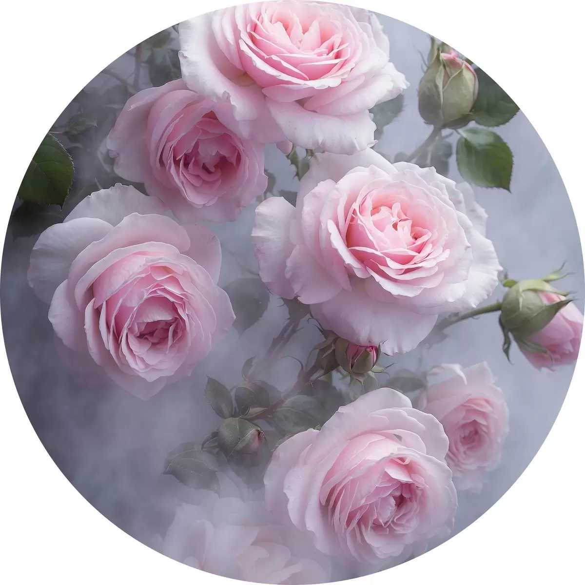 Picturi rotunde Trandafiri roz moale în ceață cu frunze verzi Nr r44892