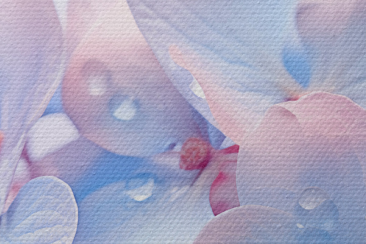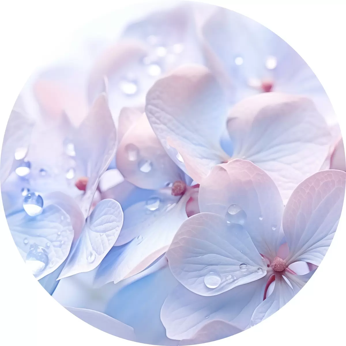 Picturi rotunde Flori de hortensie cu picături de apă pe petale delicate, culori pastelate moi, nuanțe de albastru deschis și roz r44929