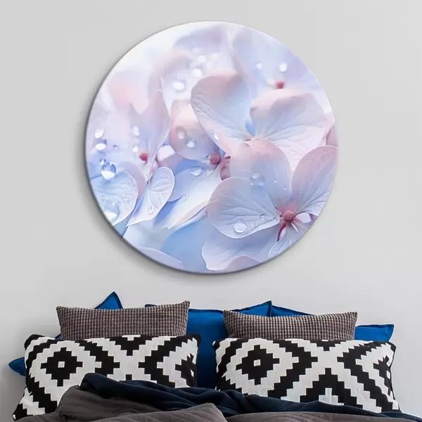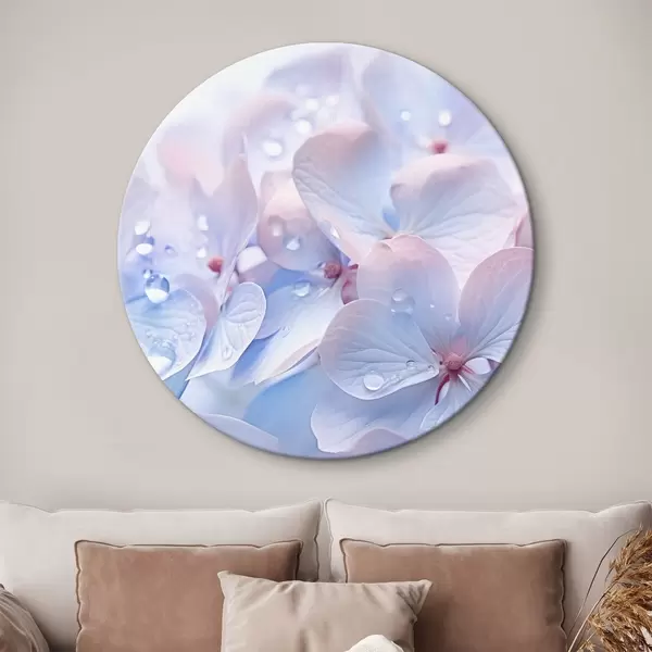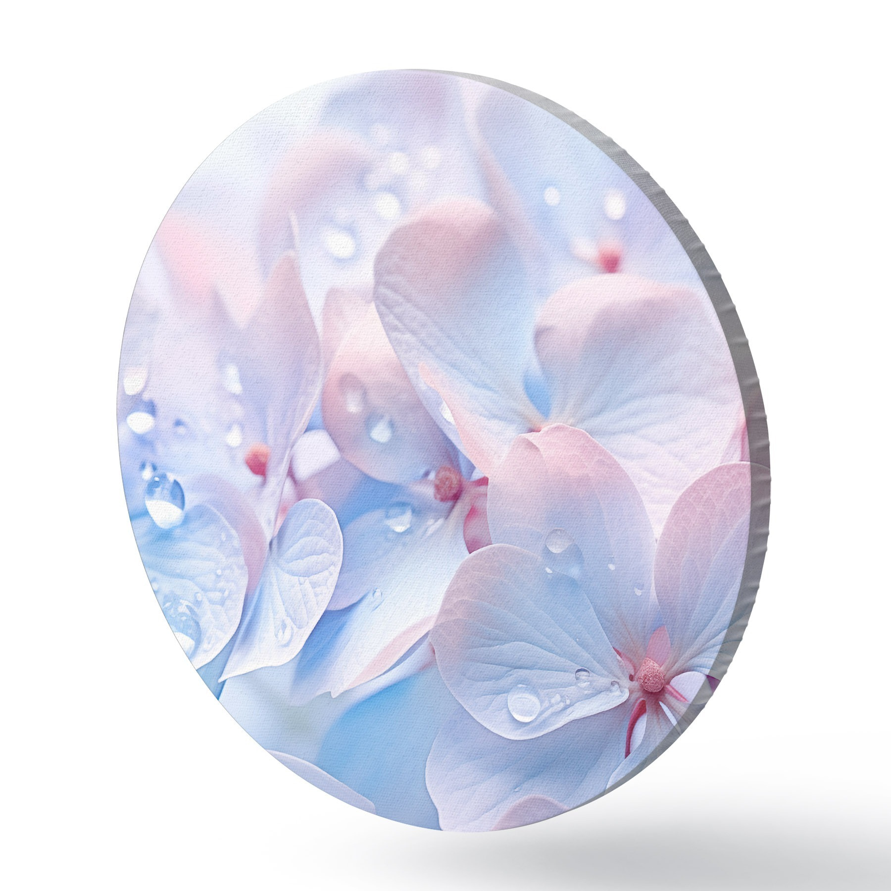 Picturi rotunde Flori de hortensie cu picături de apă pe petale delicate, culori pastelate moi, nuanțe de albastru deschis și roz Nr r44929