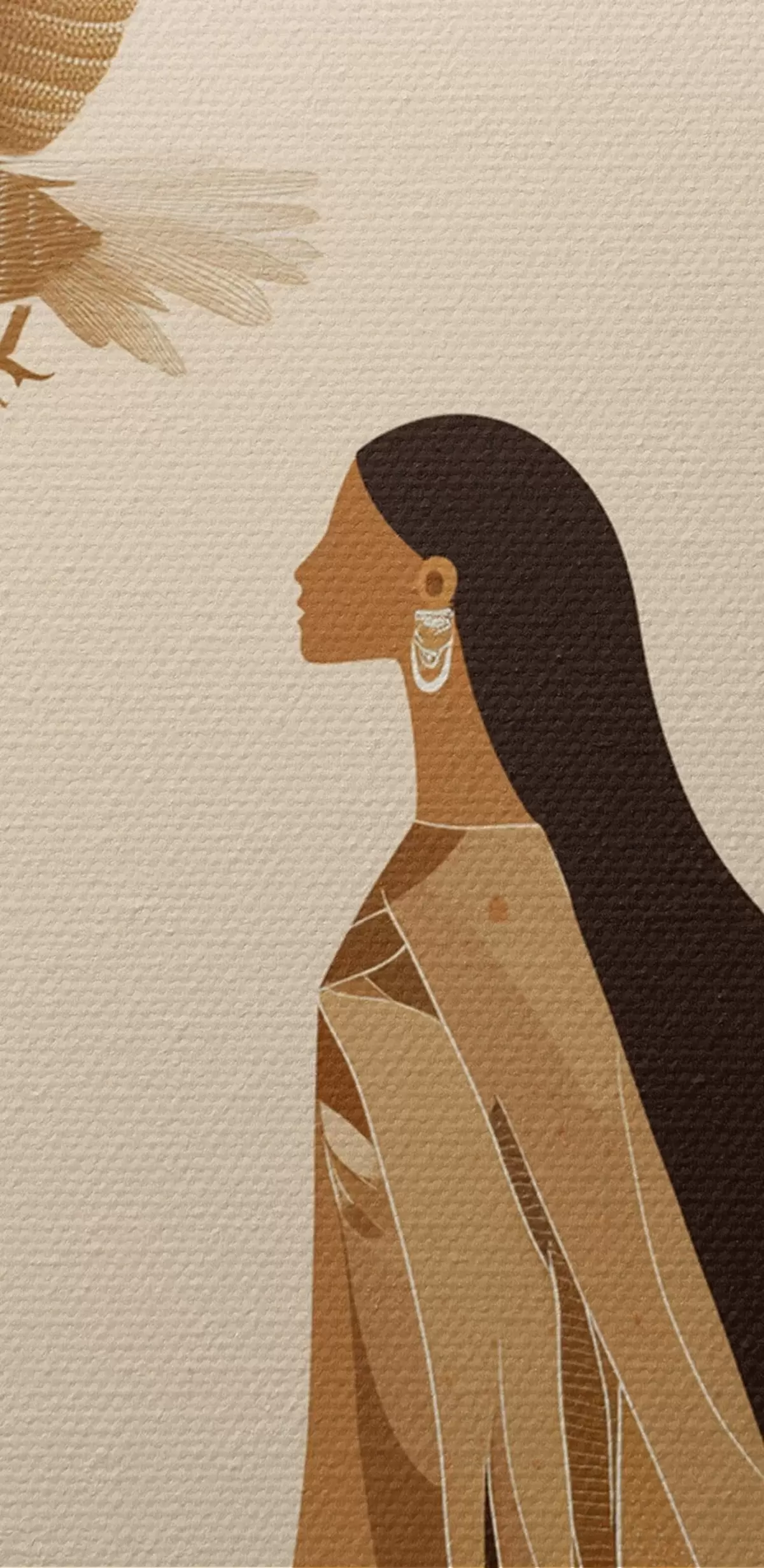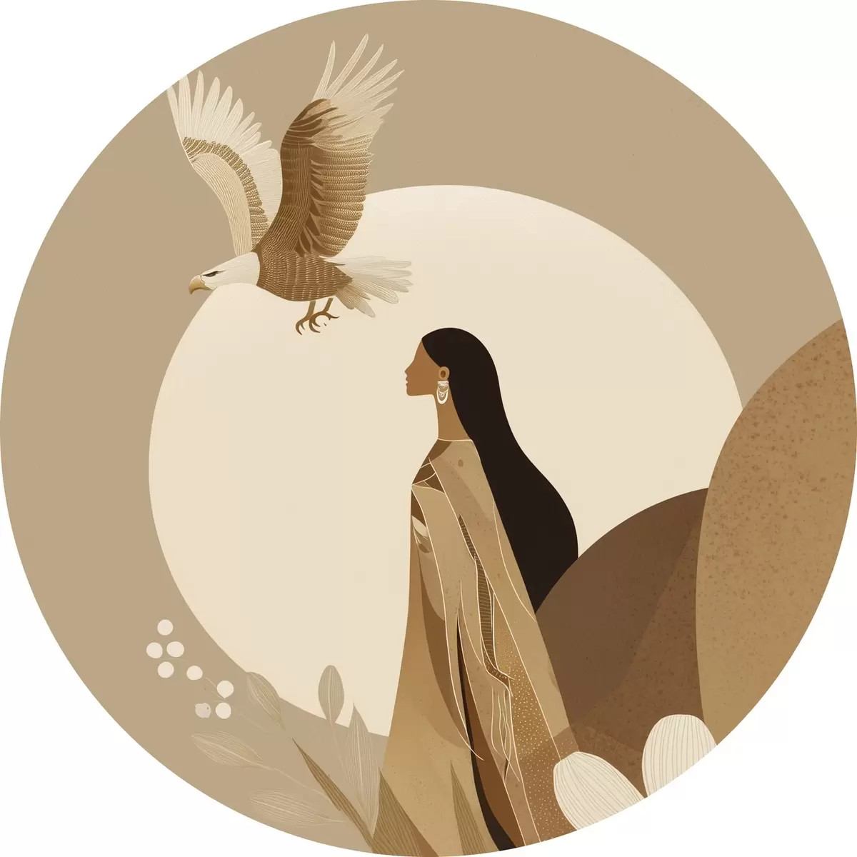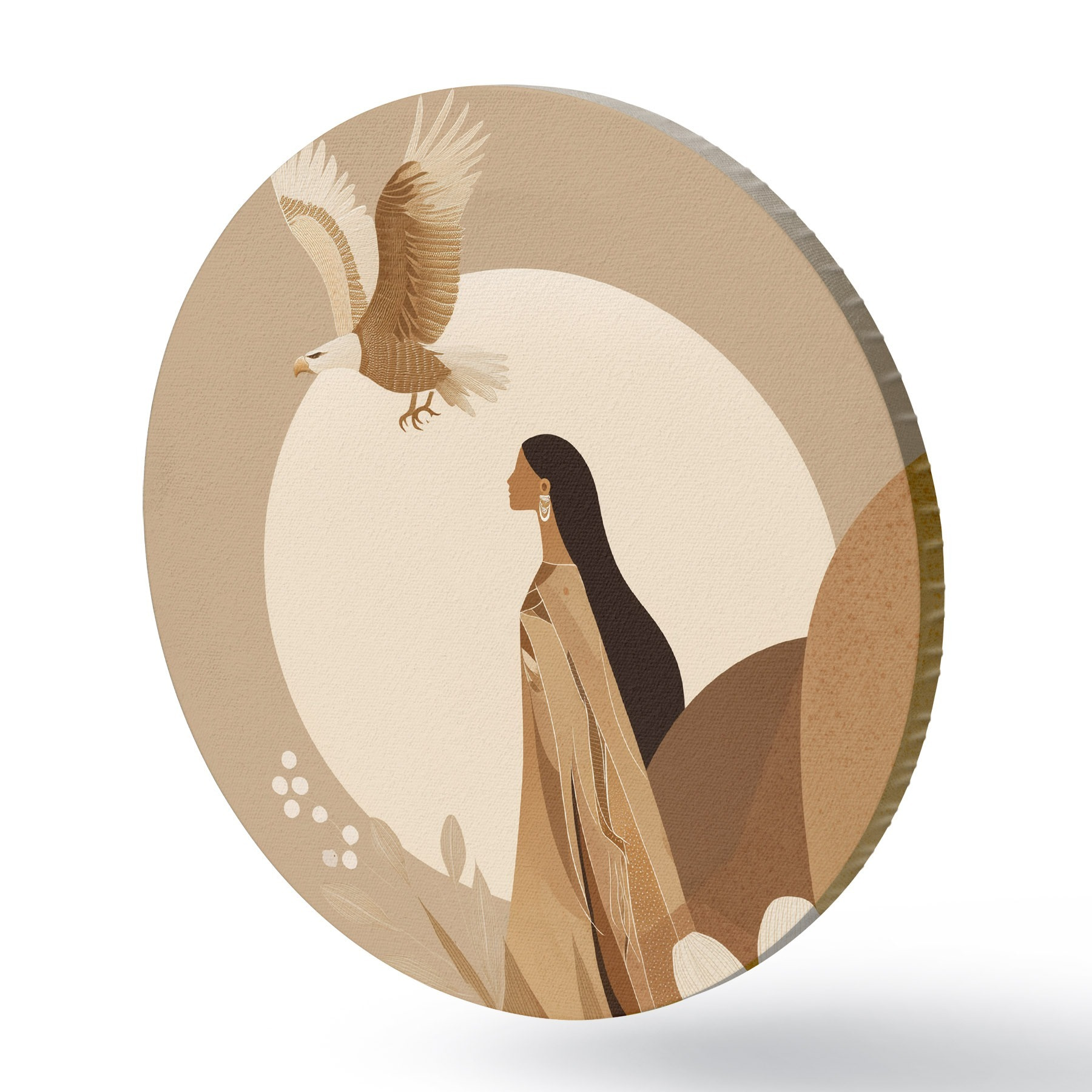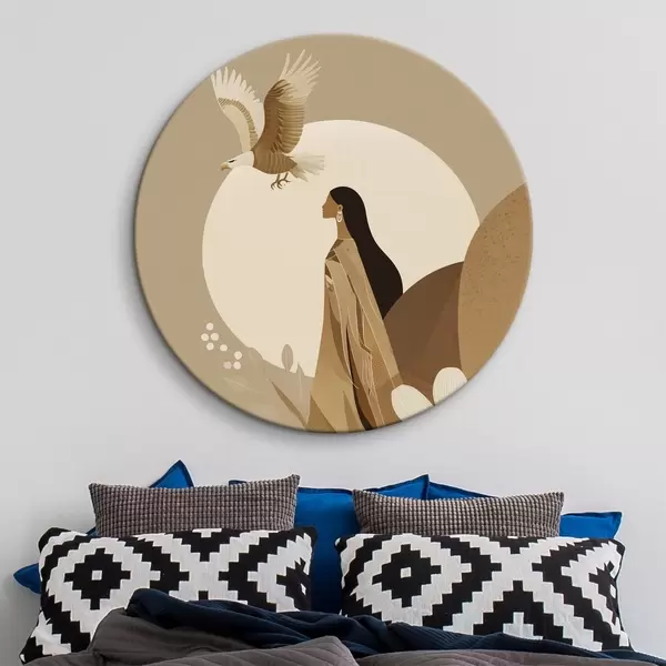 Picturi rotunde Abstracție cu femeie și vultur în cer, culori bej Nr r44978