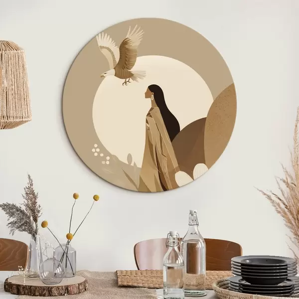 Picturi rotunde Abstracție cu femeie și vultur în cer, culori bej Nr r44978
