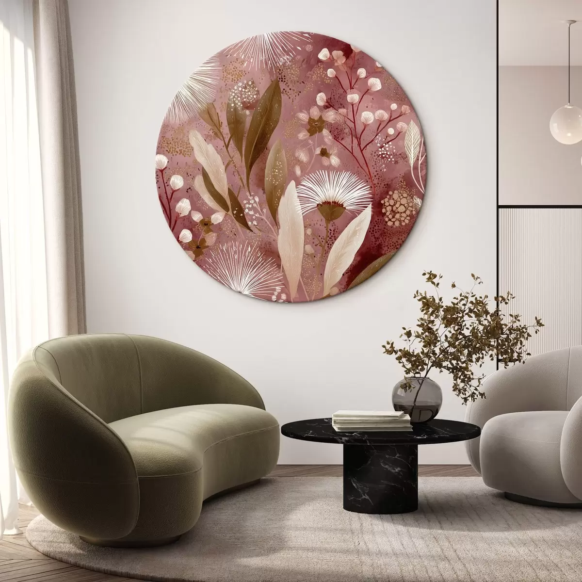 Picturi rotunde Boho stil flori albe pe fundal roșu, desen detaliat r44979