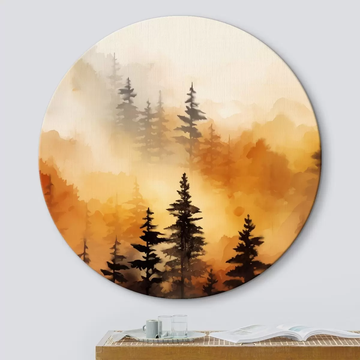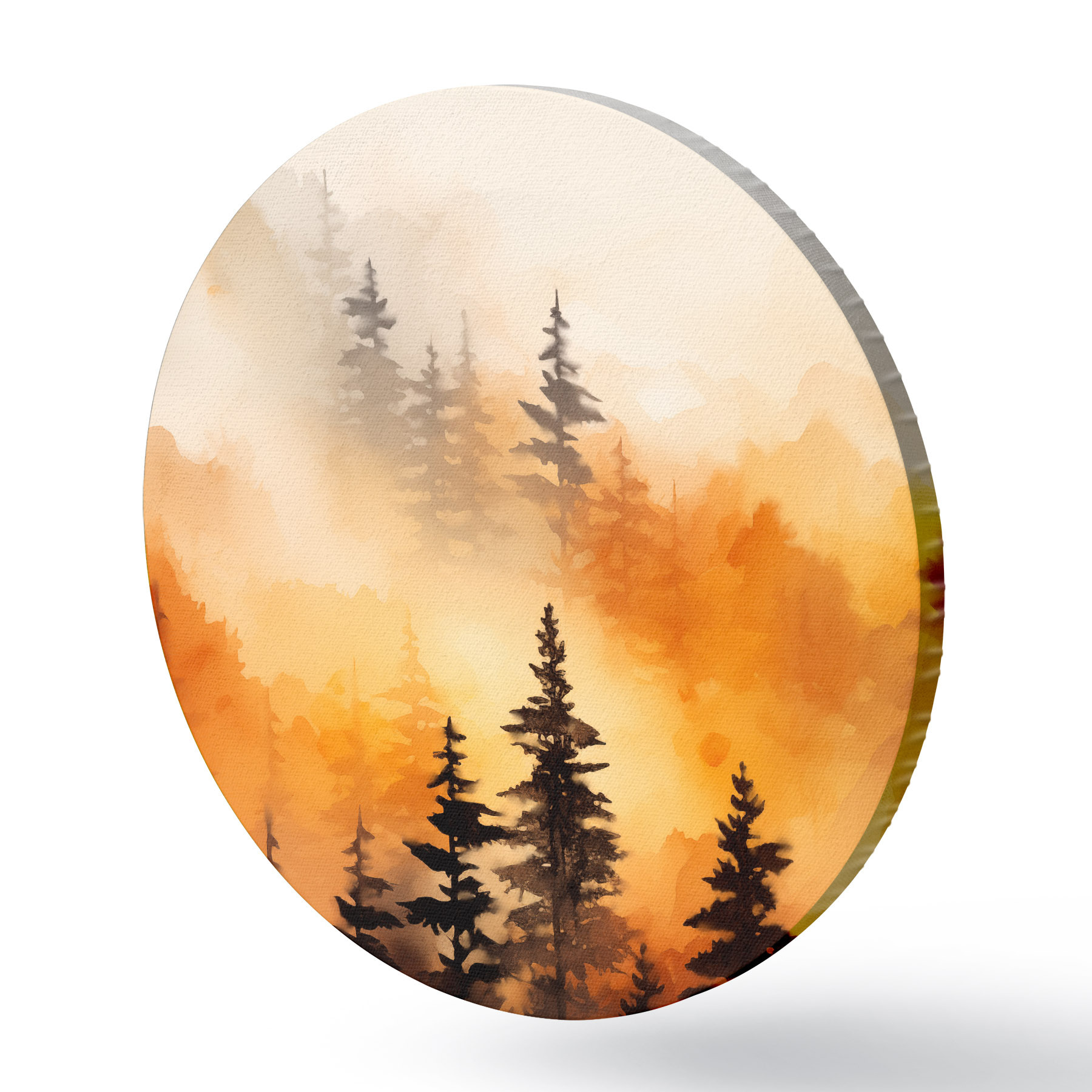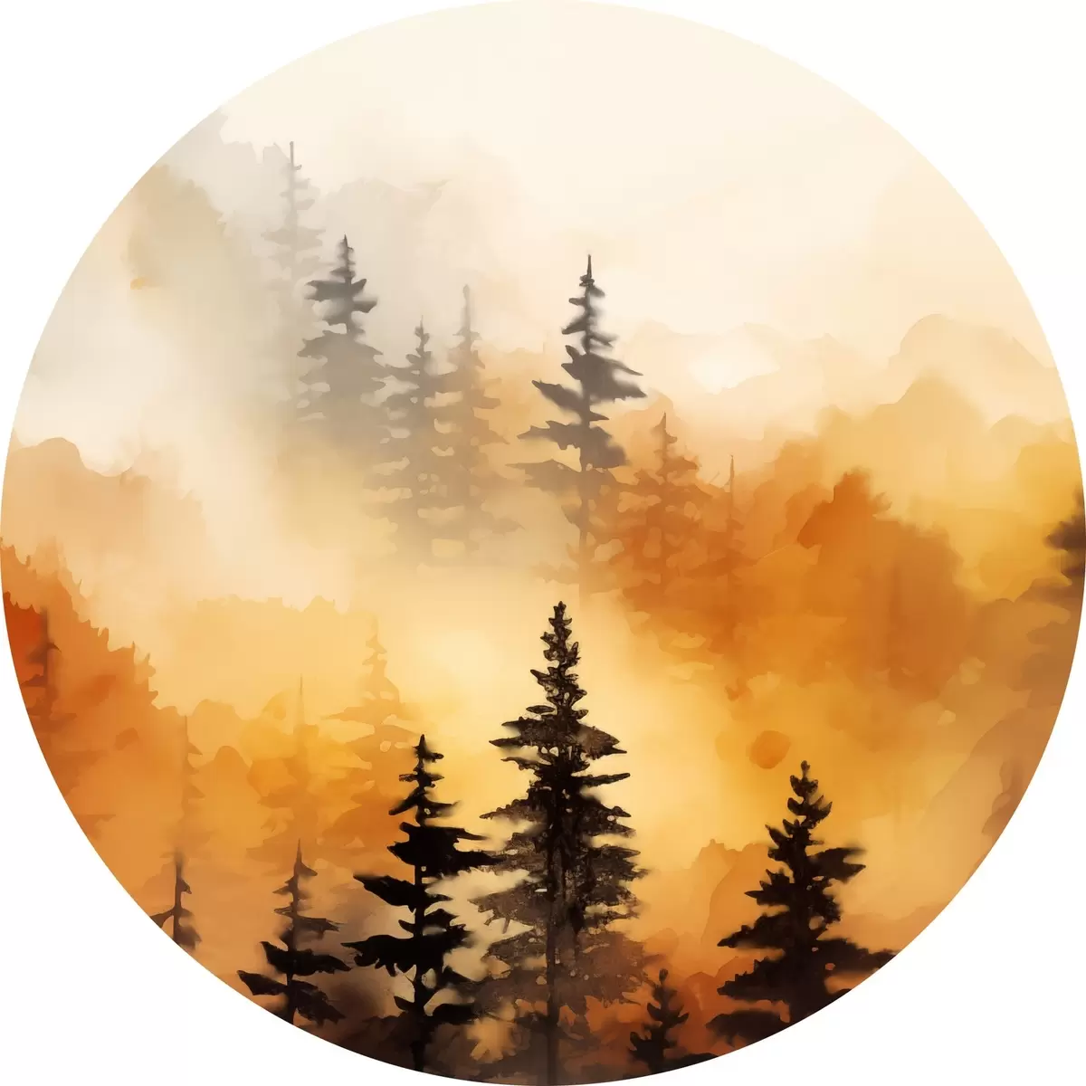 Picturi rotunde O imitație de pictură peisaj acuarelă a unei păduri cu pini înalți și munți în fundal Nr r45170